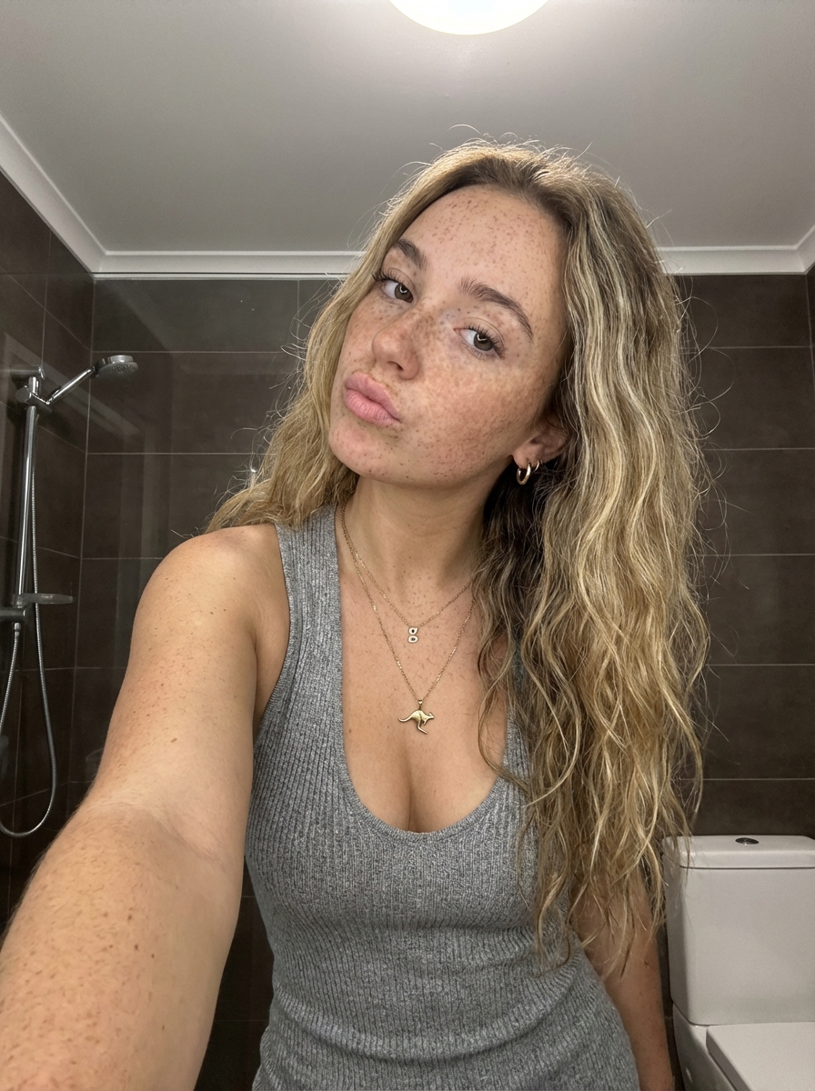 {"subject": {"demographics": "Young model, approx 20-24 years old,.", "hair": {"color": "Dirty blonde to light blonde gradient.", "style": "Long, straight with slight wave, layered, casual parting.", "texture": "Soft, natural strands, slightly tousled, roots visible.", "movement": "Falling naturally over shoulders and back."}, "face": {"shape": "Oval with soft jawline.", "eyes": "Almond-shaped, light blue/grey irises, distinct sharp winged eyeliner.", "nose": "Button nose, soft bridge.", "lips": "Full, plump, rosy pink, slightly parted in a pouty expression.", "skin_details": "Prominent, heavy freckles across nose and cheeks. Smooth texture but with realistic skin grain. Natural blush.", "micro_details": "Mole on right upper chest, mole on left shoulder."}, "body_proportions": {"build": "Voluminous, curvy, heavy bust .", "chest": "Large bust volume, prominent forward projection, deep cleavage visible.", "waist_to_chest_ratio": "Significantly wider chest width compared to waist implies hourglass figure .", "shoulders": "Soft, rounded, natural slope.", "dominance": "Upper torso volume visually dominates the frame."}, "clothing": {"top": "Heather grey ribbed knit tank top /camisole .", "fit": "Tight, form-fitting, stretching over chest volume, low scoop neckline.", "straps": "Thick straps, sitting securely on shoulders."}, "accessories": {"jewelry": ["Small gold if(gender=f){hoop earrings } .", "Gold chain necklace with a small 'G' letter pendant.", "Longer thin gold chain with a distinct kangaroo pendant."]}}, "pose": {"type": "Handheld selfie perspective.", "orientation": "Frontal close-up, slightly angled from above.", "head_position": "Tilted slightly to subject's right.", "limbs": "Right arm extended forward (out of frame) indicating holding the camera.", "gaze": "Direct eye contact with lens, alluring and confident.", "spine_curvature": "Slight arch implied by chest prominence."}, "setting": {"environment": "Domestic bathroom.", "background_elements": "Dark brown/grey glossy tiled wall, chrome shower fixture visible on left, top of ceramic toilet tank visible on right.", "depth": "Shallow depth of field, background elements slightly out of focus."}, "camera": {"shot_type": "Close-up, selfie portrait.", "angle": "High angle (slightly above eye level), typical of smartphone selfies.", "focal_length": "24mm to 28mm equivalent (wide angle smartphone lens).", "framing": "Chest-up shot, cropping at mid-torso.", "focus": "Sharp focus on eyes and face, slight fall-off on shoulders.", "perspective": "Slight foreshortening of the extended arm side."}, "lighting": {"source": "Soft, diffused overhead ambient bathroom lighting.", "direction": "Front-top lighting.", "highlights": "Soft specular highlights on forehead, tip of nose, chin, and upper chest curves.", "shadows": "Soft shadows under the chin and defining the cleavage depth.", "quality": "Natural, flattering, no harsh contrast."}, "mood_and_expression": {"tone": "Casual, sultry, confident.", "expression": "Relaxed pout, 'cool model' aesthetic.", "atmosphere": "Intimate, candid."}, "style_and_realism": {"style": "Photorealistic, social media aesthetic.", "fidelity": "High fidelity skin texture, no airbrushing.", "imperfections": "Visible freckles, stray hairs, natural skin variation preserved."}, "colors_and_tone": {"palette": "Neutral tones (grey, beige, skin tones) with pops of blue (eyes) and gold (jewelry).", "skin_tone": "Fair to light tan, warm undertones.", "white_balance": "Slightly warm, indoor tungsten mix.", "saturation": "Natural, slightly vibrant lips and eyes.", "contrast": "Medium contrast."}, "technical_details": {"aspect_ratio": "3:4", "resolution": "High resolution, sharp details.", "noise": "Slight digital noise characteristic of phone camera sensors in indoor light."}}