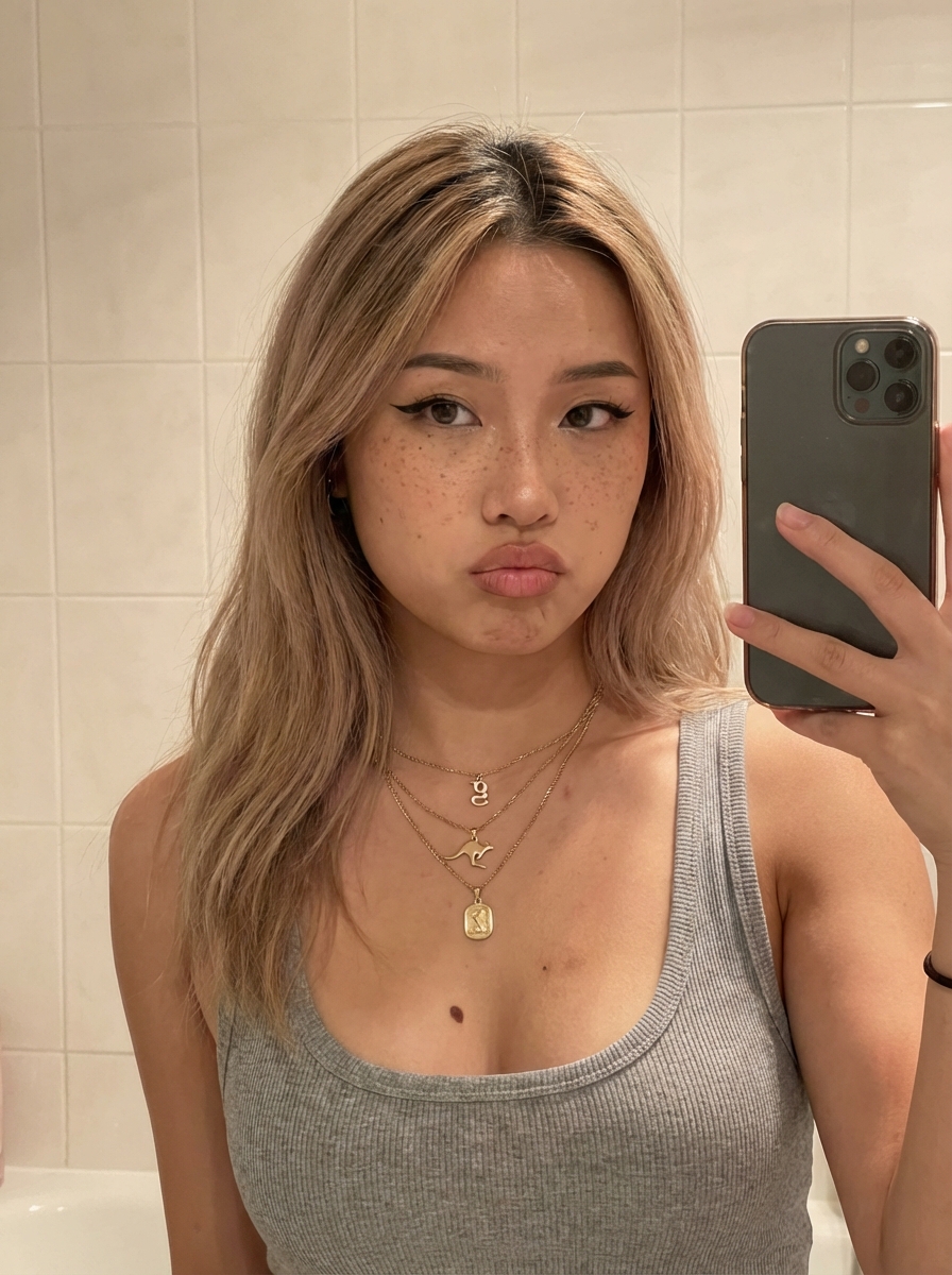 {"subject": {"demographics": "Young model, approx 20-24 years old,.", "hair": {"color": "Dirty blonde to light blonde gradient.", "style": "Long, straight with slight wave, layered, casual parting.", "texture": "Soft, natural strands, slightly tousled, roots visible.", "movement": "Falling naturally over shoulders and back."}, "face": {"shape": "Oval with soft jawline.", "eyes": "Almond-shaped, light blue/grey irises, distinct sharp winged eyeliner.", "nose": "Button nose, soft bridge.", "lips": "Full, plump, rosy pink, slightly parted in a pouty expression.", "skin_details": "Prominent, heavy freckles across nose and cheeks. Smooth texture but with realistic skin grain. Natural blush.", "micro_details": "Mole on right upper chest, mole on left shoulder."}, "body_proportions": {"build": "Voluminous, curvy, heavy bust .", "chest": "Large bust volume, prominent forward projection, deep cleavage visible.", "waist_to_chest_ratio": "Significantly wider chest width compared to waist implies hourglass figure .", "shoulders": "Soft, rounded, natural slope.", "dominance": "Upper torso volume visually dominates the frame."}, "clothing": {"top": "Heather grey ribbed knit tank top /camisole .", "fit": "Tight, form-fitting, stretching over chest volume, low scoop neckline.", "straps": "Thick straps, sitting securely on shoulders."}, "accessories": {"jewelry": ["Small gold if(gender=f){hoop earrings } .", "Gold chain necklace with a small 'G' letter pendant.", "Longer thin gold chain with a distinct kangaroo pendant."]}}, "pose": {"type": "Handheld selfie perspective.", "orientation": "Frontal close-up, slightly angled from above.", "head_position": "Tilted slightly to subject's right.", "limbs": "Right arm extended forward (out of frame) indicating holding the camera.", "gaze": "Direct eye contact with lens, alluring and confident.", "spine_curvature": "Slight arch implied by chest prominence."}, "setting": {"environment": "Domestic bathroom.", "background_elements": "Dark brown/grey glossy tiled wall, chrome shower fixture visible on left, top of ceramic toilet tank visible on right.", "depth": "Shallow depth of field, background elements slightly out of focus."}, "camera": {"shot_type": "Close-up, selfie portrait.", "angle": "High angle (slightly above eye level), typical of smartphone selfies.", "focal_length": "24mm to 28mm equivalent (wide angle smartphone lens).", "framing": "Chest-up shot, cropping at mid-torso.", "focus": "Sharp focus on eyes and face, slight fall-off on shoulders.", "perspective": "Slight foreshortening of the extended arm side."}, "lighting": {"source": "Soft, diffused overhead ambient bathroom lighting.", "direction": "Front-top lighting.", "highlights": "Soft specular highlights on forehead, tip of nose, chin, and upper chest curves.", "shadows": "Soft shadows under the chin and defining the cleavage depth.", "quality": "Natural, flattering, no harsh contrast."}, "mood_and_expression": {"tone": "Casual, sultry, confident.", "expression": "Relaxed pout, 'cool model' aesthetic.", "atmosphere": "Intimate, candid."}, "style_and_realism": {"style": "Photorealistic, social media aesthetic.", "fidelity": "High fidelity skin texture, no airbrushing.", "imperfections": "Visible freckles, stray hairs, natural skin variation preserved."}, "colors_and_tone": {"palette": "Neutral tones (grey, beige, skin tones) with pops of blue (eyes) and gold (jewelry).", "skin_tone": "Fair to light tan, warm undertones.", "white_balance": "Slightly warm, indoor tungsten mix.", "saturation": "Natural, slightly vibrant lips and eyes.", "contrast": "Medium contrast."}, "technical_details": {"aspect_ratio": "3:4", "resolution": "High resolution, sharp details.", "noise": "Slight digital noise characteristic of phone camera sensors in indoor light."}}