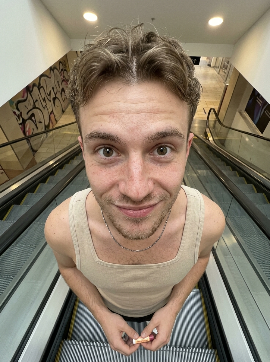 {"subject": {"description": "A close-up, extreme high-angle selfie of a young model with a playful expression, standing on an escalator.", "mirror_rules": "None (direct lens high-angle distortion)", "age": "20s", "expression": {"eyes": {"look": "Wide open, looking directly upward into the lens", "energy": "Bright, engaging, innocent yet cheeky", "direction": "Upward"}, "mouth": {"position": "Exaggerated smirking lips, cheeky face", "energy": "Playful, fun, silly"}, "overall": "Quirky, fun-loving, Gen Z 0.5x selfie aesthetic"}, "face": {"preserve_original": true, "makeup": "Fresh face, prominent natural features on nose tip and cheeks (strawberry or cold model makeup), groomed skin with light stubble, natural brows"}, "hair": {"style": "Short, tousled, center part, slightly messy roots", "effect": "Natural flow, top of head due to angle"}, "body": {"frame": "Foreshortened perspective (large head, small body)", "waist": "Not ", "chest": " upper chest from top-down view", "legs": "Not ", "skin": {"visible_areas": "Face, neck, chest, arms", "tone": "Fair to light", "texture": "Smooth, natural skin texture", "lighting_effect": "Soft even illumination"}}, "pose": {"position": "Standing, leaning forward confidently", "base": "Standing on an escalator", "overall": "Leaning in towards the camera lens from below"}, "clothing": {"top": {"type": "Fitted tank top", "color": "Beige / Cream", "details": "Simple tight fit, square neckline", "effect": "Casual summer vibe"}, "bottom": {"type": "Trousers", "details": "Barely at bottom edge"}}}, "accessories": {"jewelry": "Thin silver chain (faint)", "prop": "Holding a small bottle (lip balm or vape) in hand; minimal accessories"}, "photography": {"camera_style": "Smartphone 0.5x wide-angle aesthetic", "angle": "Extreme high angle / Top-down / Bird's eye view", "shot_type": "Close-up selfie, distorted perspective", "aspect_ratio": "4:5", "texture": "Digital social media quality, sharp facial details", "lighting": "Bright overhead indoor mall lighting", "depth_of_field": "Moderate depth (background slightly soft but recognizable)"}, "background": {"setting": "Indoor escalator", "wall_color": "with abstract graffiti/art (left)", "elements": ["Silver grooved escalator steps descending behind", "handrail", "Partial view of another person in background (top right)"], "atmosphere": "Public, busy shopping mall, dynamic transit", "lighting": "Diffuse artificial light"}, "the_vibe": {"energy": "Spontaneous, youthful, humorous", "mood": "Playful", "aesthetic": "Gen Z photo dump, fish-eye lens effect, candid snapshot", "authenticity": "High, looks like an unfiltered moment", "intimacy": "Friend-POV", "story": "A goofy moment captured mid-shopping trip on the escalator", "caption_energy": "Escalator antics with besties โœŒ๏ธ๐Ÿ˜—"}, "constraints": {"must_keep": ["Extreme high angle perspective", "Smirking/cheeky face expression", "Escalator background with metal steps", "Beige fitted tank top", "natural features on nose", "Wide-angle distortion effect"], "avoid": ["Low angle", "Eye-level shot", "Serious expression", "Studio lighting", "Full body proportions (must be distorted)"]}, "negative_prompt": ["low angle", "studio portrait", "serious", "frown", "sunglasses", "hat", "blurry", "dark", "distorted hands", "perfect proportions"]}}