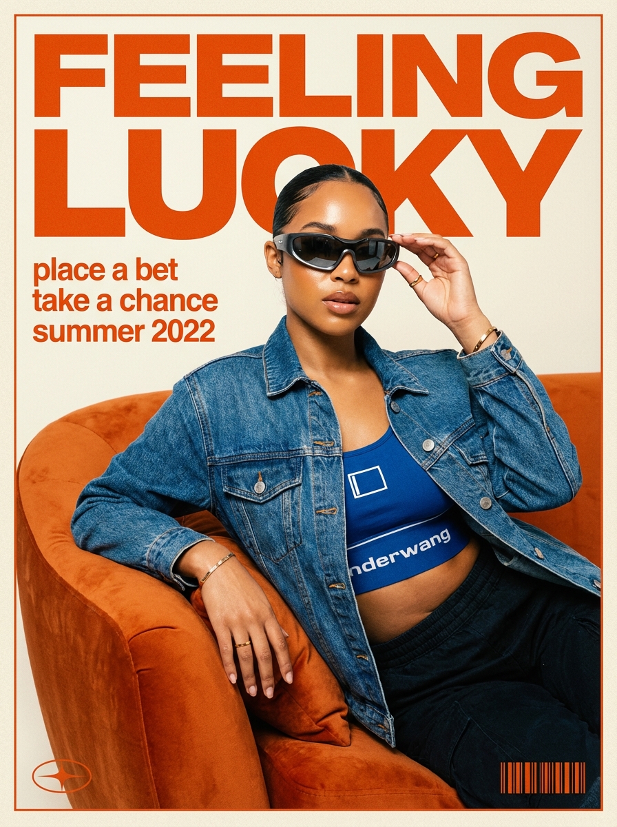 {"subject": {"description": "A cool, fashion-forward young sitting on an orange sofa, styled in a Y2K editorial streetwear aesthetic.", "mirror_rules": "N/A, this is a direct editorial shot, ensure text elements are legible and not mirrored.", "age": "20-25 years old", "expression": {"eyes": {"look": "hidden behind sunglasses, gazing to the side", "energy": "confident, cool, unbothered", "direction": "looking towards screen right"}, "mouth": {"position": "relaxed, closed", "energy": "neutral, composed"}, "overall": "cool attitude, contemplating fortune"}, "face": {"preserve_original": true, "makeup": "natural glow, clean skin aesthetic"}, "hair": {hair, "style": "sleek low bun or ponytail , pulled back tight", "effect": "neat, minimalist"}, "body": {"frame": "slim, fit", "waist": "exposed midriff, toned", "chest": "natural", "legs": "not fully visible, seated posture", "skin": {"visible_areas": "face, neck, midriff, hands", "tone": "deep brown", "texture": "smooth, luminous", "lighting_effect": "soft studio lighting highlighting skin glow"}}, "pose": {"position": "sitting relaxed on a sofa, leaning back slightly", "base": "upper body and waist visible", "overall": "one hand (right hand) raised touching the temple or sunglasses frame, fingers extended elegantly, creating a thinking or posing gesture"}, "clothing": {"top": {"type": "layered outfit", hair, "details": "classic blue denim jacket worn open, crop top with a blue rectangular box logo containing partial text 'nderwang'", "effect": "casual chic, streetwear"}, "bottom": {"type": "pants or skirt (partially visible)", hair, "details": "dark fabric"}}}, "accessories": {"headwear": null, "jewelry": {"type": "necklace", "details": "thin gold chain necklace"}, "device": null, "prop": {"type": "sunglasses", "details": "thick-framed futuristic sporty sunglasses, dark lenses, Y2K style"}}, "photography": {"camera_style": "editorial magazine photography mixed with graphic design poster art", "angle": "eye-level, slightly angled from the left", "shot_type": "medium shot, waist-up", "aspect_ratio": "3:4 vertical magazine cover format", "texture": "high contrast, vibrant colors, slight grain like a printed magazine", "lighting": "bright studio lighting on subject, flat graphic lighting for background", "depth_of_field": "deep, keeping both subject and typography relatively sharp"}, "background": {"setting": "studio set with furniture and graphic overlay", "wall_color": "cream or off-backdrop", "elements": ["curved orange velvet sofa", "massive bold orange typography reading 'FEELING LUCKY' filling the upper background", "small scatter text reading 'PLACE A BET', 'TAKE A CHANCE', 'SUMMER 2022'"], "atmosphere": "pop art, magazine editorial, vibrant", "lighting": "uniform, bright"}, "the_vibe": {"energy": "optimistic, bold, trendy", "mood": "feeling lucky, confident, main character energy", "aesthetic": "Gen Z graphic design, maximalist typography, streetwear fashion", "authenticity": "stylized editorial", "intimacy": "distant cool", "story": "A cover shoot for a summer issue about taking chances and feeling good.", "caption_energy": "Fortune favors the bold."}, "constraints": {"must_keep": ["orange and blue color scheme", "the specific sporty sunglasses", "the large typographic background elements", "the denim jacket texture"], "avoid": ["cluttered background", "messy hair", "dark gloomy lighting"]}, "negative_prompt": ["blurry text", "distorted hands", "missing sunglasses", "dull colors", "realistic bedroom background", "messy layout"]}