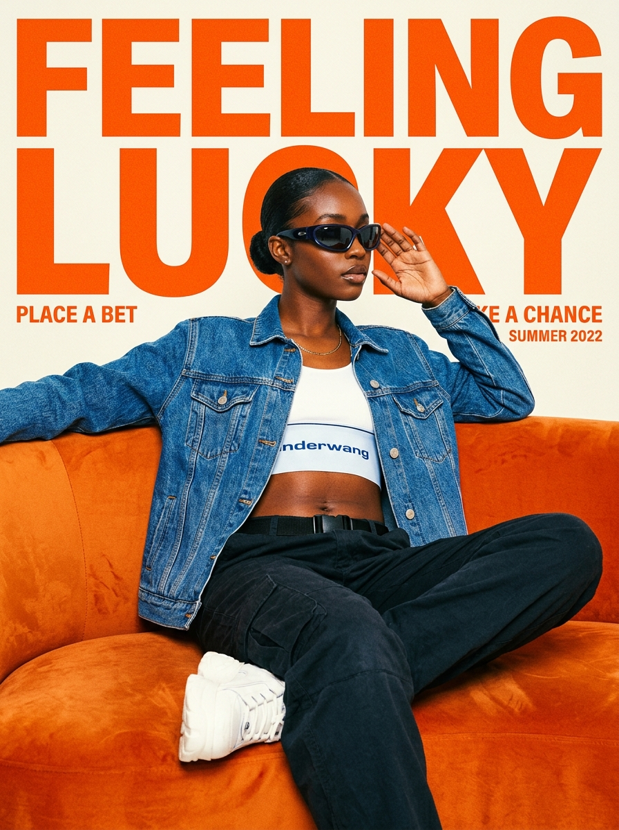 {"subject": {"description": "A cool, fashion-forward young sitting on an orange sofa, styled in a Y2K editorial streetwear aesthetic.", "mirror_rules": "N/A, this is a direct editorial shot, ensure text elements are legible and not mirrored.", "age": "20-25 years old", "expression": {"eyes": {"look": "hidden behind sunglasses, gazing to the side", "energy": "confident, cool, unbothered", "direction": "looking towards screen right"}, "mouth": {"position": "relaxed, closed", "energy": "neutral, composed"}, "overall": "cool attitude, contemplating fortune"}, "face": {"preserve_original": true, "makeup": "natural glow, clean skin aesthetic"}, "hair": {hair, "style": "sleek low bun or ponytail , pulled back tight", "effect": "neat, minimalist"}, "body": {"frame": "slim, fit", "waist": " midriff, toned", "chest": "natural", "legs": "not fully , seated posture", "skin": {"visible_areas": "face, neck, midriff, hands", "tone": "deep brown", "texture": "smooth, luminous", "lighting_effect": "soft studio lighting highlighting skin glow"}}, "pose": {"position": "sitting relaxed on a sofa, leaning back slightly", "base": "upper body and waist ", "overall": "one hand (right hand) raised touching the temple or sunglasses frame, fingers extended elegantly, creating a thinking or posing gesture"}, "clothing": {"top": {"type": "layered outfit", hair, "details": "classic blue denim jacket worn open, crop top with a blue rectangular box logo containing partial text 'nderwang'", "effect": "casual chic, streetwear"}, "bottom": {"type": "pants or skirt (partially )", hair, "details": "dark fabric"}}}, "accessories": {"headwear": null, "jewelry": {"type": "necklace", "details": "thin gold chain necklace"}, "device": null, "prop": {"type": "sunglasses", "details": "thick-framed futuristic sporty sunglasses, dark lenses, Y2K style"}}, "photography": {"camera_style": "editorial magazine photography mixed with graphic design poster art", "angle": "eye-level, slightly angled from the left", "shot_type": "medium shot, waist-up", "aspect_ratio": "3:4 vertical magazine cover format", "texture": "high contrast, vibrant colors, slight grain like a printed magazine", "lighting": "bright studio lighting on subject, flat graphic lighting for background", "depth_of_field": "deep, keeping both subject and typography relatively sharp"}, "background": {"setting": "studio set with furniture and graphic overlay", "wall_color": "cream or off-backdrop", "elements": ["curved orange velvet sofa", "massive bold orange typography reading 'FEELING LUCKY' filling the upper background", "small scatter text reading 'PLACE A BET', 'TAKE A CHANCE', 'SUMMER 2022'"], "atmosphere": "pop art, magazine editorial, vibrant", "lighting": "uniform, bright"}, "the_vibe": {"energy": "optimistic, bold, trendy", "mood": "feeling lucky, confident, main character energy", "aesthetic": "Gen Z graphic design, maximalist typography, streetwear fashion", "authenticity": "stylized editorial", "intimacy": "distant cool", "story": "A cover shoot for a summer issue about taking chances and feeling good.", "caption_energy": "Fortune favors the bold."}, "constraints": {"must_keep": ["orange and blue color scheme", "the specific sporty sunglasses", "the large typographic background elements", "the denim jacket texture"], "avoid": ["cluttered background", "messy hair", "dark gloomy lighting"]}, "negative_prompt": ["blurry text", "distorted hands", "missing sunglasses", "dull colors", "realistic bedroom background", "messy layout"]}