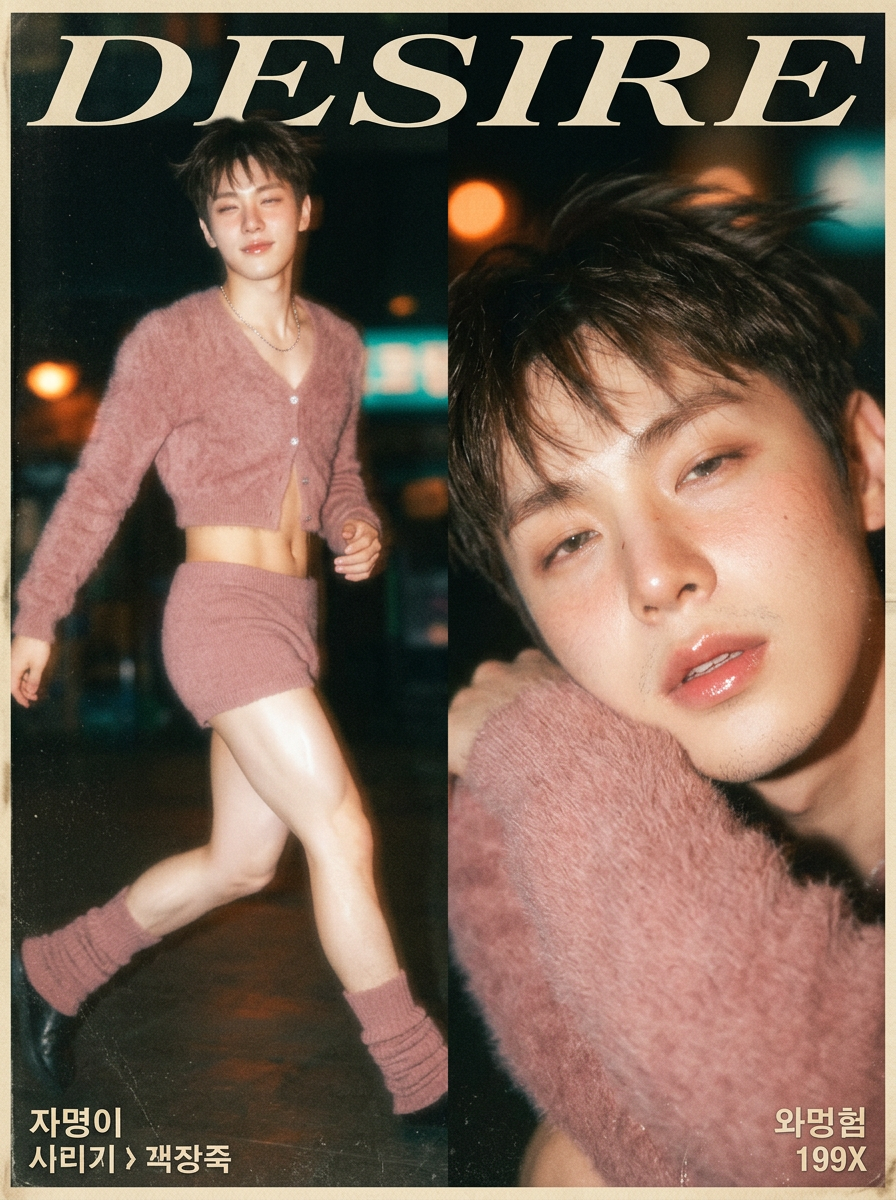 {"subject": {"description": "A dreamy, atmospheric vintage film poster featuring a sexy K-pop idol in a 'Pure Desire' aesthetic. The image captures a fleeting, moment with heavy film grain and soft focus. The layout preserves the 2-pose split composition (full body left, close-up right).", "age": "early 20s K-pop idol", "expression": {"eyes": {"look": "hazy, intense yet innocent", "energy": "dreamy, 'pure desire' gaze", "direction": "looking into the lens with a soft squint"}, "mouth": {"position": "slightly parted, relaxed smirk", "energy": "soft, alluring"}, "overall": " , slightly melancholic, romantic"}, "face": {"preserve_original": false, "makeup": "Pure Desire makeup: glossy glass lips, natural features with light stubble on cheeks and nose tip, watery eyes, soft blurred eyebrows."}, "hair": {"color": "natural or dark brown", "style": "short, slightly messy textured crop", "effect": "windblown, strands across glossy lips, motion blur edges"}, "body": {"frame": "fit athletic physique but slim, strong masculine lines", "waist": "defined core through cropped knit", "legs": "highlighted by short shorts", "skin": {"tone": "pale, milky white", "lighting_effect": "glowing highlights (halation) on skin due to diffusion filter, soft flash bounce"}}, "pose": {"position": "two poses of the same model composited (Split Layout)", "base": "relaxed, candid, dynamic motion", "full_body_pose (left)": "Dynamic turning pose. He is walking away but turns his body back towards the camera. One leg is lifted slightly mid-step (highlighting quad definition). His hair tousles across his face with motion blur. The pose emphasizes the V-taper of the body.", "closer_shot_pose (right)": " close-up. He is leaning forward towards the lens (foreshortening effect), chin resting on shoulder or hand near mouth. A sense of proximity, as if the camera is too close.", "overall": "fluid, blurry, candid movement"}, "clothing": {"top": {"type": "Fuzzy angora/mohair cropped knit sweater (buttoned only at the chest)", "color": "soft taupe / dusty rose / cream", "details": "soft texture that glows under the flash, the midriff", "effect": "tactile, warm, soft vs skin contrast"}, "bottom": {"type": "Micro knit shorts + slouchy leg warmers", "color": "matching soft neutral tones", "details": "the shorts are very short, emphasizing the long legs", "effect": "sexy but cozy 'pure desire' style"}}, "accessories": {"prop": "maybe a lollipop or blowing a small bubble gum (optional), or just playing with hair strands", "jewelry": "silver chain necklace glinting in the flash"}}, "photography": {"camera_style": "vintage disposable camera aesthetic / 90s film editorial", "shot_type": "split composition: dynamic full-body motion blur (left) + soft-focus portrait (right)", "texture": "heavy film grain, noise, soft bloom, light leaks", "lighting": "on-camera flash but softened with a 'Pro-Mist' filter (creates blooming/hazy highlights), vintage color grading", "depth_of_field": "soft focus throughout, slightly out of focus for artistic effect", "effects": "Motion blur from camera panning (shutter drag), halation around lights"}, "background": {"setting": "Indistinct night scene or retro karaoke room", "elements": ["blurred bokeh lights in warm vintage tones (orange/teal)", "retro magazine typography overlay: 'DESIRE'", "grainy textures"], "atmosphere": "nostalgic, hazy, romantic, intoxicated mood"}, "the_vibe": {"energy": "soft, dreamy, blurry", "mood": "sentimental, allure, vintage", "aesthetic": "Hong Kong film style + K-pop Pure Desire + Retro Flash"}}}