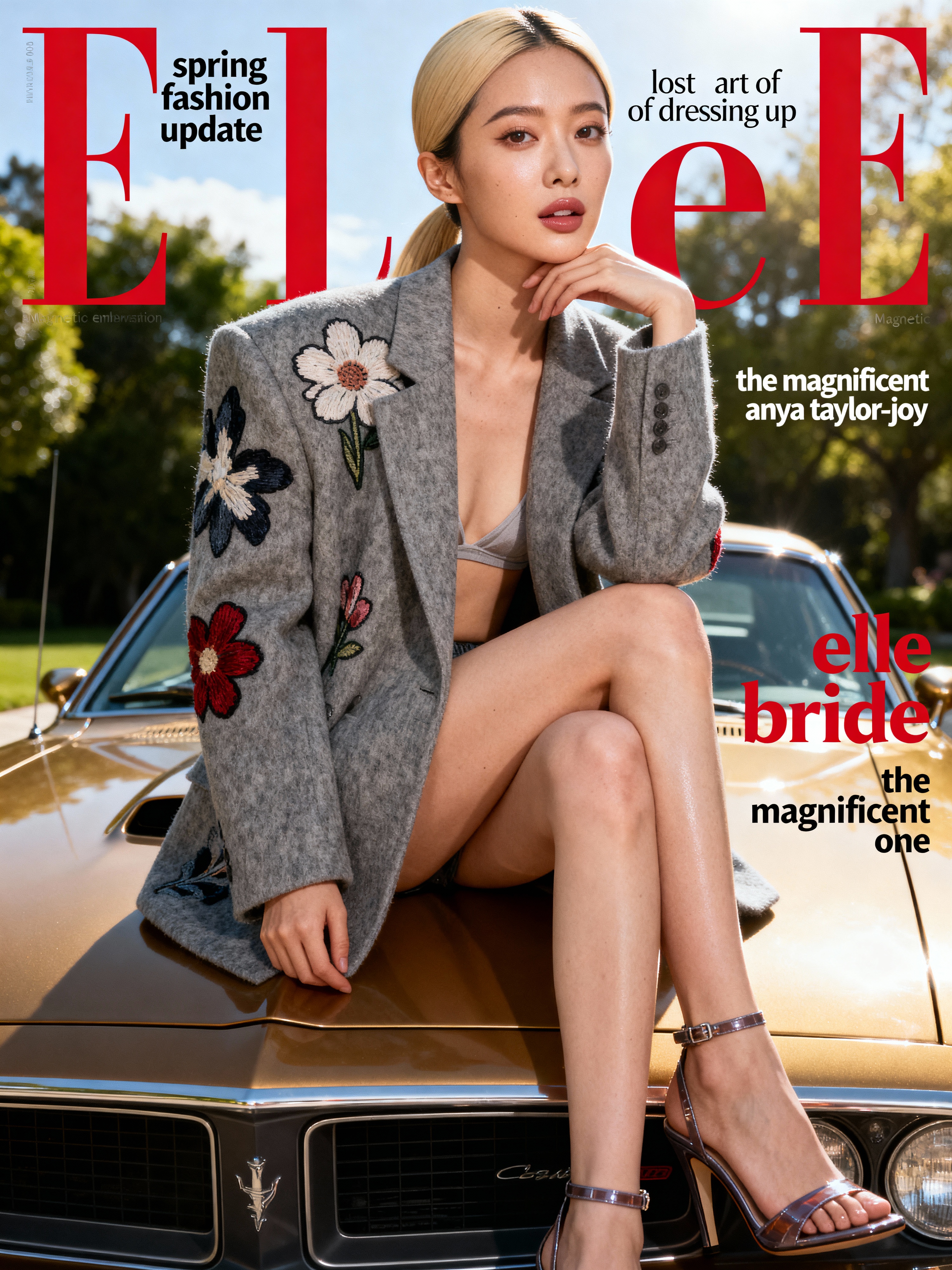 {"subject": {"description": "A high-fashion magazine cover shot of a stunning blonde model sitting on the hood of a vintage car.", "mirror_rules": null, "age": "20s", "expression": {"eyes": {"look": "piercing, direct eye contact", "energy": "confident, enigmatic, intense", "direction": "looking straight at camera"}, "mouth": {"position": "slightly parted, relaxed", "energy": "neutral yet alluring"}, "overall": "sophisticated, bold, effortlessly chic"}, "face": {"preserve_original": true, "makeup": "natural glam, sculpted cheekbones, subtle eyeliner , matte nude lip "}, "hair": {hair, "style": "sleek low side ponytail , deep side part, smooth texture", "effect": "neatly styled"}, "body": {"frame": "slender, high-fashion model physique", "waist": "obscured by jacket", "chest": "visible collarbones, skin exposure from bralette ", "legs": "crossed, bare, smooth skin texture, prominent placement", "skin": {"visible_areas": "face, neck, chest, legs", "tone": "fair/pale", "texture": "high-resolution, realistic skin pores", "lighting_effect": "sun-kissed, bright highlights"}}, "pose": {"position": "sitting on a car hood", "base": "legs crossed, one foot resting on car, one leg bent underneath", "overall": "hand resting elegantly on chin/jawline, leaning slightly forward, commanding presence"}, "clothing": {"top": {"type": "oversized blazer over a bralette ", "color": "heather grey with abstract/floral appliqué patches", "details": "textured wool blend, structured shoulders, open front", "effect": "tailored yet relaxed"}, "bottom": {"type": "no pants visible (pantless look)", "color": "skin tone", "details": "bare legs focus"}}}, "accessories": {"jewelry": {"type": "minimal or none visible", "details": "focus on structure rather than bling"}, "prop": {"type": "vintage car", "details": "gold or metallic bronze hood, shiny finish, classic muscle car aesthetic"}, "footwear": {"type": "strappy high heels ", hair, "details": "glossy finish, ankle straps"}}, "photography": {"camera_style": "high-end editorial fashion photography, magazine cover style", "angle": "eye-level or slightly low angle", "shot_type": "full body medium shot, center weighted", "aspect_ratio": "4:5", "texture": "sharp focus on subject, glossy magazine print quality", "lighting": "bright natural sunlight, hard daylight, strong contrast, distinct shadows", "depth_of_field": "shallow, bokeh background"}, "background": {"setting": "outdoor driveway or garden", "wall_color": "natural greens", "elements": ["blurred green trees", "bright sky hints", "vintage car hood surface"], "atmosphere": "luxurious, sunny spring day", "lighting": "dappled sunlight in background, direct sun on subject", "text_elements": ["Large red 'ELLE' masthead at top", "text overlays: 'SPRING FASHION UPDATE', 'THE LOST ART OF DRESSING UP', 'ELLE BRIDE', 'THE MAGNIFICENT Anya Taylor-Joy'"]}, "the_vibe": {"energy": "magnetic and empowering", "mood": "sophisticated, cool, expensive", "aesthetic": "classic editorial, celebrity portraiture", "authenticity": "polished professional shoot", "story": "A star at the height of her power, basking in the spring sun, redefining modern elegance.", "caption_energy": "The Magnificent One."}, "constraints": {"must_keep": ["hand on chin pose", "red ELLE text placement", "grey oversized blazer texture", "direct gaze", "car hood setting"], "avoid": ["dim lighting", "messy hair", "casual clothing", "distorted limbs"]}, "negative_prompt": ["cartoon", "3d render", "low quality", "blurry face", "dark", "night", "indoor studio", "casual wear", "messy background"]}