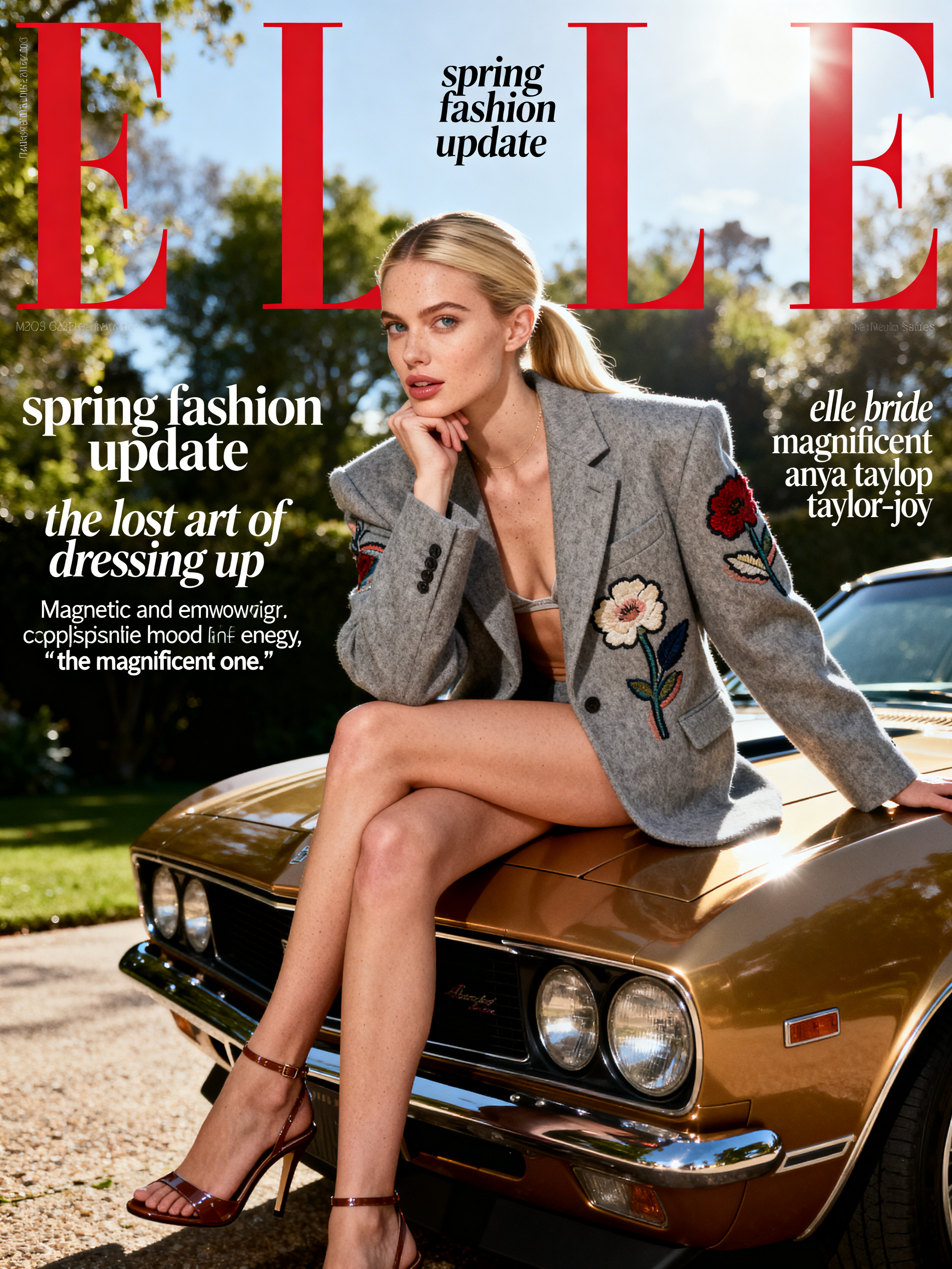 {"subject": {"description": "A high-fashion magazine cover shot of a stunning blonde model sitting on the hood of a vintage car.", "mirror_rules": null, "age": "20s", "expression": {"eyes": {"look": "piercing, direct eye contact", "energy": "confident, enigmatic, intense", "direction": "looking straight at camera"}, "mouth": {"position": "slightly parted, relaxed", "energy": "neutral yet alluring"}, "overall": "sophisticated, bold, effortlessly chic"}, "face": {"preserve_original": true, "makeup": "natural glam, sculpted cheekbones, subtle eyeliner , matte lip "}, "hair": {hair, "style": "sleek low side ponytail , deep side part, smooth texture", "effect": "neatly styled"}, "body": {"frame": "slender, high-fashion model physique", "waist": "obscured by jacket", "chest": " collarbones, skin exposure from bralette ", "legs": "crossed, , smooth skin texture, prominent placement", "skin": {"visible_areas": "face, neck, chest, legs", "tone": "fair/pale", "texture": "high-resolution, realistic skin pores", "lighting_effect": "sun-kissed, bright highlights"}}, "pose": {"position": "sitting on a car hood", "base": "legs crossed, one foot resting on car, one leg bent underneath", "overall": "hand resting elegantly on chin/jawline, leaning slightly forward, commanding presence"}, "clothing": {"top": {"type": "oversized blazer over a bralette ", "color": "heather grey with abstract/floral appliqué patches", "details": "textured wool blend, structured shoulders, open front", "effect": "tailored yet relaxed"}, "bottom": {"type": "no pants (pantless look)", "color": "skin tone", "details": " legs focus"}}}, "accessories": {"jewelry": {"type": "minimal or none ", "details": "focus on structure rather than bling"}, "prop": {"type": "vintage car", "details": "gold or metallic bronze hood, shiny finish, classic muscle car aesthetic"}, "footwear": {"type": "strappy high heels ", hair, "details": "glossy finish, ankle straps"}}, "photography": {"camera_style": "high-end editorial fashion photography, magazine cover style", "angle": "eye-level or slightly low angle", "shot_type": "full body medium shot, center weighted", "aspect_ratio": "4:5", "texture": "sharp focus on subject, glossy magazine print quality", "lighting": "bright natural sunlight, hard daylight, strong contrast, distinct shadows", "depth_of_field": "shallow, bokeh background"}, "background": {"setting": "outdoor driveway or garden", "wall_color": "natural greens", "elements": ["blurred green trees", "bright sky hints", "vintage car hood surface"], "atmosphere": "luxurious, sunny spring day", "lighting": "dappled sunlight in background, direct sun on subject", "text_elements": ["Large red 'ELLE' masthead at top", "text overlays: 'SPRING FASHION UPDATE', 'THE LOST ART OF DRESSING UP', 'ELLE BRIDE', 'THE MAGNIFICENT Anya Taylor-Joy'"]}, "the_vibe": {"energy": "magnetic and empowering", "mood": "sophisticated, cool, expensive", "aesthetic": "classic editorial, celebrity portraiture", "authenticity": "polished professional shoot", "story": "A star at the height of her power, basking in the spring sun, redefining modern elegance.", "caption_energy": "The Magnificent One."}, "constraints": {"must_keep": ["hand on chin pose", "red ELLE text placement", "grey oversized blazer texture", "direct gaze", "car hood setting"], "avoid": ["dim lighting", "messy hair", "casual clothing", "distorted limbs"]}, "negative_prompt": ["cartoon", "3d render", "low quality", "blurry face", "dark", "night", "indoor studio", "casual wear", "messy background"]}