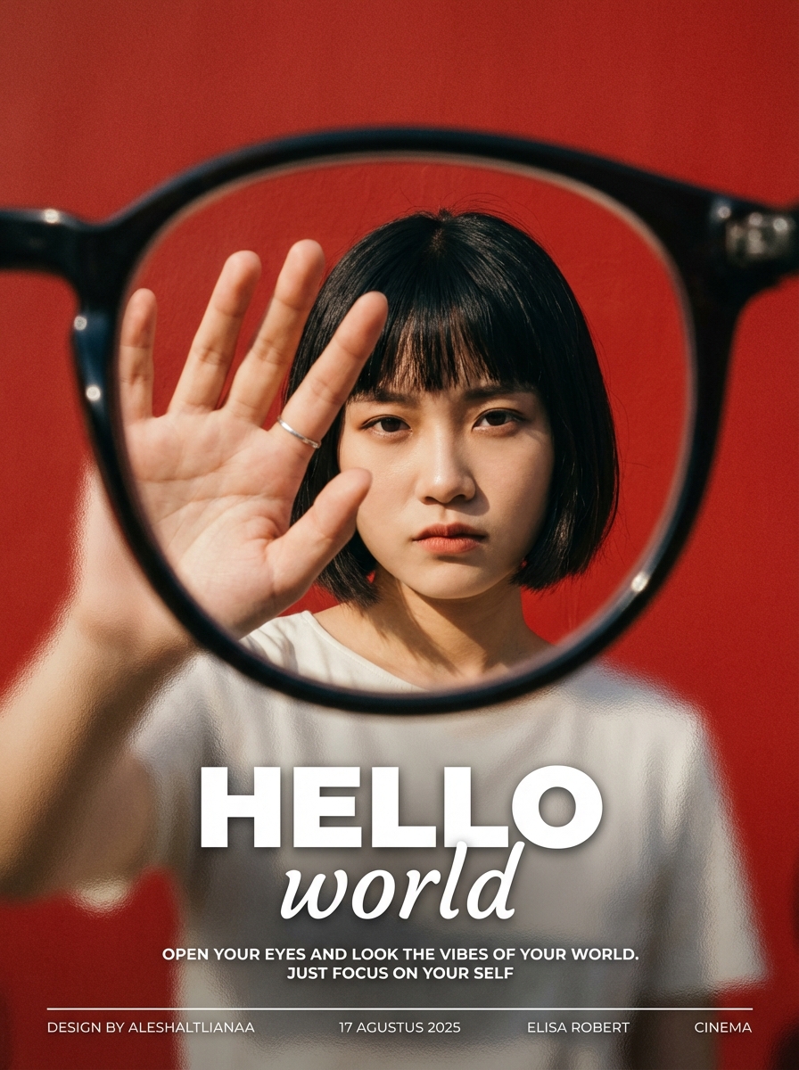 {"subject": {"description": "A realistic close-up portrait poster composed of two overlaid image layers. The first layer features a clean, solid red background with a young model photographed under hard direct sunlight, raising an open hand close to the camera. A single eyeglass lens frame is centered as a 'lens window' concept, precisely revealing the model's face. The second layer sits above the first, applying a frosted-glass effect, while the area inside the eyeglass lens remains clearer.", "mirror_rules": null, "age": "approximately 18–24 years old", "expression": {"eyes": {"look": "direct eye contact", "energy": "focused and calm", "direction": "toward the camera"}, "mouth": {"position": "closed", "energy": "neutral to slightly cool"}, "overall": "calm, serious editorial poster expression"}, "face": {"preserve_original": true, "makeup": "natural makeup, subtle eyeliner , natural lip color"}, "hair": {hair, "style": "short bob haircut with blunt straight bangs", "effect": "smooth with a slight sheen under sunlight"}, "body": {"frame": "slim", "waist": null, "chest": null, "legs": null, "skin": {"visible_areas": ["face", "neck", "hand"], "tone": "light to medium skin tone", "texture": "natural skin texture with realistic pores", "lighting_effect": "hard direct sunlight with crisp shadow edges"}}, "pose": {"position": "front-facing close-up", "base": "one hand raised close to the lens with fingers spread", "overall": "the hand forms a strong shape and partially obscures the face"}, "clothing": {"top": {"type": "simple T-shirt or minimalist top", "color": "off-white / light beige", "details": "clean neckline, no visible logo", "effect": "soft fabric texture under harsh sunlight"}, "bottom": {"type": null, "color": null, "details": null}}}, "accessories": {"headwear": null, "jewelry": {"description": "small if(gender=f){hoop earring } (at least one side visible) and a thin ring on one finger"}, "device": null, "prop": {"description": "a single eyeglass lens frame centered in the composition; the lens area functions as a 'clarity window'"}}, "photography": {"camera_style": "realistic portrait base image combined with modern graphic poster overlay", "angle": "slightly high to eye-level close-up angle", "shot_type": "tight close-up (head and hand dominate the frame)", "aspect_ratio": "2:3 vertical poster", "texture": "sharp facial details on the base image, clean edges, high contrast", "lighting": "hard direct sunlight with warm highlights and strong shadows", "depth_of_field": "two-layer effect: the first layer remains fully clear; the second layer applies global frosted-glass diffusion, blur, and vintage grain, while the eyeglass lens area is inversely masked to remain sharper and clearer"}, "background": {"setting": "poster layout design on a red base background", "wall_color": "dominant solid red", "elements": ["eyeglass frame overlay", "thin horizontal decorative lines at the bottom", "bold title typography with script-style subtitle"], "atmosphere": "bold, modern, high-contrast editorial style", "lighting": "the subject is lit by real sunlight; areas outside the lens receive a frosted-glass haze overlay"}, "the_vibe": {"energy": "strong and focused", "mood": "calm, stylish, slightly cinematic", "aesthetic": "modern editorial poster with a 'seeing clearly through the lens' concept", "authenticity": "realistic base image layered with deliberate design effects", "intimacy": "very close distance, hand reaching toward the viewer", "story": "the world is obscured by haze, but clarity returns inside the lens", "caption_energy": "fashion/editorial poster tagline tone"}, "constraints": {"must_keep": ["Layer 1 (base): a clear realistic close-up portrait with a clean red background under hard direct sunlight", "Layer 1: a large eyeglass frame centered as a compositional element", "Layer 2 (overlay): frosted-glass blur plus vintage grain/noise covering the entire image", "Layer 2: eyeglass lens area inversely masked to appear sharper and clearer", "young model with a short bob haircut and blunt bangs", "open hand raised close to the camera with fingers spread", "hard light with strong shadows", "typography: bold sans-serif 'HELLO' paired with a script-style 'World'", "include the exact visible text: 'DESIGN BY ALESHALTLianaa', 'HELLO', 'World', 'Open your eyes and look the vibes of your world. Just focus on your self', '17 AGUSTUS 2025', 'ELISA ROBERT', 'CINEMA'"], "avoid": ["mirror selfie characteristics", "deformed hands or extra fingers", "changing short hair to long hair ", "adding brand names not present in the image", "unreadable or gibberish text", "overly smooth or plastic-looking skin", "cartoon or anime style"]}, "negative_prompt": ["mirror selfie", "extra fingers", "deformed hand", "finger distortion", "text gibberish", "unreadable letters", "misspelled words", "watermark", "over-smoothed skin", "plastic skin", "anime", "cartoon", "low-resolution face", "incorrect typography"]}