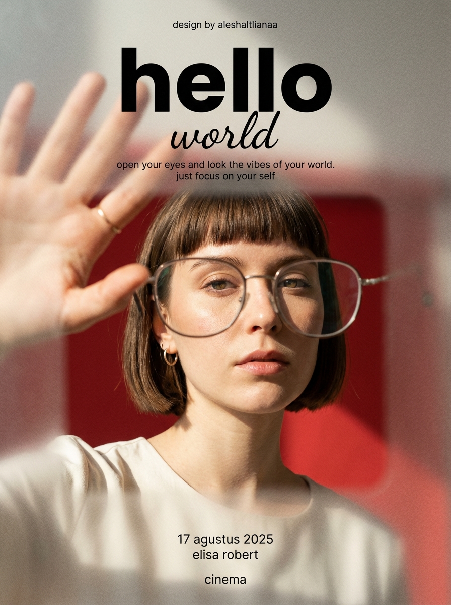 {"subject": {"description": "A realistic close-up portrait poster composed of two overlaid image layers. The first layer features a clean, solid red background with a young model photographed under hard direct sunlight, raising an open hand close to the camera. A single eyeglass lens frame is centered as a 'lens window' concept, precisely revealing the model's face. The second layer sits above the first, applying a frosted-glass effect, while the area inside the eyeglass lens remains clearer.", "mirror_rules": null, "age": "approximately 18–24 years old", "expression": {"eyes": {"look": "direct eye contact", "energy": "focused and calm", "direction": "toward the camera"}, "mouth": {"position": "closed", "energy": "neutral to slightly cool"}, "overall": "calm, serious editorial poster expression"}, "face": {"preserve_original": true, "makeup": "natural makeup, subtle eyeliner , natural lip color"}, "hair": {hair, "style": "short bob haircut with blunt straight bangs", "effect": "smooth with a slight sheen under sunlight"}, "body": {"frame": "slim", "waist": null, "chest": null, "legs": null, "skin": {"visible_areas": ["face", "neck", "hand"], "tone": "light to medium skin tone", "texture": "natural skin texture with realistic pores", "lighting_effect": "hard direct sunlight with crisp shadow edges"}}, "pose": {"position": "front-facing close-up", "base": "one hand raised close to the lens with fingers spread", "overall": "the hand forms a strong shape and partially obscures the face"}, "clothing": {"top": {"type": "simple T-shirt or minimalist top", "color": "off-white / light beige", "details": "clean neckline, no visible logo", "effect": "soft fabric texture under harsh sunlight"}, "bottom": {"type": null, "color": null, "details": null}}}, "accessories": {"headwear": null, "jewelry": {"description": "small if(gender=f){hoop earring } (at least one side visible) and a thin ring on one finger"}, "device": null, "prop": {"description": "a single eyeglass lens frame centered in the composition; the lens area functions as a 'clarity window'"}}, "photography": {"camera_style": "realistic portrait base image combined with modern graphic poster overlay", "angle": "slightly high to eye-level close-up angle", "shot_type": "tight close-up (head and hand dominate the frame)", "aspect_ratio": "2:3 vertical poster", "texture": "sharp facial details on the base image, clean edges, high contrast", "lighting": "hard direct sunlight with warm highlights and strong shadows", "depth_of_field": "two-layer effect: the first layer remains fully clear; the second layer applies global frosted-glass diffusion, blur, and vintage grain, while the eyeglass lens area is inversely masked to remain sharper and clearer"}, "background": {"setting": "poster layout design on a red base background", "wall_color": "dominant solid red", "elements": ["eyeglass frame overlay", "thin horizontal decorative lines at the bottom", "bold title typography with script-style subtitle"], "atmosphere": "bold, modern, high-contrast editorial style", "lighting": "the subject is lit by real sunlight; areas outside the lens receive a frosted-glass haze overlay"}, "the_vibe": {"energy": "strong and focused", "mood": "calm, stylish, slightly cinematic", "aesthetic": "modern editorial poster with a 'seeing clearly through the lens' concept", "authenticity": "realistic base image layered with deliberate design effects", "intimacy": "very close distance, hand reaching toward the viewer", "story": "the world is obscured by haze, but clarity returns inside the lens", "caption_energy": "fashion/editorial poster tagline tone"}, "constraints": {"must_keep": ["Layer 1 (base): a clear realistic close-up portrait with a clean red background under hard direct sunlight", "Layer 1: a large eyeglass frame centered as a compositional element", "Layer 2 (overlay): frosted-glass blur plus vintage grain/noise covering the entire image", "Layer 2: eyeglass lens area inversely masked to appear sharper and clearer", "young model with a short bob haircut and blunt bangs", "open hand raised close to the camera with fingers spread", "hard light with strong shadows", "typography: bold sans-serif 'HELLO' paired with a script-style 'World'", "include the exact visible text: 'DESIGN BY ALESHALTLianaa', 'HELLO', 'World', 'Open your eyes and look the vibes of your world. Just focus on your self', '17 AGUSTUS 2025', 'ELISA ROBERT', 'CINEMA'"], "avoid": ["mirror selfie characteristics", "deformed hands or extra fingers", "changing short hair to long hair ", "adding brand names not present in the image", "unreadable or gibberish text", "overly smooth or plastic-looking skin", "cartoon or anime style"]}, "negative_prompt": ["mirror selfie", "extra fingers", "deformed hand", "finger distortion", "text gibberish", "unreadable letters", "misspelled words", "watermark", "over-smoothed skin", "plastic skin", "anime", "cartoon", "low-resolution face", "incorrect typography"]}