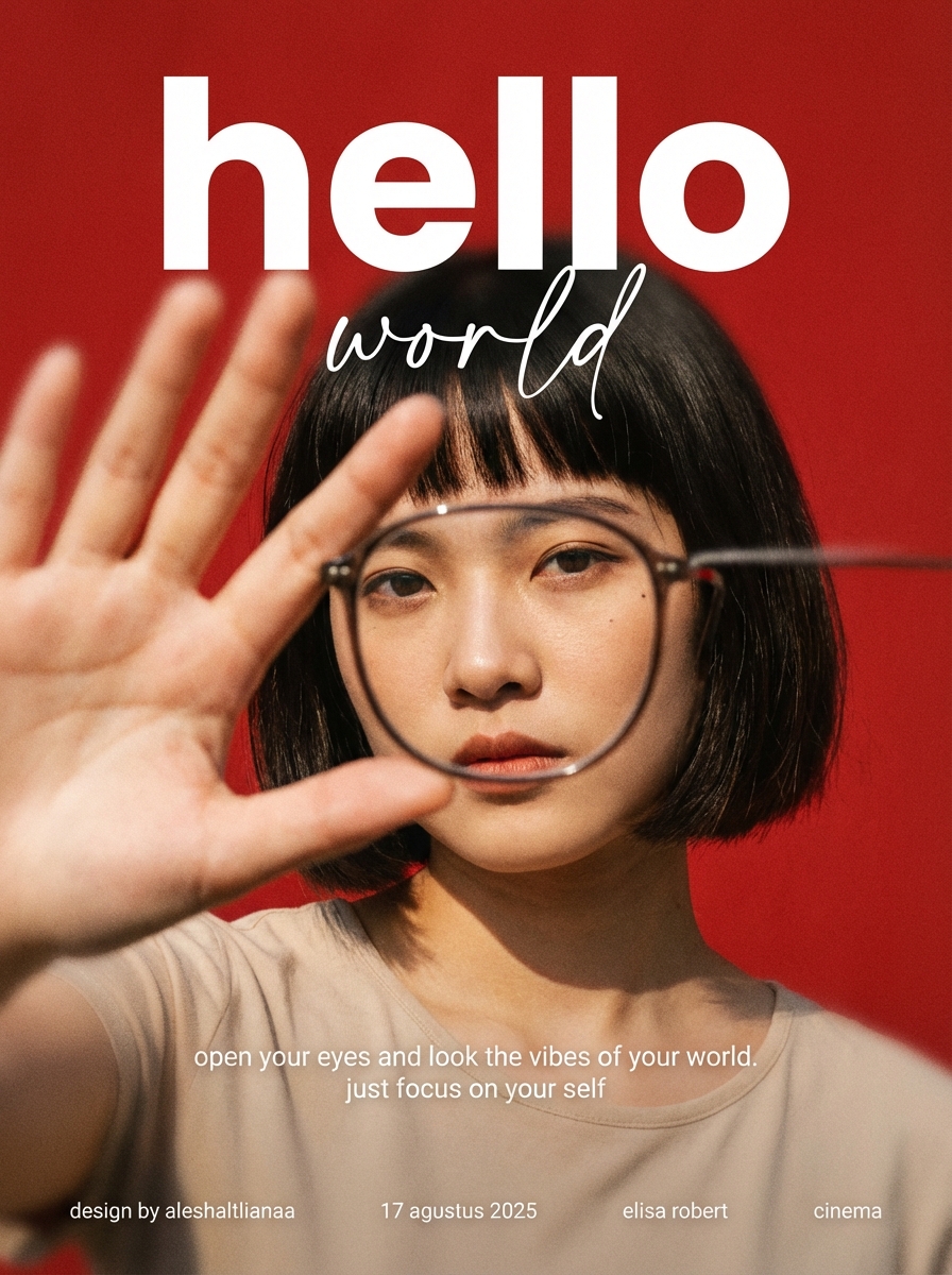 {"subject": {"description": "A realistic close-up portrait poster composed of two overlaid image layers. The first layer features a clean, solid red background with a young model photographed under hard direct sunlight, raising an open hand close to the camera. A single eyeglass lens frame is centered as a 'lens window' concept, precisely revealing the model's face. The second layer sits above the first, applying a frosted-glass effect, while the area inside the eyeglass lens remains clearer.", "mirror_rules": null, "age": "approximately 18–24 years old", "expression": {"eyes": {"look": "direct eye contact", "energy": "focused and calm", "direction": "toward the camera"}, "mouth": {"position": "closed", "energy": "neutral to slightly cool"}, "overall": "calm, serious editorial poster expression"}, "face": {"preserve_original": true, "makeup": "natural makeup, subtle eyeliner , natural lip color"}, "hair": {hair, "style": "short bob haircut with blunt straight bangs", "effect": "smooth with a slight sheen under sunlight"}, "body": {"frame": "slim", "waist": null, "chest": null, "legs": null, "skin": {"visible_areas": ["face", "neck", "hand"], "tone": "light to medium skin tone", "texture": "natural skin texture with realistic pores", "lighting_effect": "hard direct sunlight with crisp shadow edges"}}, "pose": {"position": "front-facing close-up", "base": "one hand raised close to the lens with fingers spread", "overall": "the hand forms a strong shape and partially obscures the face"}, "clothing": {"top": {"type": "simple T-shirt or minimalist top", "color": "off-white / light beige", "details": "clean neckline, no visible logo", "effect": "soft fabric texture under harsh sunlight"}, "bottom": {"type": null, "color": null, "details": null}}}, "accessories": {"headwear": null, "jewelry": {"description": "small if(gender=f){hoop earring } (at least one side visible) and a thin ring on one finger"}, "device": null, "prop": {"description": "a single eyeglass lens frame centered in the composition; the lens area functions as a 'clarity window'"}}, "photography": {"camera_style": "realistic portrait base image combined with modern graphic poster overlay", "angle": "slightly high to eye-level close-up angle", "shot_type": "tight close-up (head and hand dominate the frame)", "aspect_ratio": "2:3 vertical poster", "texture": "sharp facial details on the base image, clean edges, high contrast", "lighting": "hard direct sunlight with warm highlights and strong shadows", "depth_of_field": "two-layer effect: the first layer remains fully clear; the second layer applies global frosted-glass diffusion, blur, and vintage grain, while the eyeglass lens area is inversely masked to remain sharper and clearer"}, "background": {"setting": "poster layout design on a red base background", "wall_color": "dominant solid red", "elements": ["eyeglass frame overlay", "thin horizontal decorative lines at the bottom", "bold title typography with script-style subtitle"], "atmosphere": "bold, modern, high-contrast editorial style", "lighting": "the subject is lit by real sunlight; areas outside the lens receive a frosted-glass haze overlay"}, "the_vibe": {"energy": "strong and focused", "mood": "calm, stylish, slightly cinematic", "aesthetic": "modern editorial poster with a 'seeing clearly through the lens' concept", "authenticity": "realistic base image layered with deliberate design effects", "intimacy": "very close distance, hand reaching toward the viewer", "story": "the world is obscured by haze, but clarity returns inside the lens", "caption_energy": "fashion/editorial poster tagline tone"}, "constraints": {"must_keep": ["Layer 1 (base): a clear realistic close-up portrait with a clean red background under hard direct sunlight", "Layer 1: a large eyeglass frame centered as a compositional element", "Layer 2 (overlay): frosted-glass blur plus vintage grain/noise covering the entire image", "Layer 2: eyeglass lens area inversely masked to appear sharper and clearer", "young model with a short bob haircut and blunt bangs", "open hand raised close to the camera with fingers spread", "hard light with strong shadows", "typography: bold sans-serif 'HELLO' paired with a script-style 'World'", "include the exact visible text: 'DESIGN BY ALESHALTLianaa', 'HELLO', 'World', 'Open your eyes and look the vibes of your world. Just focus on your self', '17 AGUSTUS 2025', 'ELISA ROBERT', 'CINEMA'"], "avoid": ["mirror selfie characteristics", "deformed hands or extra fingers", "changing short hair to long hair ", "adding brand names not present in the image", "unreadable or gibberish text", "overly smooth or plastic-looking skin", "cartoon or anime style"]}, "negative_prompt": ["mirror selfie", "extra fingers", "deformed hand", "finger distortion", "text gibberish", "unreadable letters", "misspelled words", "watermark", "over-smoothed skin", "plastic skin", "anime", "cartoon", "low-resolution face", "incorrect typography"]}