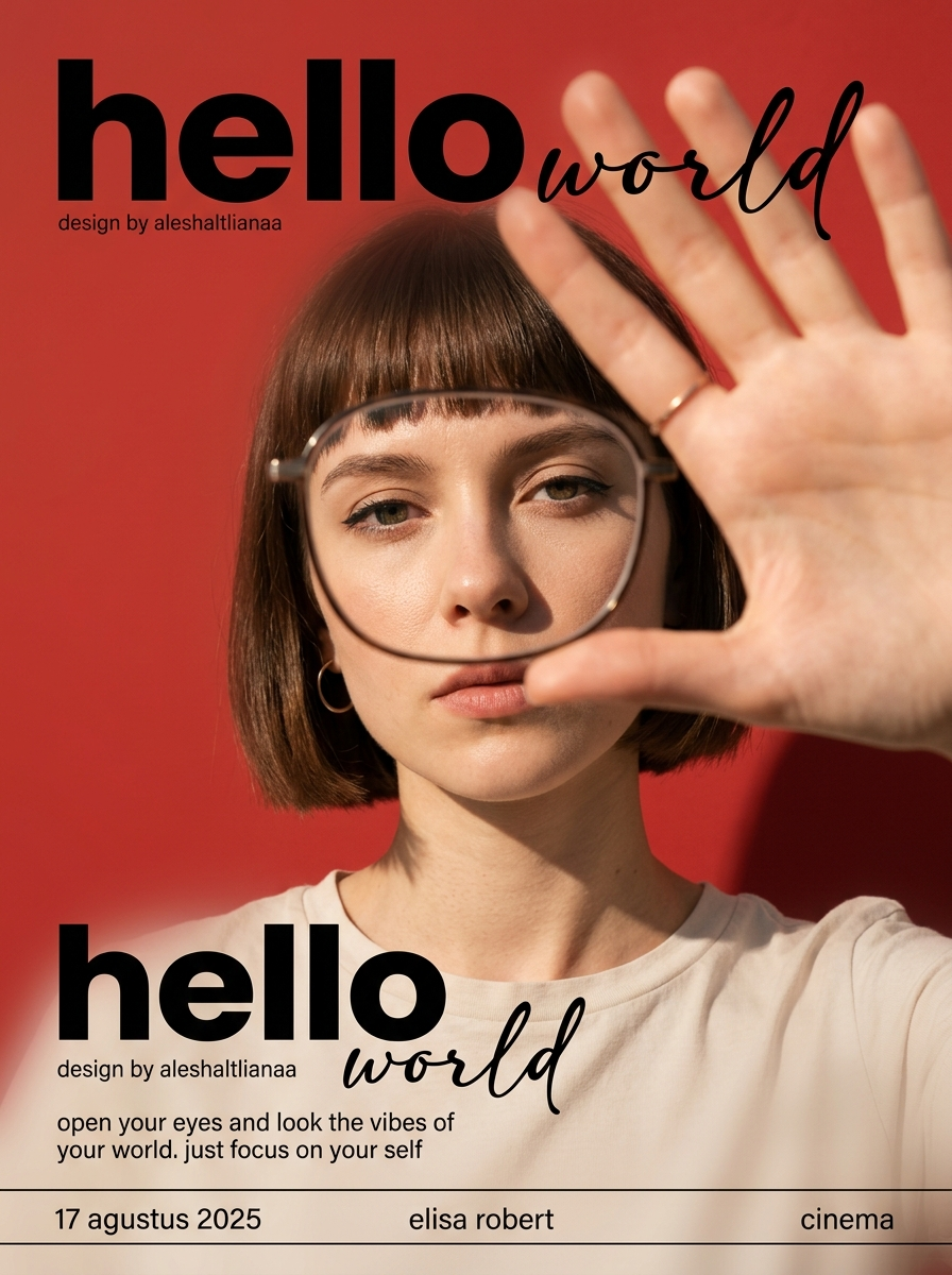 {"subject": {"description": "A realistic close-up portrait poster composed of two overlaid image layers. The first layer features a clean, solid red background with a young model photographed under hard direct sunlight, raising an open hand close to the camera. A single eyeglass lens frame is centered as a 'lens window' concept, precisely revealing the model's face. The second layer sits above the first, applying a frosted-glass effect, while the area inside the eyeglass lens remains clearer.", "mirror_rules": null, "age": "approximately 18–24 years old", "expression": {"eyes": {"look": "direct eye contact", "energy": "focused and calm", "direction": "toward the camera"}, "mouth": {"position": "closed", "energy": "neutral to slightly cool"}, "overall": "calm, serious editorial poster expression"}, "face": {"preserve_original": true, "makeup": "natural makeup, subtle eyeliner , natural lip color"}, "hair": {hair, "style": "short bob haircut with blunt straight bangs", "effect": "smooth with a slight sheen under sunlight"}, "body": {"frame": "slim", "waist": null, "chest": null, "legs": null, "skin": {"visible_areas": ["face", "neck", "hand"], "tone": "light to medium skin tone", "texture": "natural skin texture with realistic pores", "lighting_effect": "hard direct sunlight with crisp shadow edges"}}, "pose": {"position": "front-facing close-up", "base": "one hand raised close to the lens with fingers spread", "overall": "the hand forms a strong shape and partially obscures the face"}, "clothing": {"top": {"type": "simple T-shirt or minimalist top", "color": "off-white / light beige", "details": "clean neckline, no visible logo", "effect": "soft fabric texture under harsh sunlight"}, "bottom": {"type": null, "color": null, "details": null}}}, "accessories": {"headwear": null, "jewelry": {"description": "small if(gender=f){hoop earring } (at least one side visible) and a thin ring on one finger"}, "device": null, "prop": {"description": "a single eyeglass lens frame centered in the composition; the lens area functions as a 'clarity window'"}}, "photography": {"camera_style": "realistic portrait base image combined with modern graphic poster overlay", "angle": "slightly high to eye-level close-up angle", "shot_type": "tight close-up (head and hand dominate the frame)", "aspect_ratio": "2:3 vertical poster", "texture": "sharp facial details on the base image, clean edges, high contrast", "lighting": "hard direct sunlight with warm highlights and strong shadows", "depth_of_field": "two-layer effect: the first layer remains fully clear; the second layer applies global frosted-glass diffusion, blur, and vintage grain, while the eyeglass lens area is inversely masked to remain sharper and clearer"}, "background": {"setting": "poster layout design on a red base background", "wall_color": "dominant solid red", "elements": ["eyeglass frame overlay", "thin horizontal decorative lines at the bottom", "bold title typography with script-style subtitle"], "atmosphere": "bold, modern, high-contrast editorial style", "lighting": "the subject is lit by real sunlight; areas outside the lens receive a frosted-glass haze overlay"}, "the_vibe": {"energy": "strong and focused", "mood": "calm, stylish, slightly cinematic", "aesthetic": "modern editorial poster with a 'seeing clearly through the lens' concept", "authenticity": "realistic base image layered with deliberate design effects", "intimacy": "very close distance, hand reaching toward the viewer", "story": "the world is obscured by haze, but clarity returns inside the lens", "caption_energy": "fashion/editorial poster tagline tone"}, "constraints": {"must_keep": ["Layer 1 (base): a clear realistic close-up portrait with a clean red background under hard direct sunlight", "Layer 1: a large eyeglass frame centered as a compositional element", "Layer 2 (overlay): frosted-glass blur plus vintage grain/noise covering the entire image", "Layer 2: eyeglass lens area inversely masked to appear sharper and clearer", "young model with a short bob haircut and blunt bangs", "open hand raised close to the camera with fingers spread", "hard light with strong shadows", "typography: bold sans-serif 'HELLO' paired with a script-style 'World'", "include the exact visible text: 'DESIGN BY ALESHALTLianaa', 'HELLO', 'World', 'Open your eyes and look the vibes of your world. Just focus on your self', '17 AGUSTUS 2025', 'ELISA ROBERT', 'CINEMA'"], "avoid": ["mirror selfie characteristics", "deformed hands or extra fingers", "changing short hair to long hair ", "adding brand names not present in the image", "unreadable or gibberish text", "overly smooth or plastic-looking skin", "cartoon or anime style"]}, "negative_prompt": ["mirror selfie", "extra fingers", "deformed hand", "finger distortion", "text gibberish", "unreadable letters", "misspelled words", "watermark", "over-smoothed skin", "plastic skin", "anime", "cartoon", "low-resolution face", "incorrect typography"]}