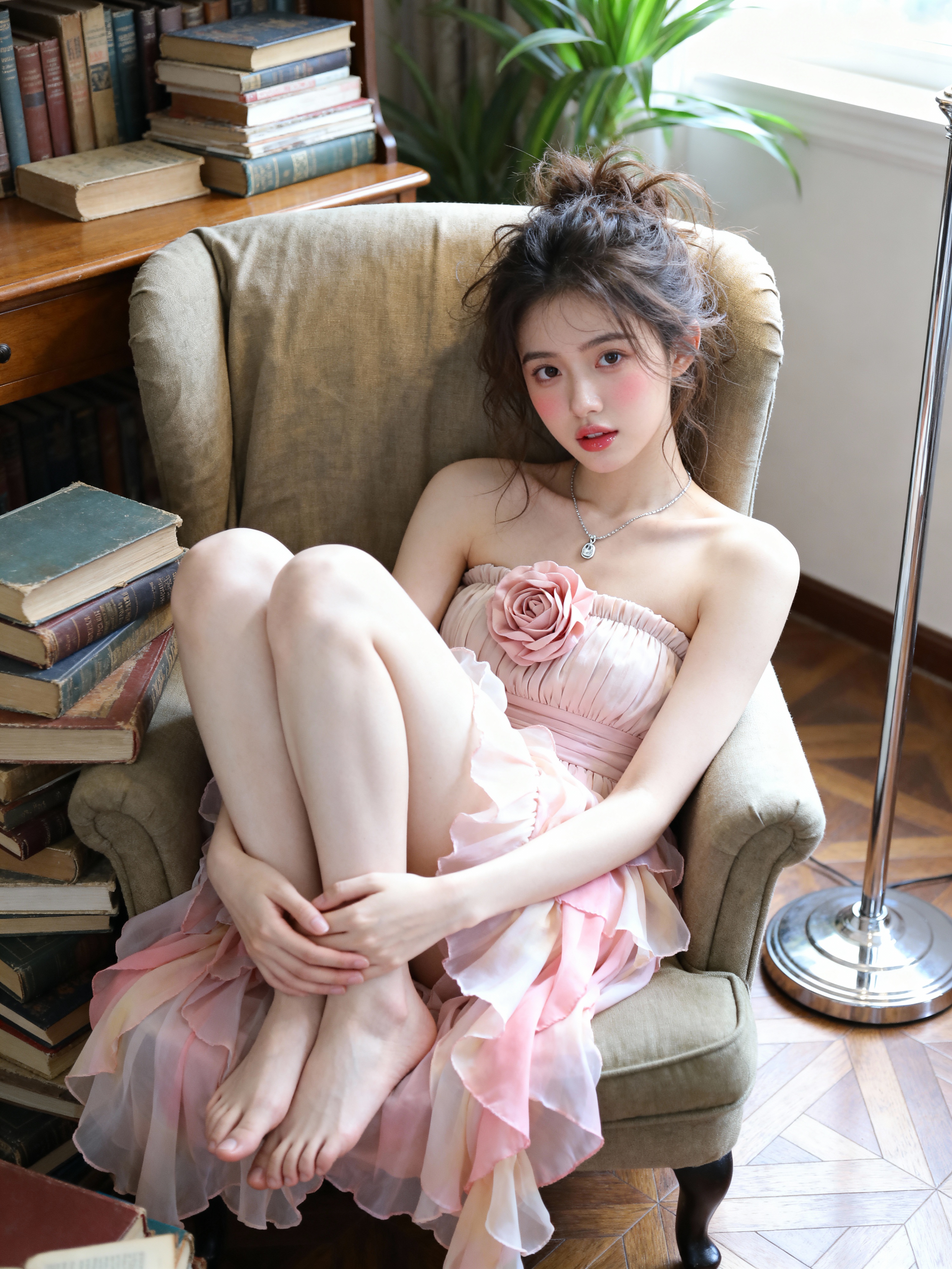 {"subject": {"description": "A stunning young with sitting curled up in a armchair, exuding a soft, dreamy, and slightly melancholic atmosphere.", "mirror_rules": "N/A", "age": "20-year-old", "expression": {"eyes": {"look": "dreamy gaze", "energy": "soft and alluring", "direction": "looking directly at camera"}, "mouth": {"position": "slightly parted or neutral", "energy": "innocent"}, "overall": "vulnerable yet relaxed, slight 'igari' style blush on cheeks and nose"}, "face": {"preserve_original": "true", "makeup": "rosy blush on nose and cheeks, glossy lips , natural brows, soft drunk blush aesthetic"}, "hair": {hair, "style": "messy loose updo", "effect": "wispy strands framing face, casual and effortless"}, "body": {"frame": "slender and petite", "waist": "hidden by posture", "chest": "bare shoulders, collarbones visible", "legs": "bare legs, knees bent", "skin": {"visible_areas": "shoulders, arms, legs", "tone": "pale porcelain white", "texture": "smooth and soft", "lighting_effect": "soft diffused highlight on skin"}}, "pose": {"position": "sitting curled up on a chair", "base": "knees pulled towards chest, feet resting on the seat cushion", "overall": "fetal-like sitting position, relaxed and cozy, hands resting gently on legs"}, "clothing": {"top": {"type": "strapless dress", "color": "pale pastel pink", "details": "large fabric rose decoration on chest, ruched bodice", "effect": "feminine and delicate"}, "bottom": {"type": "layered skirt ", "color": "pale pink gradient", "details": "ruffled chiffon layers, cascading fabric, sheer texture"}}}, "accessories": {"jewelry": "dainty silver necklace with small pendant", "prop": "stacks of vintage books surrounding the chair"}, "photography": {"camera_style": "high-quality portrait photography", "angle": "eye-level slightly looking down", "shot_type": "full body shot including the chair", "aspect_ratio": "4:5", "texture": "soft focus, creamy bokeh, high resolution", "lighting": "soft natural window light from the side, gentle shadows, flattering for skin", "depth_of_field": "shallow depth of field to blur background slightly"}, "background": {"setting": "cozy home library or reading corner", "wall_color": "neutral or cream", "elements": ["slipcover armchair", "wooden side table overloaded with books", "stacks of books on the wooden parquet floor", "green indoor plant in background", "silver floor lamp base"], "atmosphere": "messy but aesthetic, intellectual, quiet", "lighting": "daylight ambience"}, "the_vibe": {"energy": "calm and lazy", "mood": "romantic, introspective, soft", "aesthetic": "coquette aesthetic mixed with light academia", "authenticity": "staged lifestyle portrait", "intimacy": "personal and unguarded moment", "story": "a quiet afternoon spent reading, taking a break to daydream", "caption_energy": "soft model era"}, "constraints": {"must_keep": ["the pink dress with rose detail", "the curled up pose on the chair", "the stacks of books", " tone"], "avoid": ["bright neon colors", "harsh lighting", "standing pose", "clean minimalist background"]}, "negative_prompt": ["nsfw", "blurry face", "distorted hands", "extra fingers", "low quality", "dark lighting", "messy makeup"]}