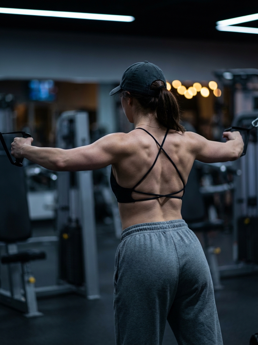 {"subject": {"description": "A model rock climber seen from behind in a gym, arms extended straight out to both sides while holding cable handles, with prominently defined upper-back muscles and scapula contour s under low-key lighting. It looks powerful", "mirror_rules": null, "age": "20", "expression": {"eyes": {"look": null, "energy": "focused", "direction": null}, "mouth": {"position": null, "energy": null}, "overall": "focused mid-rep, face turned away"}, "face": {"preserve_original": true, "makeup": null}, "hair": {hair, "style": "low ponytail through a dark baseball cap", "effect": "a few loose strands"}, "body": {"frame": "lean athletic, Small base, thin muscle", "waist": "The super-slim waist accentuates the broad shoulders.", "chest": null, "legs": "covered by loose pants", "skin": {"visible_areas": ["back", "generous shoulders", "arms"], "tone": "pale, white, cool-toned ", "texture": "natural skin texture with slight workout sheen", "lighting_effect": "low-key cool highlights defining lats, traps, rear delts, and scapula grooves"}}, "pose": {"position": "standing, back to camera", "base": "stable stance, Lean your upper body slightly forward", "overall": "both arms fully extended horizontally, holding cable handles in each hand,Starting to do exercises to train chest muscles"}, "clothing": {"top": {"type": "string-strap sports bra ", hair, "details": "ultra-thin round elastic cord straps, strap width must be 0.1cm or thinner; cord-like and round (not flat webbing). Two ultra-thin(width must be 0.1cm) cords form a clean X across the upper back, plus one lower diagonal cord creating a small angled triangle into a thin back band.", "effect": "delicate thin-string geometry framing the back muscles, The thin elastic bands almost completely exposed her back, making her look both powerful and sexy."}, "bottom": {"type": "loose sweatpants", "color": "medium gray", "details": "relaxed fit with a lighter waistband showing above", "effect": "casual training look"}}}, "accessories": {"headwear": "dark baseball cap", "jewelry": null, "device": null, "prop": "cable machine handles held in both hands"}, "photography": {"camera_style": "realistic cinematic gym fitness photography", "angle": "rear view at about shoulder height, slight telephoto compression", "shot_type": "mid-to-full body from head to upper thighs, centered subject", "aspect_ratio": "4:5 vertical", "texture": "crisp subject detail with soft background bokeh, subtle micro-contrast on muscles (not harsh global sharpening)", "lighting": "premium low-key lighting, dim overall; cool light on the subject with controlled highlights and deeper shadows; warm background bokeh points", "depth_of_field": "shallow depth of field, background strongly blurred"}, "background": {"setting": "indoor gym with dumbbell area and machines, glass/mirror partitions", "wall_color": "cool gray and dark tones", "elements": ["dumbbell racks", "gym machines", "glass or mirror panels", "warm circular bokeh lights"], "atmosphere": "quiet, serious training vibe", "lighting": "dim ambient with warm bokeh in the distance"}, "the_vibe": {"energy": "disciplined, strong", "mood": "moody and focused", "aesthetic": "high-end low-key gym portrait, realistic social media look", "authenticity": "candid mid-set moment", "intimacy": "observational back view", "story": "captured during a cable movement emphasizing back and shoulders", "caption_energy": "minimal and confident"}, "constraints": {"must_keep": ["back view only", "arms extended horizontally holding cable handles", "pale cool-toned skin", "prominent back muscle definition via low-key lighting", "straps must be round cord-like and extremely thin", "strap width must be 0.1 cm (1 mm) or thinner", "strap layout: clean X on upper back plus a lower diagonal/triangular cord into the back band", "dark baseball cap, dark low ponytail ", "gray loose sweatpants with lighter waistband", "warm bokeh lights in background", "shallow depth of field, subject sharp background blurred", "4:5 vertical framing"], "avoid": ["straps wider than 0.5 cm", "flat webbing or ribbon straps", "thick sports bra bands", "extra random straps", "flat bright lighting", "harsh global sharpening", "visible logos or readable text"]}, "negative_prompt": ["straps wider than 0.5 cm", "wide straps", "flat straps", "ribbon straps", "webbing straps", "thick bands", "padded bra", "extra random straps", "overexposed", "heavy HDR", "harsh sharpening", "cartoon", "anime", "visible logos", "readable text", "distorted anatomy", "busy sharp background"]}