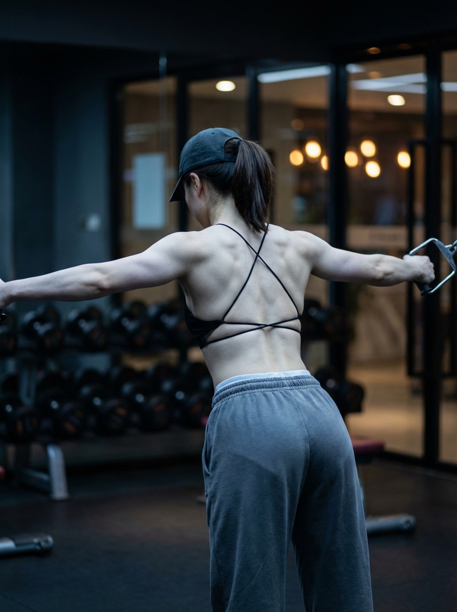 {"subject": {"description": "A model rock climber seen from behind in a gym, arms extended straight out to both sides while holding cable handles, with prominently defined upper-back muscles and scapula contour s under low-key lighting. It looks powerful", "mirror_rules": null, "age": "20", "expression": {"eyes": {"look": null, "energy": "focused", "direction": null}, "mouth": {"position": null, "energy": null}, "overall": "focused mid-rep, face turned away"}, "face": {"preserve_original": true, "makeup": null}, "hair": {hair, "style": "low ponytail through a dark baseball cap", "effect": "a few loose strands"}, "body": {"frame": "lean athletic, Small base, thin muscle", "waist": "The super-slim waist accentuates the broad shoulders.", "chest": null, "legs": "covered by loose pants", "skin": {"visible_areas": ["back", "generous shoulders", "arms"], "tone": "pale, white, cool-toned ", "texture": "natural skin texture with slight workout sheen", "lighting_effect": "low-key cool highlights defining lats, traps, rear delts, and scapula grooves"}}, "pose": {"position": "standing, back to camera", "base": "stable stance, Lean your upper body slightly forward", "overall": "both arms fully extended horizontally, holding cable handles in each hand,Starting to do exercises to train chest muscles"}, "clothing": {"top": {"type": "string-strap sports bra ", hair, "details": "ultra-thin round elastic cord straps, strap width must be 0.1cm or thinner; cord-like and round (not flat webbing). Two ultra-thin(width must be 0.1cm) cords form a clean X across the upper back, plus one lower diagonal cord creating a small angled triangle into a thin back band.", "effect": "delicate thin-string geometry framing the back muscles, The thin elastic bands almost completely exposed her back, making her look both powerful and sexy."}, "bottom": {"type": "loose sweatpants", "color": "medium gray", "details": "relaxed fit with a lighter waistband showing above", "effect": "casual training look"}}}, "accessories": {"headwear": "dark baseball cap", "jewelry": null, "device": null, "prop": "cable machine handles held in both hands"}, "photography": {"camera_style": "realistic cinematic gym fitness photography", "angle": "rear view at about shoulder height, slight telephoto compression", "shot_type": "mid-to-full body from head to upper thighs, centered subject", "aspect_ratio": "4:5 vertical", "texture": "crisp subject detail with soft background bokeh, subtle micro-contrast on muscles (not harsh global sharpening)", "lighting": "premium low-key lighting, dim overall; cool light on the subject with controlled highlights and deeper shadows; warm background bokeh points", "depth_of_field": "shallow depth of field, background strongly blurred"}, "background": {"setting": "indoor gym with dumbbell area and machines, glass/mirror partitions", "wall_color": "cool gray and dark tones", "elements": ["dumbbell racks", "gym machines", "glass or mirror panels", "warm circular bokeh lights"], "atmosphere": "quiet, serious training vibe", "lighting": "dim ambient with warm bokeh in the distance"}, "the_vibe": {"energy": "disciplined, strong", "mood": "moody and focused", "aesthetic": "high-end low-key gym portrait, realistic social media look", "authenticity": "candid mid-set moment", "intimacy": "observational back view", "story": "captured during a cable movement emphasizing back and shoulders", "caption_energy": "minimal and confident"}, "constraints": {"must_keep": ["back view only", "arms extended horizontally holding cable handles", "pale cool-toned skin", "prominent back muscle definition via low-key lighting", "straps must be round cord-like and extremely thin", "strap width must be 0.1 cm (1 mm) or thinner", "strap layout: clean X on upper back plus a lower diagonal/triangular cord into the back band", "dark baseball cap, dark low ponytail ", "gray loose sweatpants with lighter waistband", "warm bokeh lights in background", "shallow depth of field, subject sharp background blurred", "4:5 vertical framing"], "avoid": ["straps wider than 0.5 cm", "flat webbing or ribbon straps", "thick sports bra bands", "extra random straps", "flat bright lighting", "harsh global sharpening", "visible logos or readable text"]}, "negative_prompt": ["straps wider than 0.5 cm", "wide straps", "flat straps", "ribbon straps", "webbing straps", "thick bands", "padded bra", "extra random straps", "overexposed", "heavy HDR", "harsh sharpening", "cartoon", "anime", "visible logos", "readable text", "distorted anatomy", "busy sharp background"]}