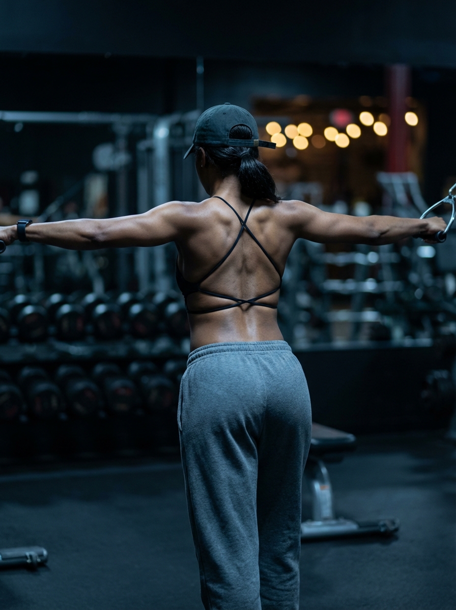 {"subject": {"description": "A model rock climber seen from behind in a gym, arms extended straight out to both sides while holding cable handles, with prominently defined upper-back muscles and scapula contour s under low-key lighting. It looks powerful", "mirror_rules": null, "age": "20", "expression": {"eyes": {"look": null, "energy": "focused", "direction": null}, "mouth": {"position": null, "energy": null}, "overall": "focused mid-rep, face turned away"}, "face": {"preserve_original": true, "makeup": null}, "hair": {hair, "style": "low ponytail through a dark baseball cap", "effect": "a few loose strands"}, "body": {"frame": "lean athletic, Small base, thin muscle", "waist": "The super-slim waist accentuates the broad shoulders.", "chest": null, "legs": "covered by loose pants", "skin": {"visible_areas": ["back", "generous shoulders", "arms"], "tone": "pale, white, cool-toned ", "texture": "natural skin texture with slight workout sheen", "lighting_effect": "low-key cool highlights defining lats, traps, rear delts, and scapula grooves"}}, "pose": {"position": "standing, back to camera", "base": "stable stance, Lean your upper body slightly forward", "overall": "both arms fully extended horizontally, holding cable handles in each hand,Starting to do exercises to train chest muscles"}, "clothing": {"top": {"type": "string-strap sports bra ", hair, "details": "ultra-thin round elastic cord straps, strap width must be 0.1cm or thinner; cord-like and round (not flat webbing). Two ultra-thin(width must be 0.1cm) cords form a clean X across the upper back, plus one lower diagonal cord creating a small angled triangle into a thin back band.", "effect": "delicate thin-string geometry framing the back muscles, The thin elastic bands almost completely exposed her back, making her look both powerful and sexy."}, "bottom": {"type": "loose sweatpants", "color": "medium gray", "details": "relaxed fit with a lighter waistband showing above", "effect": "casual training look"}}}, "accessories": {"headwear": "dark baseball cap", "jewelry": null, "device": null, "prop": "cable machine handles held in both hands"}, "photography": {"camera_style": "realistic cinematic gym fitness photography", "angle": "rear view at about shoulder height, slight telephoto compression", "shot_type": "mid-to-full body from head to upper thighs, centered subject", "aspect_ratio": "4:5 vertical", "texture": "crisp subject detail with soft background bokeh, subtle micro-contrast on muscles (not harsh global sharpening)", "lighting": "premium low-key lighting, dim overall; cool light on the subject with controlled highlights and deeper shadows; warm background bokeh points", "depth_of_field": "shallow depth of field, background strongly blurred"}, "background": {"setting": "indoor gym with dumbbell area and machines, glass/mirror partitions", "wall_color": "cool gray and dark tones", "elements": ["dumbbell racks", "gym machines", "glass or mirror panels", "warm circular bokeh lights"], "atmosphere": "quiet, serious training vibe", "lighting": "dim ambient with warm bokeh in the distance"}, "the_vibe": {"energy": "disciplined, strong", "mood": "moody and focused", "aesthetic": "high-end low-key gym portrait, realistic social media look", "authenticity": "candid mid-set moment", "intimacy": "observational back view", "story": "captured during a cable movement emphasizing back and shoulders", "caption_energy": "minimal and confident"}, "constraints": {"must_keep": ["back view only", "arms extended horizontally holding cable handles", "pale cool-toned skin", "prominent back muscle definition via low-key lighting", "straps must be round cord-like and extremely thin", "strap width must be 0.1 cm (1 mm) or thinner", "strap layout: clean X on upper back plus a lower diagonal/triangular cord into the back band", "dark baseball cap, dark low ponytail ", "gray loose sweatpants with lighter waistband", "warm bokeh lights in background", "shallow depth of field, subject sharp background blurred", "4:5 vertical framing"], "avoid": ["straps wider than 0.5 cm", "flat webbing or ribbon straps", "thick sports bra bands", "extra random straps", "flat bright lighting", "harsh global sharpening", "visible logos or readable text"]}, "negative_prompt": ["straps wider than 0.5 cm", "wide straps", "flat straps", "ribbon straps", "webbing straps", "thick bands", "padded bra", "extra random straps", "overexposed", "heavy HDR", "harsh sharpening", "cartoon", "anime", "visible logos", "readable text", "distorted anatomy", "busy sharp background"]}