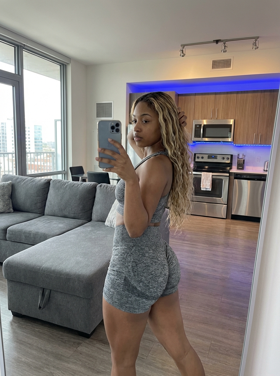 {"subject": {"description": "A young model with long, wavy, blonde-highlighted hair is standing and looking over her left shoulder towards her right side, holding up a smartphone to take a mirror selfie. She has natural makeup, freckles, and is wearing a grey marled two-piece workout set consisting of a sports crop top and high-waisted shorts.", "pose": "She is angled to the left, looking back over her shoulder at her phone in her right hand. Her left hand is lifted and touching her hair at the back of her head. Her body is turned slightly, showing her back and side profile. Her posture is casual and upright.", "clothing": {"top": "A grey marled fabric sports crop top with a scoop back.", "bottom": "Matching grey marled fabric high-waisted athletic shorts.", "accessories": "A smartphone in her right hand."}}, "environment": {"location": "Modern apartment living room and kitchen area.", "background_elements": {"living_room": "A large grey sectional sofa with pillows is positioned on the left.", "kitchen": "In the background, there are upper and lower cabinets, a microwave, a stainless steel oven and stovetop, a toaster, a knife block, and a roll of paper towels. Blue LED strip lighting illuminates the underside of the upper cabinets.", "windows": "Large windows on the left wall with frames, showing a daytime urban view outside."}, "flooring": "Light wood-look laminate flooring."}, "camera": {"shot_type": "Full-body mirror selfie photograph.", "angle": "Eye-level, captured from the phone's reflection.", "focus": "Sharp focus on the subject, with the background slightly less sharp but clearly visible.", "framing": "The shot includes the full body of the model and a significant portion of the living room and kitchen."}, "lighting": {"source": "Mixed lighting from natural daylight coming through the large windows on the left and artificial light from the kitchen, including blue LED strip lighting under the cabinets.", "quality": "Bright and natural daylight mixed with warm interior lights and cool blue accent lighting."}, "mood_and_expression": {"mood": "Casual, confident, relaxed.", "expression": "Neutral, focused on the phone screen.", "atmosphere": "Everyday, candid moment."}, "style_and_realism": {"style": "Raw, unedited, realistic photo.", "realism": "High fidelity, capturing skin texture, hair details, and fabric texture accurately. No filters or heavy retouching visible."}, "colors_and_tone": {"dominant_colors": "Grey, white, beige, natural skin tones, blue (from LED lights).", "tone": "Neutral and balanced, with bright highlights from the windows and warmer tones from the interior."}, "quality_and_technical_details": {"resolution": "High resolution.", "sharpness": "Sharp image quality.", "noise": "Minimal."}, "aspect_ratio_and_output": {"aspect_ratio": "3:4 (portrait).", "output_format": "JPEG"}, "controlnet": {"pose_control": {"woman_type": "OpenPose", "purpose": "Exact skeletal and pose lock", "constraints": ["preserve shoulder width", "preserve hip angle", "preserve spine curvature", "preserve limb placement"], "recommended_weight": 0.95}, "depth_control": {"woman_type": "MiDaS", "purpose": "Depth, volume, and camera-to-body spatial lock", "constraints": ["preserve chest foreground dominance if present", "prevent flat or compressed depth", "maintain clear torso-to-background separation"], "recommended_weight": 0.8}}, "negative_prompt": {"forbidden_elements": ["anatomy normalization", "body proportion averaging", "smaller bust than reference", "reduced chest volume", "flattened or compressed breasts", "tightened, lifted, or artificially supported breasts", "slimmed torso", "aesthetic proportion correction", "beauty standard enforcement", "dataset-average model anatomy", "camera angles that reduce volume", "wide-angle distortion not in reference", "lens compression not in reference", "cropping that removes volume", "depth flattening", "mirror selfies", "phone-in-hand selfies", "reflections", "beautification filters", "skin smoothing", "plastic skin", "airbrushed texture", "stylized realism", "editorial fashion proportions", "“more realistic” reinterpretation", "“naturalization” of prominent features"]}}