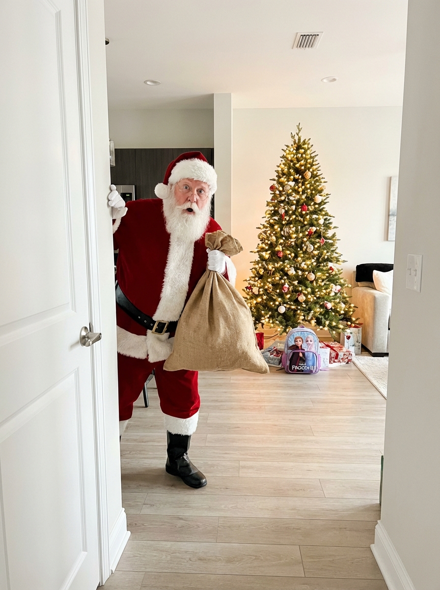 {"subject": {"description": "An elderly model dressed as Santa Claus sneaks into a bright modern home, peeking from the left doorway while carrying a large burlap sack of gifts, caught mid-step in a playful surprised moment.", "mirror_rules": null, "age": "elderly (60s-70s)", "expression": {"eyes": {"look": "wide-eyed, alert", "energy": "playful surprise", "direction": "looking directly at the camera"}, "mouth": {"position": "slightly open", "energy": "caught-in-the-act, comedic"}, "overall": "warm, mischievous, surprised Santa expression"}, "face": {"preserve_original": true, "makeup": "no visible makeup, natural skin; classic Santa look emphasized by the beard"}, "hair": {hair, "style": "full beard and mustache, bushy eyebrows", "effect": "soft, fluffy beard texture framing the face"}, "body": {"frame": "stocky", "waist": "rounded", "chest": "broad", "legs": "sturdy", "skin": {"visible_areas": ["face", "hands"], "tone": "light/fair", "texture": "natural, slightly weathered elderly skin", "lighting_effect": "warm indoor light with gentle highlights"}}, "pose": {"position": "left side of the frame near the entry doorway", "base": "slight crouch, leaning forward, shoulders raised by the sack weight", "overall": "sneaking/peeking pose as if arriving with gifts"}, "clothing": {"top": {"type": "classic Santa jacket", "color": "deep red", "details": "fur trim, wide belt with metallic buckle, gloves", "effect": "velvety fabric with soft fur edges"}, "bottom": {"type": "Santa pants and boots", "color": "red pants, boots", "details": "matching red pants; tall leather boots with a slight shine", "effect": "clean, costume-like but believable texture"}}}, "accessories": {"headwear": "red Santa hat with trim and pom-pom", "prop": "large burlap sack over the shoulder, stuffed with toys/gifts"}, "photography": {"camera_style": "realistic smartphone photo, social media candid snapshot, wide-angle look", "angle": "eye-level to slightly high, shot from the hallway looking into the room", "shot_type": "full-body environmental portrait with lots of negative space and interior architecture", "aspect_ratio": "4:5 vertical", "texture": "clean, sharp digital detail, natural indoor noise kept minimal", "lighting": "warm indoor ambient lighting mixed with warm Christmas tree lights", "depth_of_field": "deep focus; both Santa and the Christmas tree remain clear"}, "background": {"setting": "modern home interior with trim, doorway frames, and a room opening to the right", "wall_color": "soft off-white", "elements": ["light wood flooring", "door and window trim", "glass-paned door frames", "plantation shutters on tall windows", "a tall Christmas tree covered in warm lights and ornaments", "presents and boxes under the tree", "a children's backpack with readable text 'Frozen II'"], "atmosphere": "cozy, tidy, family holiday night at home", "lighting": "warm, inviting, slightly golden with sparkling tree light bokeh points"}, "the_vibe": {"energy": "playful and theatrical", "mood": "cozy holiday surprise", "aesthetic": "real-life Christmas morning magic, candid home photo", "authenticity": "looks like a genuine moment captured quickly on a phone", "intimacy": "private family space, warm and welcoming", "story": "Santa has just arrived and got caught sneaking in with gifts", "caption_energy": "softly funny, heartwarming, festive"}, "constraints": {"must_keep": ["elderly Santa with beard", "large burlap gift sack on shoulder", "sneaking/peeking pose near doorway on the left", "tall lit Christmas tree in the room on the right", "warm indoor lighting + tree lights", "clean modern white-trim interior and light wood floor", "vertical wide-angle smartphone feel"], "avoid": ["cartoon/anime style", "cinematic heavy color grading", "shallow depth of field blur that hides the room", "extra people", "outdoor snow scenery", "incorrect readable text (do not invent new logos or words)"]}, "negative_prompt": ["anime", "cartoon", "oil painting", "overly cinematic", "dramatic spotlight", "extreme bokeh", "blur", "low resolution", "extra limbs", "duplicate person", "watermark", "random text", "gibberish letters", "fake logos"]}