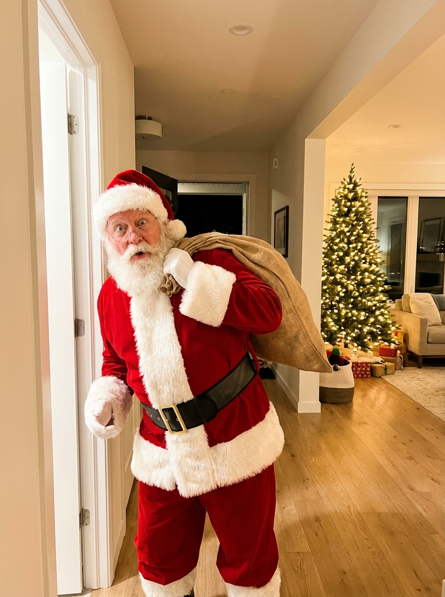 {"subject": {"description": "An elderly model dressed as Santa Claus sneaks into a bright modern home, peeking from the left doorway while carrying a large burlap sack of gifts, caught mid-step in a playful surprised moment.", "mirror_rules": null, "age": "elderly (60s-70s)", "expression": {"eyes": {"look": "wide-eyed, alert", "energy": "playful surprise", "direction": "looking directly at the camera"}, "mouth": {"position": "slightly open", "energy": "caught-in-the-act, comedic"}, "overall": "warm, mischievous, surprised Santa expression"}, "face": {"preserve_original": true, "makeup": "no visible makeup, natural skin; classic Santa look emphasized by the beard"}, "hair": {hair, "style": "full beard and mustache, bushy eyebrows", "effect": "soft, fluffy beard texture framing the face"}, "body": {"frame": "stocky", "waist": "rounded", "chest": "broad", "legs": "sturdy", "skin": {"visible_areas": ["face", "hands"], "tone": "light/fair", "texture": "natural, slightly weathered elderly skin", "lighting_effect": "warm indoor light with gentle highlights"}}, "pose": {"position": "left side of the frame near the entry doorway", "base": "slight crouch, leaning forward, shoulders raised by the sack weight", "overall": "sneaking/peeking pose as if arriving with gifts"}, "clothing": {"top": {"type": "classic Santa jacket", "color": "deep red", "details": "fur trim, wide belt with metallic buckle, gloves", "effect": "velvety fabric with soft fur edges"}, "bottom": {"type": "Santa pants and boots", "color": "red pants, boots", "details": "matching red pants; tall leather boots with a slight shine", "effect": "clean, costume-like but believable texture"}}}, "accessories": {"headwear": "red Santa hat with trim and pom-pom", "prop": "large burlap sack over the shoulder, stuffed with toys/gifts"}, "photography": {"camera_style": "realistic smartphone photo, social media candid snapshot, wide-angle look", "angle": "eye-level to slightly high, shot from the hallway looking into the room", "shot_type": "full-body environmental portrait with lots of negative space and interior architecture", "aspect_ratio": "4:5 vertical", "texture": "clean, sharp digital detail, natural indoor noise kept minimal", "lighting": "warm indoor ambient lighting mixed with warm Christmas tree lights", "depth_of_field": "deep focus; both Santa and the Christmas tree remain clear"}, "background": {"setting": "modern home interior with trim, doorway frames, and a room opening to the right", "wall_color": "soft off-white", "elements": ["light wood flooring", "door and window trim", "glass-paned door frames", "plantation shutters on tall windows", "a tall Christmas tree covered in warm lights and ornaments", "presents and boxes under the tree", "a children's backpack with readable text 'Frozen II'"], "atmosphere": "cozy, tidy, family holiday night at home", "lighting": "warm, inviting, slightly golden with sparkling tree light bokeh points"}, "the_vibe": {"energy": "playful and theatrical", "mood": "cozy holiday surprise", "aesthetic": "real-life Christmas morning magic, candid home photo", "authenticity": "looks like a genuine moment captured quickly on a phone", "intimacy": "private family space, warm and welcoming", "story": "Santa has just arrived and got caught sneaking in with gifts", "caption_energy": "softly funny, heartwarming, festive"}, "constraints": {"must_keep": ["elderly Santa with beard", "large burlap gift sack on shoulder", "sneaking/peeking pose near doorway on the left", "tall lit Christmas tree in the room on the right", "warm indoor lighting + tree lights", "clean modern white-trim interior and light wood floor", "vertical wide-angle smartphone feel"], "avoid": ["cartoon/anime style", "cinematic heavy color grading", "shallow depth of field blur that hides the room", "extra people", "outdoor snow scenery", "incorrect readable text (do not invent new logos or words)"]}, "negative_prompt": ["anime", "cartoon", "oil painting", "overly cinematic", "dramatic spotlight", "extreme bokeh", "blur", "low resolution", "extra limbs", "duplicate person", "watermark", "random text", "gibberish letters", "fake logos"]}