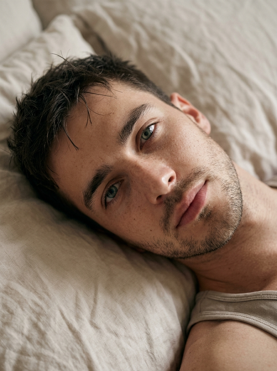 {"subject": {"description": "An ultra-close realistic portrait of a young male model lying on light bedding, head tilted diagonally in the frame, gazing into the camera with calm, softness; natural freckles and true skin texture are clearly .", "mirror_rules": "", "age": "early 20s", "expression": {"eyes": {"look": "direct eye contact", "energy": "soft, slightly dreamy", "direction": "toward the camera"}, "mouth": {"position": "closed, relaxed", "energy": "neutral, gentle"}, "overall": "quiet, , slightly melancholic calm"}, "face": {"preserve_original": true, "makeup": "clean groomed skin with light stubble; brushed thick dark brows; natural features; natural lashes; subtle highlight on nose bridge and cheekbones; glossy lips"}, "hair": {"style": "short tousled hair spread around the head, slightly messy with a few strands across the forehead", "effect": "soft natural shine, casual bed-hair texture"}, "body": {"frame": "lean athletic", "waist": "not ", "chest": "partially ", "legs": "not ", "skin": {"visible_areas": ["face", "neck", "one shoulder"], "tone": "light neutral with a soft warm undertone", "texture": "real pores and fine freckles across cheeks and nose, minimal retouching", "lighting_effect": "gentle specular highlights on forehead, nose, and lips"}}, "pose": {"position": "lying down on a bed", "base": "head tilted, face very close to the camera", "overall": " , relaxed, slightly angled diagonal composition"}, "clothing": {"top": {"type": "fitted tank top", "details": "sleeveless shoulder edge near the shoulder", "effect": "minimal and understated, keeps attention on the face"}, "bottom": {"type": "not ", "color": "", "details": ""}}}, "accessories": {"jewelry": "none"}, "photography": {"camera_style": "realistic social-media style close-up portrait, smartphone-like clarity", "angle": "slightly above and to the side, emphasizing a diagonal head tilt", "shot_type": "extreme close-up face portrait", "aspect_ratio": "3:4 vertical", "texture": "sharp focus on eyes and lips, natural skin texture, mild film-like grain", "lighting": "soft diffused indoor light, low contrast, gentle shadows", "depth_of_field": "shallow depth of field with softly blurred bedding background"}, "background": {"setting": "bedroom close-up on rumpled bedding", "wall_color": "not ", "elements": ["light beige/gray pillow or bedsheet fabric with soft folds"], "atmosphere": "quiet, private, cozy", "lighting": "ambient natural-looking soft light"}, "the_vibe": {"energy": "low and tender", "mood": "dreamy, calm, ", "aesthetic": "clean minimal realism with gentle softness", "authenticity": "unfiltered, human, lightly imperfect in the best way", "intimacy": "close enough to hear a breath, eye contact that lingers", "story": "a quiet moment on the bed before going out, or after a long day, letting the camera witness the hush", "caption_energy": "soft-spoken, minimal words, emotionally warm"}, "constraints": {"must_keep": ["extreme close-up framing", "diagonal head tilt while lying on light bedding", "gray-green eyes with direct gaze", "thick dark brows and natural lashes", " freckles and real skin texture (no heavy smoothing)", "glossy lips", "soft diffused indoor light and shallow depth of field"], "avoid": ["heavy glam makeup", "overly airbrushed plastic skin", "harsh flash lighting", "bright saturated color grading", "wide shot or full body", " text, logos, or watermarks"]}, "negative_prompt": ["over-retouched", "plastic skin", "heavy contour", "strong blush", "harsh flash", "high saturation", "cartoon", "anime", "oil painting", "text", "watermark", "logo", "low resolution", "motion blur", "out of focus eyes", "extra fingers", "deformed face"]}}