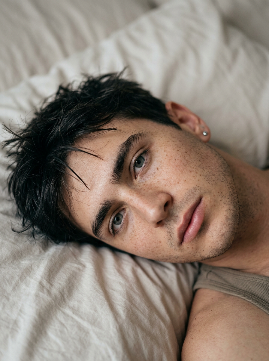 {"subject": {"description": "An ultra-close realistic portrait of a young model lying on light bedding, head tilted diagonally in the frame, gazing into the camera with calm, intensity; natural freckles and true skin texture are clearly .", "mirror_rules": "", "age": "early 20s", "expression": {"eyes": {"look": "direct eye contact", "energy": "soft, slightly dreamy", "direction": "toward the camera"}, "mouth": {"position": "closed, relaxed", "energy": "neutral, gentle"}, "overall": "quiet, , slightly melancholic calm"}, "face": {"preserve_original": true, "makeup": "groomed clean skin with light stubble; brushed thick dark brows; natural features; natural lashes; subtle highlight on nose bridge and cheekbones; soft lips with subtle gloss"}, "hair": {hair, "style": "short tousled hair spread around the head, slightly messy with a few strands crossing the forehead", "effect": "soft natural shine, casual bed-hair texture"}, "body": {"frame": "lean fit", "waist": "not ", "chest": "partially ", "legs": "not ", "skin": {"visible_areas": ["face", "neck", "one shoulder"], "tone": "light neutral with a soft warm-pink undertone", "texture": "real pores, fine freckles across cheeks and nose, light stubble on jaw, minimal retouching", "lighting_effect": "gentle specular highlights on forehead, nose, and lips"}}, "pose": {"position": "lying down on a bed", "base": "head tilted, face very close to the camera", "overall": " , relaxed confident, slightly angled diagonal composition"}, "clothing": {"top": {"type": "fitted tank top", hair, "details": "sleeveless shoulder near the collarbone", "effect": "minimal and understated, keeps attention on the face"}, "bottom": {"type": "not ", "color": "", "details": ""}}}, "accessories": {"jewelry": "silver ear jewelry: small stud piercing, subtle metallic shine"}, "photography": {"camera_style": "realistic social-media style close-up portrait, smartphone-like clarity", "angle": "slightly above and to the side, emphasizing a diagonal head tilt", "shot_type": "extreme close-up face portrait", "aspect_ratio": "3:4 vertical", "texture": "sharp focus on eyes and lips, natural skin texture, mild film-like grain", "lighting": "soft diffused indoor light, low contrast, gentle shadows", "depth_of_field": "shallow depth of field with softly blurred bedding background"}, "background": {"setting": "bedroom close-up on rumpled bedding", "wall_color": "not ", "elements": ["light beige/gray pillow or bedsheet fabric with soft folds"], "atmosphere": "quiet, private, cozy", "lighting": "ambient natural-looking soft light"}, "the_vibe": {"energy": "low and tender", "mood": "dreamy, calm, ", "aesthetic": "clean minimal realism with gentle softness", "authenticity": "unfiltered, human, lightly imperfect in the best way", "intimacy": "close enough to hear a breath, eye contact that lingers", "story": "a quiet moment on the bed before going out, or after a long day, letting the camera witness the hush", "caption_energy": "soft-spoken, minimal words, emotionally warm"}, "constraints": {"must_keep": ["extreme close-up framing", "diagonal head tilt while lying on light bedding", "gray-green eyes with direct gaze", "thick dark brows and natural lashes", " freckles and real skin texture (no heavy smoothing)", "soft lips with subtle gloss", "subtle silver ear piercings", "soft diffused indoor light and shallow depth of field"], "avoid": ["heavy well-groomed appearance", "overly airbrushed plastic skin", "harsh flash lighting", "bright saturated color grading", "wide shot or full body", " text, logos, or watermarks"]}, "negative_prompt": ["over-retouched", "plastic skin", "heavy natural features", "strong natural features", "harsh flash", "high saturation", "cartoon", "anime", "oil painting", "text", "watermark", "logo", "low resolution", "motion blur", "out of focus eyes", "extra fingers", "deformed face"]}}