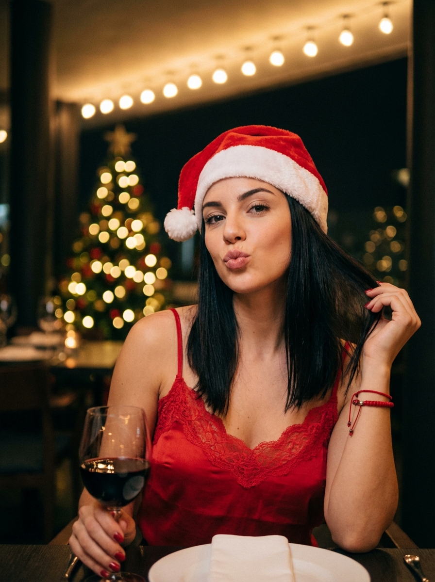 {"subject": {"description": "Young adult model with tone (use uploaded reference identity if provided; keep the exact same face, no facial structure change)", "hair": "Long, dark brunette, straight, center-parted, falling over shoulders, healthy shine", "expression": "Soft pout (kissy face/duck face), direct eye contact with camera, confident but natural", "pose": "Seated at a table, right hand raised touching the side of the head/hair, elbow slightly out; left hand holding a glass"}, "attire": {"garment": "Red satin/silk camisole top with delicate lace trim along the V-neckline, spaghetti straps", "style": "Lingerie -inspired holiday evening wear", "hat": "Red Santa hat (classic trim and pom-pom), worn naturally (not covering eyes)"}, "accessories": {"wrist": "Stack of red bracelets on right wrist (red beaded bracelet + red woven bracelet + thin red-toned chain), no mismatched colors", "neck": "Delicate thin layered metal necklaces (gold or silver tone)", "nails": "Long manicured nails with glossy deep red polish"}, "props": {"drink": "Large red wine glass in left hand, deep red wine visible, realistic reflections"}, "environment": {"setting": "Dimly lit upscale restaurant or lounge interior, night-time", "background_details": "A large, decorated Christmas tree behind her (soft bokeh), warm recessed ceiling strip lighting, dark walls; table with tablecloth and crystal wine glasses blurred", "ambiance": "Intimate, moody, luxurious holiday atmosphere"}, "photography_style": {"lighting": "Warm golden ambient light + ceiling strip lighting, NO direct flash, soft shadows and smooth highlight rolloff", "aesthetic": "Candid influencer snapshot, natural skin texture, slight high-ISO grain (authentic, not AI-smooth)", "framing": "Medium close-up, eye-level shot, subject centered", "color_grading": "Warm tungsten balance, slightly saturated skin tones, deep blacks, subtle filmic contrast"}, "camera": {"model": "Canon PowerShot G7 X Mark III or iPhone 15 Pro (Portrait Mode look)", "lens": "24mm equivalent", "aperture": "f/1.8", "shutter_speed": "1/60s", "iso": "1600", "focus": "Eyes and lips tack sharp, background soft bokeh"}, "negative_prompt": ["different face identity", "face morphing", "beauty filter", "plastic skin", "cgi render", "anime/cartoon", "over-sharpening", "hdr look", "text overlay", "watermark", "extra people", "warped hands", "extra fingers", "blurry face", "overexposed flash", "christmas tree blocking face"]}