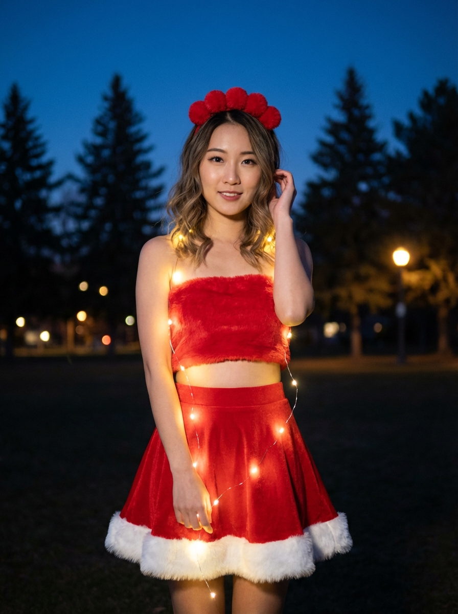 {"subject": {"description": "young model posing for a festive holiday portrait", "pose": "Standing facing the camera, one hand gently touching hair near the ear, wrapped in a string of lights", "physique": "Slender, tone"}, "clothing": {"outfit": "Santa-inspired two-piece set or dress", "top": "fuzzy/faux-fur strapless tube top ", "bottom": "Red skater skirt with thick faux-fur trim at the hem", "headwear": "Festive headband featuring red and fluffy pom-poms"}, "hair": {hair, "style": "Shoulder-length loose waves"}, "face": {"expression": "Soft, pleasant smile, direct eye contact", "makeup": "Natural look with winged eyeliner and red lips "}, "accessories": {"props": "String of warm-Christmas fairy lights wrapped around the torso and shoulders"}, "environment": {"location": "Outdoors at night", "background_details": ["Deep blue night sky (twilight)", "Silhouetted pine trees", "Soft bokeh from distant warm streetlights"]}, "lighting": {"source": "Practical lighting from the fairy lights", "quality": "Warm, glowing illumination on the face and body contrasting with the cool dark background", "mood": "Magical, festive, low-light photography"}, "camera": {"type": "DSLR or Mirrorless", "angle": "Eye-level portrait", "focus": "Sharp focus on the subject with background blur (bokeh)"}, "lenses": {"type": "Portrait lens with wide aperture (f/1.8 or f/2.8)"}, "meta_tokens_for_photorealism": ["night portrait", "Christmas lights", "glow effect", "festive fashion", "bokeh", "low light photography", "4k resolution"], "style": {"aesthetic": "Holiday, Cozy, Magical, Instagram Portrait", "vibe": "Cheerful, warm, celebratory"}}