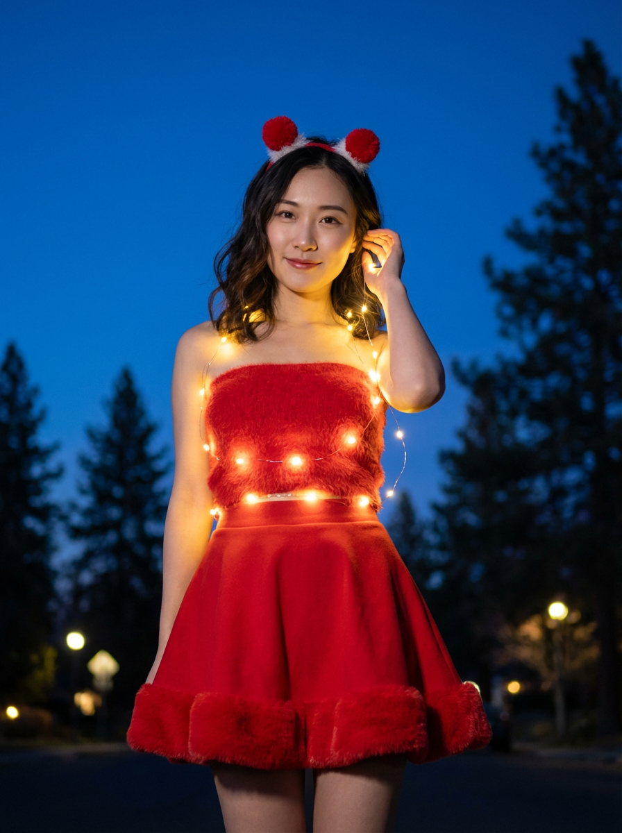 {"subject": {"description": "young model posing for a festive holiday portrait", "pose": "Standing facing the camera, one hand gently touching hair near the ear, wrapped in a string of lights", "physique": "Slender, tone"}, "clothing": {"outfit": "Santa-inspired two-piece set or dress", "top": "fuzzy/faux-fur strapless tube top ", "bottom": "Red skater skirt with thick faux-fur trim at the hem", "headwear": "Festive headband featuring red and fluffy pom-poms"}, "hair": {hair, "style": "Shoulder-length loose waves"}, "face": {"expression": "Soft, pleasant smile, direct eye contact", "makeup": "Natural look with winged eyeliner and red lips "}, "accessories": {"props": "String of warm-Christmas fairy lights wrapped around the torso and shoulders"}, "environment": {"location": "Outdoors at night", "background_details": ["Deep blue night sky (twilight)", "Silhouetted pine trees", "Soft bokeh from distant warm streetlights"]}, "lighting": {"source": "Practical lighting from the fairy lights", "quality": "Warm, glowing illumination on the face and body contrasting with the cool dark background", "mood": "Magical, festive, low-light photography"}, "camera": {"type": "DSLR or Mirrorless", "angle": "Eye-level portrait", "focus": "Sharp focus on the subject with background blur (bokeh)"}, "lenses": {"type": "Portrait lens with wide aperture (f/1.8 or f/2.8)"}, "meta_tokens_for_photorealism": ["night portrait", "Christmas lights", "glow effect", "festive fashion", "bokeh", "low light photography", "4k resolution"], "style": {"aesthetic": "Holiday, Cozy, Magical, Instagram Portrait", "vibe": "Cheerful, warm, celebratory"}}
