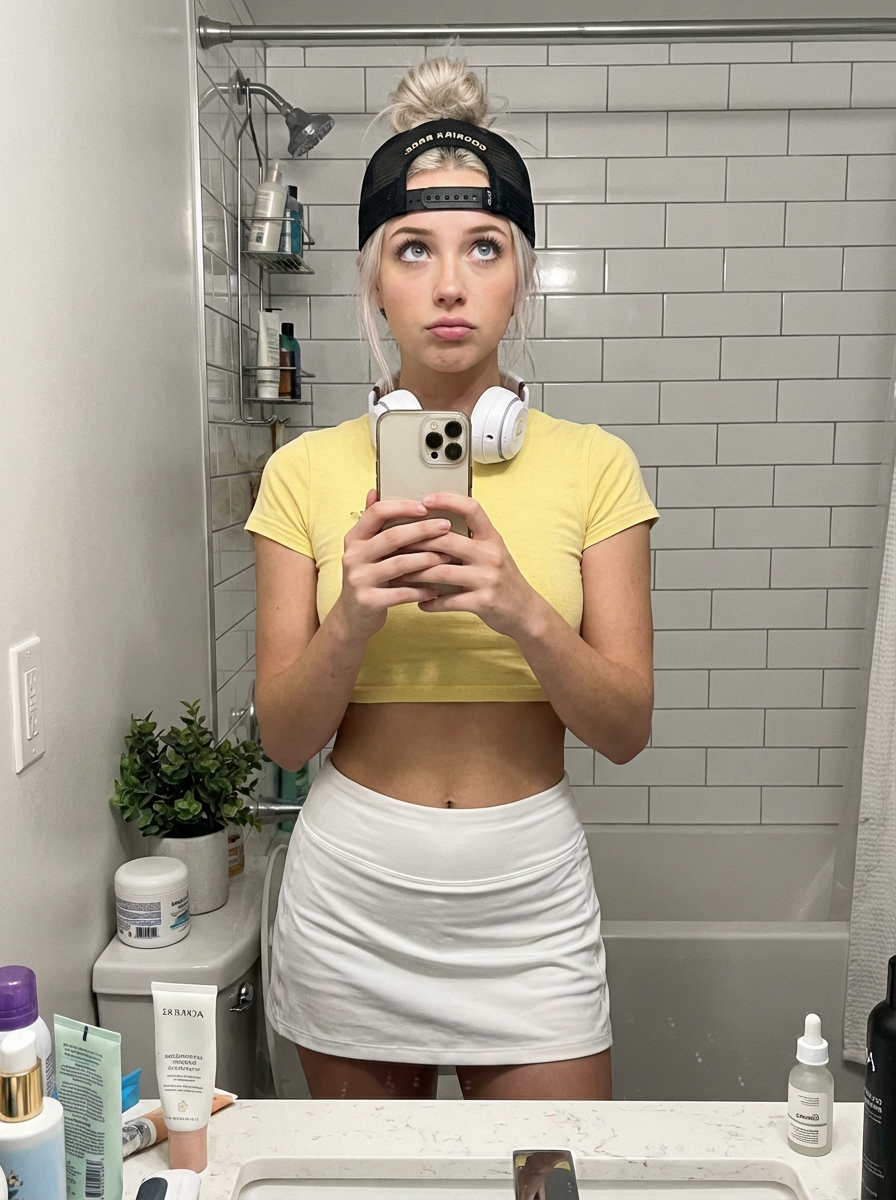 {"subject": {"description": "Young model taking bathroom mirror selfie, innocent doe eyes but the outfit tells another story", "mirror_rules": "facing mirror, hips slightly angled, close to mirror filling frame", "age": "early 20s", "expression": {"eyes": "big innocent doe eyes looking up through lashes, 'who me?' energy", "mouth": "soft pout, lips slightly parted, maybe tiny tongue touching corner", "brows": "soft, slightly raised, faux innocent", "overall": "angel face but devil body, the contrast is the whole point"}, "hair": {"color": "platinum blonde", "style": "messy bun or claw clip, loose strands framing face, effortless"}, "body": {"waist": "tiny", "ass": "round, full, fabric of shorts riding up and clinging between cheeks, every curve visible through thin athletic material", "thighs": "thick, soft, shorts barely containing"}, "clothing": {"top": {"type": "ULTRA mini crop tee", "color": "yellow", "fit": "barely containing chest, fabric stretched tight, ends just below, shows full stomach"}, "bottom": {"type": "tight tennis skort or athletic booty shorts", "color": "white", "material": "thin stretchy athletic fabric", "fit": "vacuum tight, riding up, clinging between cheeks, fabric creases visible, leaving nothing to imagination"}}, "face": {"features": "pretty - big eyes, small nose, full lips", "makeup": "minimal, natural, lip gloss, no-makeup makeup"}}, "accessories": {"headwear": {"type": "Goorin Bros cap", "details": "black with animal patch, worn backwards or tilted"}, "headphones": {"type": "over-ear white headphones", "position": "around neck"}, "device": {"type": "iPhone", "details": "visible in mirror, held at chest level"}}, "photography": {"camera_style": "casual iPhone mirror selfie, NOT professional", "quality": "iPhone camera - good but not studio, realistic social media quality", "angle": "eye-level, straight on mirror", "shot_type": "3/4 body, close to mirror", "aspect_ratio": "9:16 vertical", "texture": "natural, slightly grainy iPhone look, not over-processed"}, "background": {"setting": "regular apartment bathroom", "style": "normal NYC apartment bathroom, not luxury", "elements": ["white subway tile walls", "basic bathroom mirror with good lighting above", "simple white sink vanity", "toiletries visible - skincare bottles, toothbrush holder", "towel hanging on hook", "maybe shower curtain edge visible", "small plant on counter"], "atmosphere": "real bathroom, lived-in, normal home", "lighting": "good vanity lighting above mirror - bright, even, flattering but not studio"}, "vibe": {"energy": "innocent face + sinful body = the whole game", "mood": "just got ready for tennis but making content first, 'what?' expression while wearing basically nothing", "contrast": "doe eyes + ass eating the shorts = lethal", "caption_energy": "'tennis anyone? 🍌' or 'running late oops'"}}