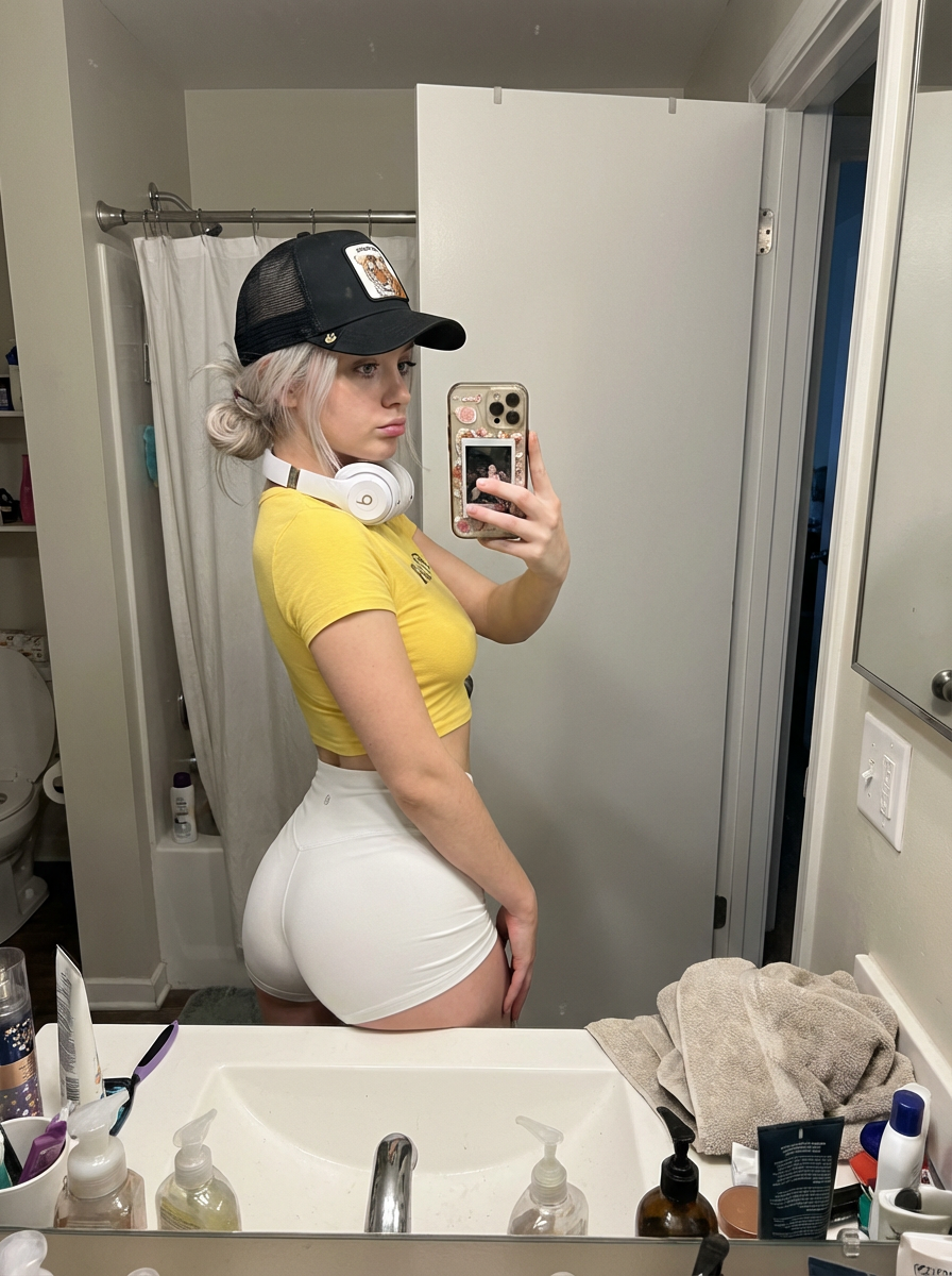 {"subject": {"description": "Young model taking bathroom mirror selfie, innocent doe eyes but the outfit tells another story", "mirror_rules": "facing mirror, hips slightly angled, close to mirror filling frame", "age": "early 20s", "expression": {"eyes": "big innocent doe eyes looking up through lashes, 'who me?' energy", "mouth": "soft pout, lips slightly parted, maybe tiny tongue touching corner", "brows": "soft, slightly raised, faux innocent", "overall": "angel face but devil body, the contrast is the whole point"}, "hair": {"color": "platinum blonde", "style": "messy bun or claw clip, loose strands framing face, effortless"}, "body": {"waist": "tiny", "ass": "round, full, fabric of shorts riding up and clinging between cheeks, every curve visible through thin athletic material", "thighs": "thick, soft, shorts barely containing"}, "clothing": {"top": {"type": "ULTRA mini crop tee", "color": "yellow", "fit": "barely containing chest, fabric stretched tight, ends just below, shows full stomach"}, "bottom": {"type": "tight tennis skort or athletic booty shorts", "color": "white", "material": "thin stretchy athletic fabric", "fit": "vacuum tight, riding up, clinging between cheeks, fabric creases visible, leaving nothing to imagination"}}, "face": {"features": "pretty - big eyes, small nose, full lips", "makeup": "minimal, natural, lip gloss, no-makeup makeup"}}, "accessories": {"headwear": {"type": "Goorin Bros cap", "details": "black with animal patch, worn backwards or tilted"}, "headphones": {"type": "over-ear white headphones", "position": "around neck"}, "device": {"type": "iPhone", "details": "visible in mirror, held at chest level"}}, "photography": {"camera_style": "casual iPhone mirror selfie, NOT professional", "quality": "iPhone camera - good but not studio, realistic social media quality", "angle": "eye-level, straight on mirror", "shot_type": "3/4 body, close to mirror", "aspect_ratio": "9:16 vertical", "texture": "natural, slightly grainy iPhone look, not over-processed"}, "background": {"setting": "regular apartment bathroom", "style": "normal NYC apartment bathroom, not luxury", "elements": ["white subway tile walls", "basic bathroom mirror with good lighting above", "simple white sink vanity", "toiletries visible - skincare bottles, toothbrush holder", "towel hanging on hook", "maybe shower curtain edge visible", "small plant on counter"], "atmosphere": "real bathroom, lived-in, normal home", "lighting": "good vanity lighting above mirror - bright, even, flattering but not studio"}, "vibe": {"energy": "innocent face + sinful body = the whole game", "mood": "just got ready for tennis but making content first, 'what?' expression while wearing basically nothing", "contrast": "doe eyes + ass eating the shorts = lethal", "caption_energy": "'tennis anyone? 🍌' or 'running late oops'"}}