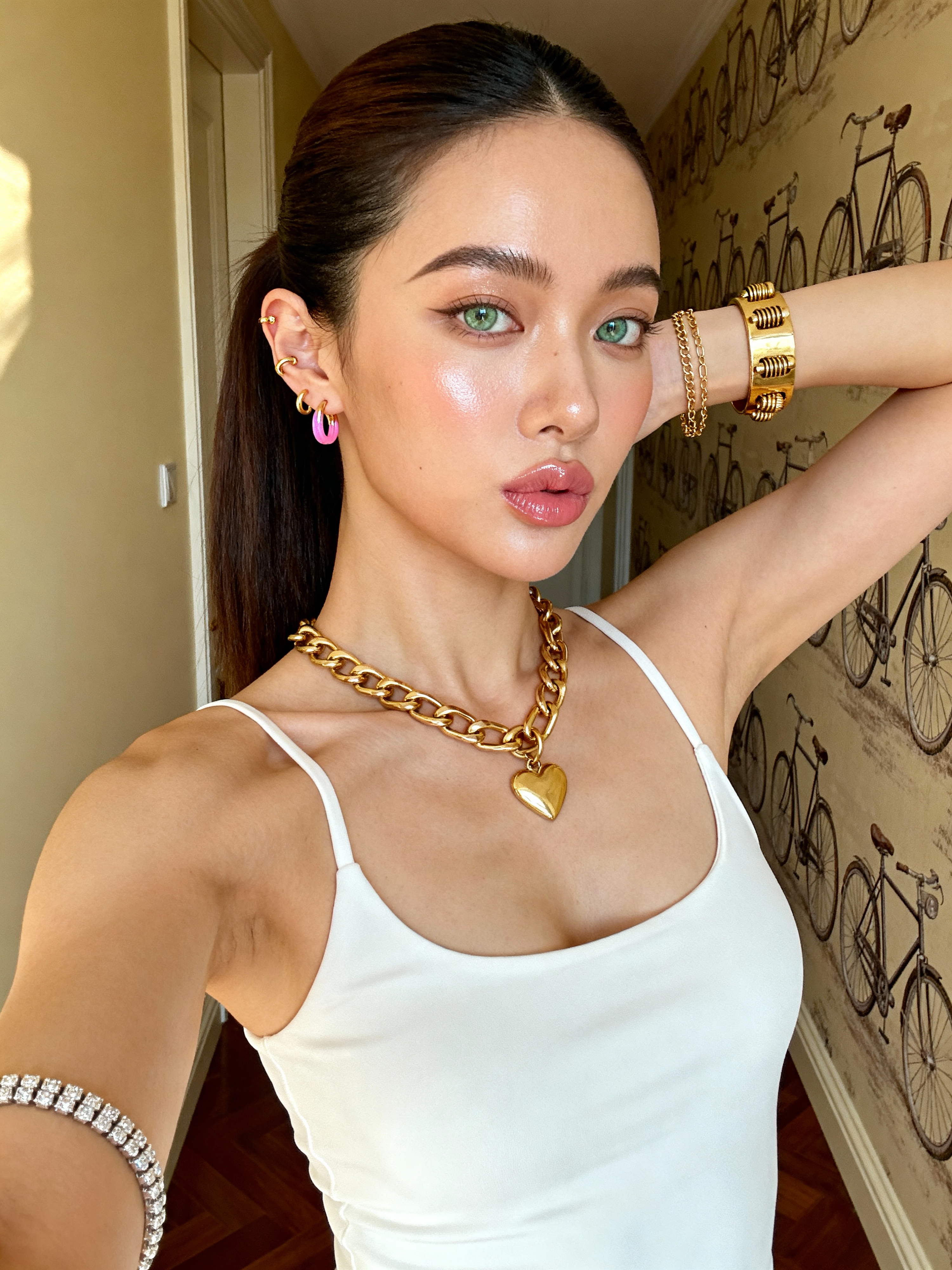 {"subject": {"description": "young model with a fit, slender build", "hair": "Dark brown to hair, styled in a sleek, tight ponytail with a middle part", "eyes": "Light green or hazel, striking and clear", "skin": " with a radiant, dewy finish", "expression": "Neutral to slight pout, soft and alluring gaze looking directly at the camera", "pose": "Selfie angle, one arm extended holding the camera, the other arm raised with hand touching the back of the head/neck area"}, "attire": {"clothing": "White, tight-fitting spaghetti strap tank top ", "style": "Casual, loungewear, clean aesthetic"}, "accessories": {"neck": "Gold chain necklace with a medium-sized heart pendant", "ears": "Multiple ear piercings; small gold hoops and pink/purple huggie if(gender=f){hoop earrings } ", "wrists": "Stacked bracelets on the left wrist including a gold screw-motif bangle (Cartier style), a diamond tennis bracelet, and delicate gold chains", "fingers": "Multiple gold rings stacked on the left hand"}, "makeup": {"style": "Natural glam / clean model aesthetic", "details": "Defined eyebrows, highlighter on cheekbones and tip of the nose, glossy nude-pink lips, subtle mascara"}, "environment": {"location": "Indoor hallway or bedroom", "background": "Wallpaper featuring a repeating pattern of vintage bicycles, door frame, cream-colored walls, glimpse of wooden flooring", "lighting": "Soft, warm artificial indoor lighting, creating a golden hour glow effect on the skin"}, "technical_specs": {"resolution": "4K Ultra HD", "quality": "Photorealistic, highly detailed textures, sharp focus", "camera_angle": "Eye-level selfie perspective", "style": "Influencer selfie, candid, high-end lifestyle photography"}}