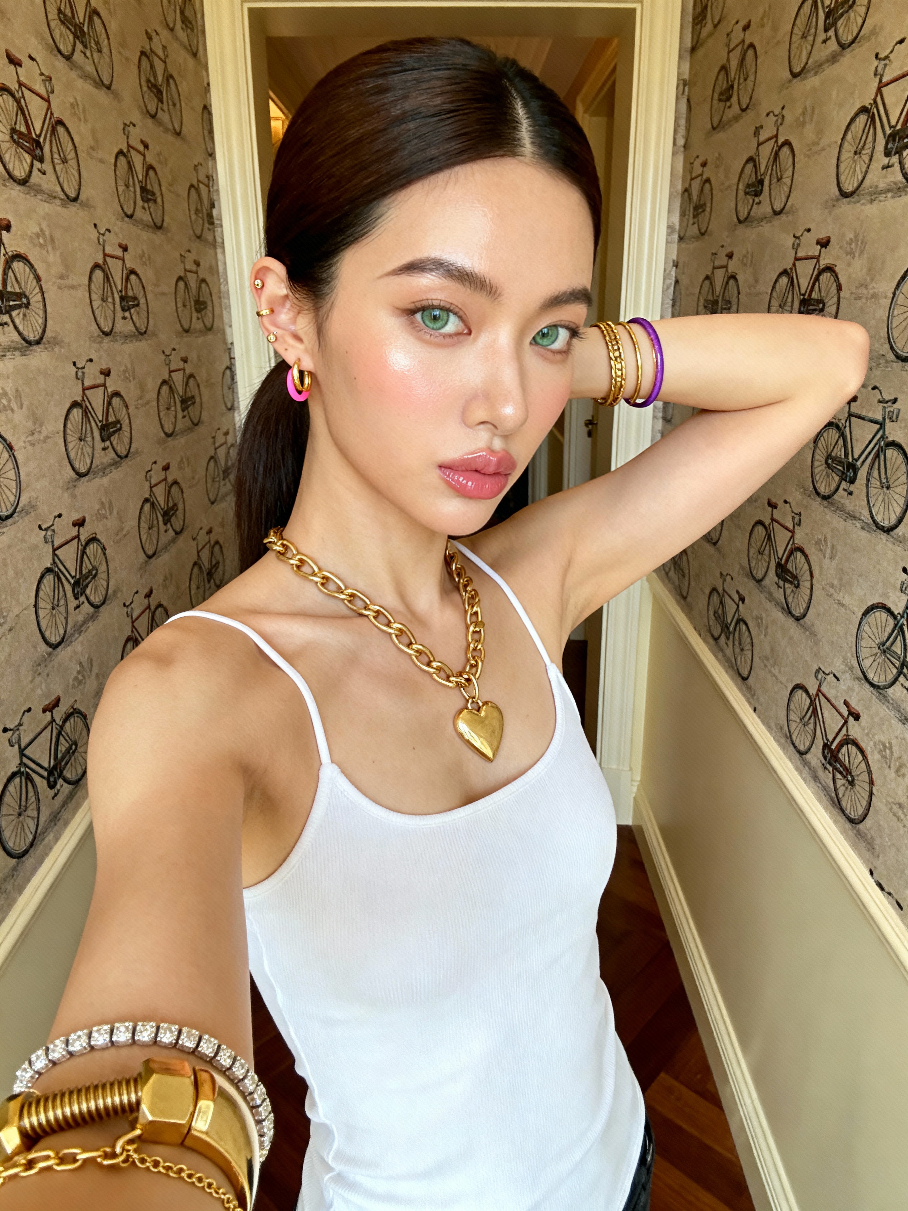 {"subject": {"description": "young model with a fit, slender build", "hair": "Dark brown to hair, styled in a sleek, tight ponytail with a middle part", "eyes": "Light green or hazel, striking and clear", "skin": " with a radiant, dewy finish", "expression": "Neutral to slight pout, soft and alluring gaze looking directly at the camera", "pose": "Selfie angle, one arm extended holding the camera, the other arm raised with hand touching the back of the head/neck area"}, "attire": {"clothing": "White, tight-fitting spaghetti strap tank top ", "style": "Casual, loungewear, clean aesthetic"}, "accessories": {"neck": "Gold chain necklace with a medium-sized heart pendant", "ears": "Multiple ear piercings; small gold hoops and pink/purple huggie if(gender=f){hoop earrings } ", "wrists": "Stacked bracelets on the left wrist including a gold screw-motif bangle (Cartier style), a diamond tennis bracelet, and delicate gold chains", "fingers": "Multiple gold rings stacked on the left hand"}, "makeup": {"style": "Natural glam / clean model aesthetic", "details": "Defined eyebrows, highlighter on cheekbones and tip of the nose, glossy nude-pink lips, subtle mascara"}, "environment": {"location": "Indoor hallway or bedroom", "background": "Wallpaper featuring a repeating pattern of vintage bicycles, door frame, cream-colored walls, glimpse of wooden flooring", "lighting": "Soft, warm artificial indoor lighting, creating a golden hour glow effect on the skin"}, "technical_specs": {"resolution": "4K Ultra HD", "quality": "Photorealistic, highly detailed textures, sharp focus", "camera_angle": "Eye-level selfie perspective", "style": "Influencer selfie, candid, high-end lifestyle photography"}}