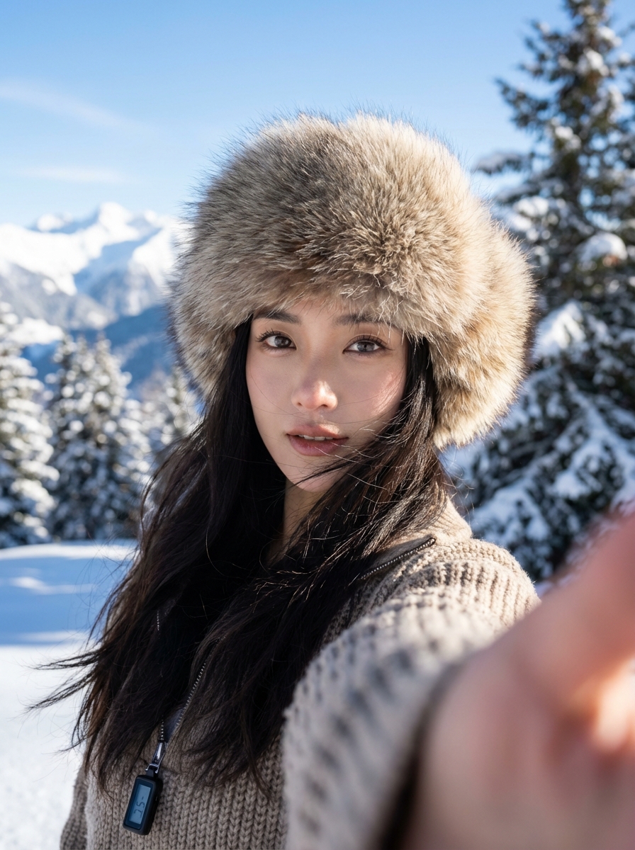 {"subject": {"reference_adherence": {"instruction": "Keep facial features, bone structure, skin tone, and hairstyle 100% identical to original image", "constraints": "Do not change face shape, identity, or expression", "details": "Preserve realistic skin texture and pores; maintain natural proportions"}, "demographics": "model, early 20s", "pose": "Close-up portrait, selfie perspective with arm extended toward viewer, no phone or camera visible", "hair": "Flowing, ripples softly in chilly breeze", "eyes": "Gleaming sharply", "makeup": "Natural, accentuating lips"}, "attire": {"headwear": "Voluminous fur hat", "clothing": "top"}, "environment": {"setting": "Outdoors, snowy mountain landscape", "background": "Pine trees laden with glistening snow", "sky": "Clear blue", "weather": "Crisp daylight, chilly mountain breeze"}, "lighting": {"source": "Bright sunlight", "quality": "Sculpting highlights, gentle soft shadows", "color_palette": "Cool whites and blues of winter landscape contrasted with warm hair tones"}, "technical": {"aspect_ratio": "3:4", "focus": "Shallow depth of field, delicately blurred background", "style": "Modern, naturalistic, rich tactile detail, authentic outdoor clarity", "camera_gear": {"body": "Sony Alpha a7R V mirrorless digital camera", "lens": "Sony FE 35mm f/1.4 GM lens"}, "shot_settings": {"aperture": "f/1.4", "shutter_speed": "1/4000s", "iso": "100", "format": "RAW unprocessed"}}}