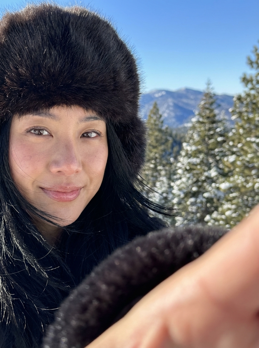 {"subject": {"reference_adherence": {"instruction": "Keep facial features, bone structure, skin tone, and hairstyle 100% identical to original image", "constraints": "Do not change face shape, identity, or expression", "details": "Preserve realistic skin texture and pores; maintain natural proportions"}, "demographics": "model, early 20s", "pose": "Close-up portrait, selfie perspective with arm extended toward viewer, no phone or camera visible", "hair": "Flowing, ripples softly in chilly breeze", "eyes": "Gleaming sharply", "makeup": "Natural, accentuating lips"}, "attire": {"headwear": "Voluminous fur hat", "clothing": "top"}, "environment": {"setting": "Outdoors, snowy mountain landscape", "background": "Pine trees laden with glistening snow", "sky": "Clear blue", "weather": "Crisp daylight, chilly mountain breeze"}, "lighting": {"source": "Bright sunlight", "quality": "Sculpting highlights, gentle soft shadows", "color_palette": "Cool whites and blues of winter landscape contrasted with warm hair tones"}, "technical": {"aspect_ratio": "3:4", "focus": "Shallow depth of field, delicately blurred background", "style": "Modern, naturalistic, rich tactile detail, authentic outdoor clarity", "camera_gear": {"body": "Sony Alpha a7R V mirrorless digital camera", "lens": "Sony FE 35mm f/1.4 GM lens"}, "shot_settings": {"aperture": "f/1.4", "shutter_speed": "1/4000s", "iso": "100", "format": "RAW unprocessed"}}}
