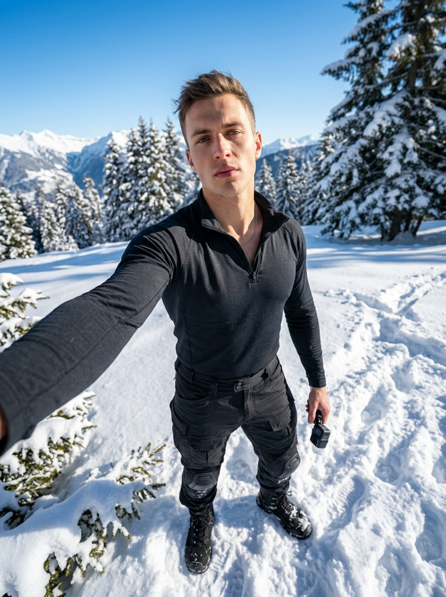{"subject": {"reference_adherence": {"instruction": "Keep facial features, bone structure, skin tone, and hairstyle 100% identical to original image", "constraints": "Do not change face shape, identity, or expression basics", "details": "Preserve realistic skin texture; maintain natural proportions"}, "demographics": "male model, early 20s", "pose": "Close-up portrait, selfie perspective, head tilted slightly back, confident and intense gaze ('hot look')", "hair": "Short, tousled slightly by the breeze", "eyes": "Intense, gleaming sharply, looking directly at the viewer", "makeup": "Groomed skin with light stubble, natural lips"}, "attire": {"headwear": "None (or tactical headset if preferred, otherwise wind-swept hair)", "clothing": "Sleek, form-fitting tactical winter uniform fitted shirt, unzipped slightly at the collar, high-tech fabric texture", "accessories": "Minimalist silver chain"}, "environment": {"setting": "Outdoors, snowy mountain landscape", "background": "Pine trees laden with glistening snow, soft bokeh", "sky": "Clear blue", "weather": "Crisp daylight, chilly mountain breeze"}, "lighting": {"source": "Bright sunlight", "quality": "High-contrast sculpting highlights, accentuating facial structure", "color_palette": "Cool winter blues vs. warm skin tones and sleek fabric"}, "technical": {"aspect_ratio": "3:4", "focus": "Sharp focus on eyes and lips, creamy blurred background", "style": "Modern, naturalistic, highly detailed, visually striking", "camera_gear": {"body": "Sony Alpha a7R V", "lens": "Sony FE 35mm f/1.4 GM"}, "shot_settings": {"aperture": "f/1.8", "shutter_speed": "1/4000s", "iso": "100", "format": "RAW"}}}}