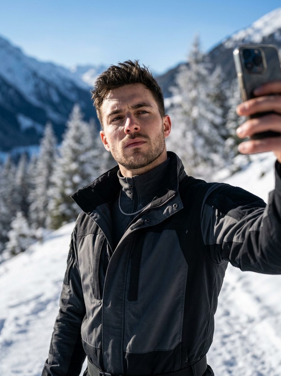 {"subject": {"reference_adherence": {"instruction": "Keep facial features, bone structure, skin tone, and hairstyle 100% identical to original image", "constraints": "Do not change face shape, identity, or expression basics", "details": "Preserve realistic skin texture; maintain natural proportions"}, "demographics": "male model, early 20s", "pose": "Close-up portrait, selfie perspective, head tilted slightly back, confident and intense gaze ('hot look')", "hair": "Short, tousled slightly by the breeze", "eyes": "Intense, gleaming sharply, looking directly at the viewer", "makeup": "Clean groomed skin with light stubble, natural lips"}, "attire": {"headwear": "None (or tactical headset if preferred, otherwise wind-swept hair)", "clothing": "Sleek, form-fitting tactical winter uniform, fitted shirt, unzipped slightly at the collar, high-tech fabric texture", "accessories": "Minimalist silver chain"}, "environment": {"setting": "Outdoors, snowy mountain landscape", "background": "Pine trees laden with glistening snow, soft bokeh", "sky": "Clear blue", "weather": "Crisp daylight, chilly mountain breeze"}, "lighting": {"source": "Bright sunlight", "quality": "High-contrast sculpting highlights, accentuating facial structure", "color_palette": "Cool winter blues vs. warm skin tones and sleek fabric"}, "technical": {"aspect_ratio": "3:4", "focus": "Sharp focus on eyes and lips, creamy blurred background", "style": "Modern, naturalistic, highly detailed, visually striking", "camera_gear": {"body": "Sony Alpha a7R V", "lens": "Sony FE 35mm f/1.4 GM"}, "shot_settings": {"aperture": "f/1.8", "shutter_speed": "1/4000s", "iso": "100", "format": "RAW"}}}}