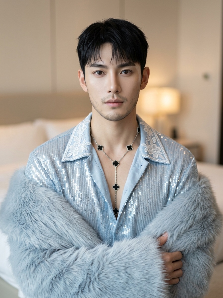 {"subject": {"type": "stunning_east_asian_man_with_kpop_idol_aesthetic", "framing": "medium_shot_waist_up_portrait", "age_vibe": "youthful_and_elegant_early_20s_sophisticated_atmosphere", "features": {"face_structure": "sharp_angular_face_with_refined_features_and_strong_jawline", "eyes": "large_expressive_dark_brown_eyes_with_an_intense_confident_gaze_looking_at_camera", "nose": "slim_and_straight_refined_nose_bridge", "hair": "chic_short_black_crop_silky_and_textured_with_light_airy_see_through_bangs", "expression": "serene_and_intense_with_light_stubble_gentle_captivating_look"}}, "skin_texture": {"description": "pale_smooth_porcelain_skin_with_a_dewy_natural_glow", "details": ["flawless_skin_texture", "soft_natural_skin_pores", "subtle_neutral_undertones"], "makeup": "clean_groomed_skin_light_stubble_groomed_eyebrows"}, "pose_structural_lock": {"overall": "relaxed_and_centered_frontal_pose", "arms": "arms_wrapped_in_voluminous_fur_held_softly_at_the_sides", "hands": "hands_partially_hidden_within_the_plush_fur_texture", "shoulders": "broad_and_strong_shoulders_partially_covered_by_fur"}}, "apparel_specification": {"dress_top": {"material": "shimmering_pale_blue_sequined_fabric_catching_the_light", "neckline": "deep_open_collar_adorned_with_intricate_white_floral_embroidery_trim", "straps": "no_straps", "center_detail": "structured_chest_with_layered_embroidery_accents_and_sparkling_sequins", "fit": "slim_fit_elegant_dress_shirt_style"}, "accessories": {"neck": "silver_chain_necklace_with_multiple_black_four_leaf_clover_pendants_van_cleef_style", "outerwear": "voluminous_and_fluffy_light_blue_grey_faux_fur_stole_wrapped_around_arms", "jewelry_detail": "the_necklace_drapes_elegantly_down_the_center_of_the_chest"}}, "environment": {"setting": "luxurious_modern_indoor_setting_likely_a_high_end_bedroom", "lighting": "soft_diffused_ambient_lighting_with_a_warm_bokeh_glow_from_a_lamp_in_background", "background": "creamy_neutral_tones_softly_blurred_bed_headboard_and_minimalist_decor"}, "realism_and_rendering": {"style": "high_end_fashion_photography_candid_style", "camera": "Sony_A7RIV_85mm_f1.8_lens_shallow_depth_of_field", "image_quality": "8k_resolution_masterpiece_photorealistic_textures_sharp_focus_on_subject", "aspect_ratio": "3:4"}}}