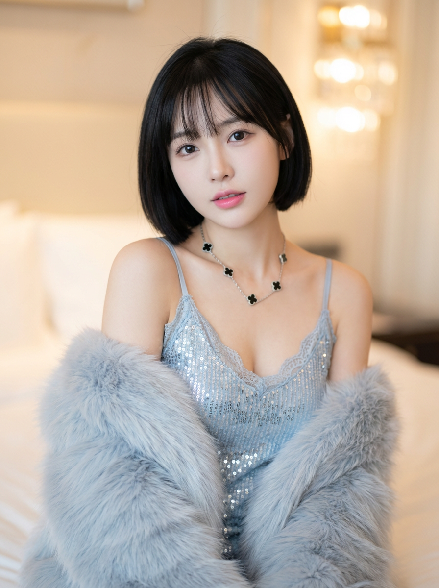 {"subject": {"type": "stunning_east_asian_woman_with_kpop_idol_aesthetic", "framing": "medium_shot_waist_up_portrait", "age_vibe": "youthful_and_elegant_early_20s_sophisticated_atmosphere", "features": {"face_structure": "delicate_v_shaped_face_with_refined_features_and_slender_jawline", "eyes": "large_expressive_dark_brown_eyes_with_a_soft_alluring_gaze_looking_at_camera", "nose": "slim_and_straight_refined_nose_bridge", "hair": "chic_short_black_bob_silky_and_straight_with_light_airy_see_through_bangs", "expression": "serene_and_dreamy_with_slight_parted_pink_lips_gentle_captivating_look"}, "skin_texture": {"description": "pale_translucent_porcelain_skin_with_a_dewy_natural_glow", "details": ["flawless_skin_texture", "soft_natural_skin_pores", "subtle_pinkish_undertones"], "makeup": "soft_glam_makeup_nude_pink_lip_gloss_delicate_eyeliner_and_groomed_eyebrows"}, "pose_structural_lock": {"overall": "relaxed_and_centered_frontal_pose", "arms": "arms_wrapped_in_voluminous_fur_held_softly_at_the_sides", "hands": "hands_partially_hidden_within_the_plush_fur_texture", "shoulders": "slender_and_graceful_shoulders_partially_covered_by_fur"}}, "apparel_specification": {"dress_top": {"material": "shimmering_pale_blue_sequined_fabric_catching_the_light", "neckline": "deep_v_neckline_adorned_with_intricate_white_floral_lace_trim", "straps": "thin_delicate_light_blue_spaghetti_straps", "center_detail": "structured_bodice_with_layered_lace_accents_and_sparkling_sequins", "fit": "slim_fit_elegant_camisole_style"}, "accessories": {"neck": "silver_chain_necklace_with_multiple_black_four_leaf_clover_pendants_van_cleef_style", "outerwear": "voluminous_and_fluffy_light_blue_grey_faux_fur_stole_wrapped_around_arms", "jewelry_detail": "the_necklace_drapes_elegantly_down_the_center_of_the_chest"}}, "environment": {"setting": "luxurious_modern_indoor_setting_likely_a_high_end_bedroom", "lighting": "soft_diffused_ambient_lighting_with_a_warm_bokeh_glow_from_a_lamp_in_background", "background": "creamy_neutral_tones_softly_blurred_bed_headboard_and_minimalist_decor"}, "realism_and_rendering": {"style": "high_end_fashion_photography_candid_style", "camera": "Sony_A7RIV_85mm_f1.8_lens_shallow_depth_of_field", "image_quality": "8k_resolution_masterpiece_photorealistic_textures_sharp_focus_on_subject", "aspect_ratio": "3:4"}}