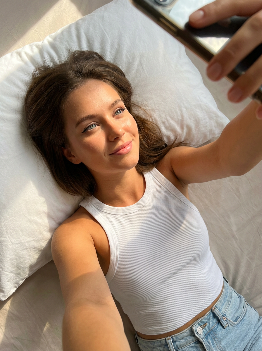 {"subject": {"type": "young model", "pose": "lying on her back, taking a selfie with her right arm extended upward", "expression": "soft smile, relaxed and natural", "gaze": "looking toward the camera", "skin_details": {"complexion": "smooth, warm, sunlit glow", "freckles": "visible on nose and cheeks"}, "hair": {"color": "medium brown", "length": "long", "style": "loose, spread out on the pillow around her head"}, "eyes": {"color": "light blue or green", "makeup": "subtle eyeliner"}}, "clothing": {"top": {"type": "ribbed tank top", "color": "white", "fit": "form-fitting", "neckline": "scoop neck"}, "bottoms": {"type": "jeans", "color": "light blue", "visibility": "partially visible"}, "accessories": {"earrings": "small studs", "necklace": "thin, minimal chain"}}, "environment": {"location": "bed or soft resting surface", "bedding": {"pillow": "white", "sheets": "white"}, "background": "neutral wall and edge of headboard or furniture barely visible"}, "lighting": {"type": "natural sunlight", "direction": "coming from upper left of frame", "effect": "creates warm highlights and soft shadows on face and torso"}, "composition": {"camera_angle": "top-down selfie angle", "framing": "close-up of face, upper torso, and part of jeans", "focus": "sharp on face and upper body", "colors": "warm skin tones, white bedding, brown hair, neutral background"}, "mood": "warm, relaxed, comfortable, natural"}