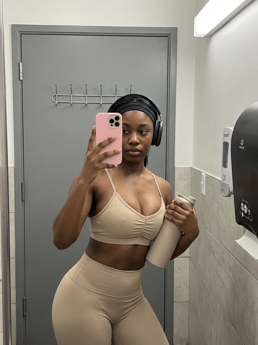 {"subject": "young model with and dark hair slicked back under a fabric headband , wearing large over-ear headphones. She is dressed in a matching beige or sand-colored activewear set consisting of a low-cut sports bra with spaghetti straps and a gathered, ruched detail at the center of the chest, and high-waisted leggings . The subject possesses a very full, prominent bust with deep cleavage visible, the fabric of the top stretching to accommodate the heavy volume and natural projection of the chest. She holds a large, matte cylindrical water bottle tucked against her right side with her right arm.", "pose": "Standing mirror selfie pose. The body is angled slightly to the right, with hips shifted to create a curve in the waist. The head is tilted slightly to the left, looking directly into the mirror (at the phone). The right arm is bent, clutch ing the water bottle against the torso. The left arm is raised, hand holding a smartphone with a pink textured case to capture the reflection.", "environment": "A stark, utilitarian bathroom or locker room setting. Directly behind the subject is a flat grey door featuring a horizontal coat rack with multiple hooks. To the right, a wall with square tiles is visible, mounted with a automatic air freshener or soap dispenser and a circular paper towel dispenser. The door has silver hinges and a silver handle.", "camera": "Mirror selfie perspective captured via a smartphone reflection. The shot includes the phone itself (an iPhone Pro model with a pink bubble-textured case) held in the subject's left hand. The framing is a medium shot capturing the subject from the thighs up to the top of the door frame. The focus is sharp on the subject, with the background elements clearly defined.", "lighting": "Bright, overhead artificial lighting typical of a commercial bathroom or locker room. The light source creates distinct specular highlights on the subject's forehead, the curve of the chest, and the shoulders. Shadows are relatively soft but defined, falling under the chin and the bust , emphasizing volume and depth.", "mood_and_expression": "Casual, focused, and confident. The expression is neutral to slightly serious, focused on the phone screen for the photo. The vibe is a 'post-workout' or 'gym fit' check.", "style_and_realism": "Hyper-realistic raw photography. High fidelity to skin texture, fabric tension, and environmental details. No stylization or artistic filtering; resembles a high-resolution social media snapshot.", "colors_and_tone": "Neutral color palette dominated by greys, whites, and the beige/sand tone of the outfit. The. Accents include the headphones/hooks and the pink phone case. Contrast is moderate with natural indoor balance.", "quality_and_technical_details": "High resolution, sharp focus, natural grain. Detailed textures on the matte water bottle, the fabric of the sports bra , and the smooth finish of the grey door.", "aspect_ratio_and_output": "3:4", "controlnet": {"pose_control": {"woman_type": "DWPose", "purpose": "Exact skeletal and pose lock", "constraints": ["preserve arm position holding water bottle", "preserve raised arm holding phone", "preserve hip tilt", "preserve head tilt"], "recommended_weight": 1}, "depth_control": {"woman_type": "ZoeDepth", "purpose": "Depth, volume, and camera-to-body spatial lock", "constraints": ["maintain distance between subject and grey door", "preserve volumetric projection of chest", "ensure phone is positioned correctly in depth relative to body"], "recommended_weight": 0.8}}, "negative_prompt": {"anatomy_restrictions": ["anatomy normalization", "body proportion averaging", "smaller bust than reference", "reduced chest volume", "flattened or compressed breasts", "tightened or lifted breasts", "slimmed torso", "aesthetic proportion correction"], "photography_restrictions": ["professional studio lighting", "bokeh", "wide-angle distortion", "lens compression", "cropping that removes volume", "beautification filters", "skin smoothing", "plastic skin"], "general_restrictions": ["stylized realism", "editorial fashion proportions", "naturalization of prominent features", "missing phone", "missing headphones", "missing water bottle"]}}