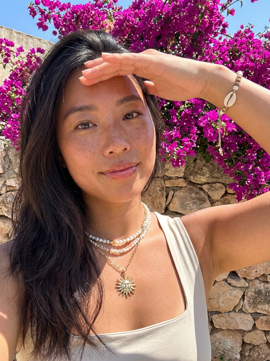 {"subject": "young model with sun-kissed, and visible freckles across the nose and cheeks. Long, straight hair with natural dark roots showing, draped over the left shoulder. She has blue-green eyes, defined eyelashes, and glossy lips . She is wearing a square-neck top with wide straps that emphasizes full, heavy bust volume with natural gravity and clear cleavage . Accessories include layered necklaces: a tight pearl choker, a second strand of irregular pearls, and a gold chain with a large sun pendant and a small starfish charm. Her right wrist is adorned with multiple beaded bracelets, including one with a large cowrie shell and green beads. Skin texture shows natural pores and imperfections.", "pose": "Close-up portrait framing from the mid-chest upwards. The body is angled slightly, while the face is turned directly to the camera with a slight tilt to the right. Her right arm is raised, elbow out of frame, with her hand resting gently near her forehead and hairline, shielding from the sun or posing. Fingers are relaxed with long, manicured nails. The expression is a soft, closed-mouth smile, conveying a relaxed and happy demeanor.", "environment": "Outdoor summer setting against a rustic stone wall composed of irregular, warm-toned rocks. The wall is heavily adorned with vibrant magenta bougainvillea flowers and deep green leaves, creating a colorful and textured backdrop.", "camera": "Selfie-style perspective, close-up shot (approx. 24-35mm focal length). The framing captures the subject from the chest up, maintaining strong foreground presence. Sharp focus on the face and jewelry, with a slight depth of field falling off towards the stone wall and flowers in the background.", "lighting": "Bright, direct natural sunlight coming from the upper left. The light creates high contrast, casting distinct shadows under the chin, nose, and breast area, highlighting the contours of the face and the volume of the chest. Subsurface scattering is visible on the skin in the bright light.", "mood_and_expression": "Sunny, cheerful, vacation atmosphere. The expression is warm and inviting, evoking a sense of summer relaxation and confidence.", "style_and_realism": "Photorealistic, high-fidelity smartphone photography style. Unfiltered, authentic look with emphasis on natural skin textures, lighting interaction, and sharp details on accessories.", "colors_and_tone": "High saturation and contrast. Dominant colors include the warm tan of the skin, the bright of the top, the vibrant magenta/purple of the flowers, and the earthy orange-browns of the stone wall.", "quality_and_technical_details": "4k resolution, highly detailed textures, sharp focus, correct exposure for bright daylight, accurate color reproduction of skin and flora.", "aspect_ratio_and_output": "3:4 vertical aspect ratio.", "controlnet": {"pose_control": {"woman_type": "OpenPose", "purpose": "Exact skeletal and pose lock", "constraints": ["preserve shoulder width", "preserve hip angle", "preserve spine curvature", "preserve limb placement"], "recommended_weight": 1}, "depth_control": {"woman_type": "MiDaS", "purpose": "Depth, volume, and camera-to-body spatial lock", "constraints": ["preserve chest foreground dominance if present", "prevent flat or compressed depth", "maintain clear torso-to-background separation"], "recommended_weight": 0.8}}, "negative_prompt": {"forbidden_elements": ["anatomy normalization", "body proportion averaging", "smaller bust than reference", "reduced chest volume", "flattened or compressed breasts", "tightened, lifted, or artificially supported breasts", "slimmed torso", "aesthetic proportion correction", "beauty standard enforcement", "dataset-average model anatomy", "camera angles that reduce volume", "wide-angle distortion not in reference", "lens compression not in reference", "cropping that removes volume", "depth flattening", "phone-in-hand selfies", "reflections", "beautification filters", "skin smoothing", "plastic skin", "airbrushed texture", "stylized realism", "editorial fashion proportions", "more realistic reinterpretation", "naturalization of prominent features"]}}