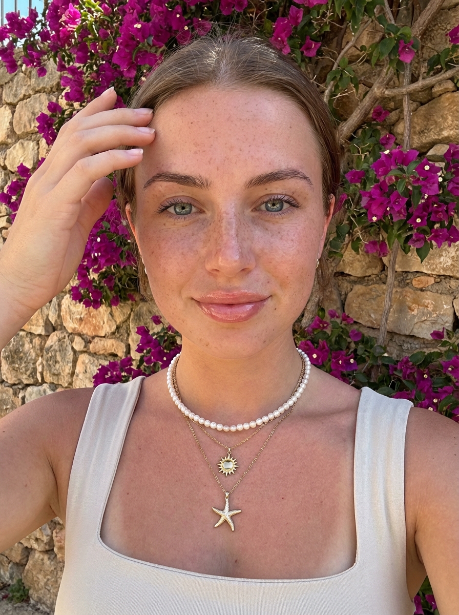 {"subject": "young model with sun-kissed, and visible freckles across the nose and cheeks. Long, straight hair with natural dark roots showing, draped over the left shoulder. She has blue-green eyes, defined eyelashes, and glossy lips . She is wearing a square-neck top with wide straps that emphasizes full, heavy bust volume with natural gravity and clear cleavage . Accessories include layered necklaces: a tight pearl choker, a second strand of irregular pearls, and a gold chain with a large sun pendant and a small starfish charm. Her right wrist is adorned with multiple beaded bracelets, including one with a large cowrie shell and green beads. Skin texture shows natural pores and imperfections.", "pose": "Close-up portrait framing from the mid-chest upwards. The body is angled slightly, while the face is turned directly to the camera with a slight tilt to the right. Her right arm is raised, elbow out of frame, with her hand resting gently near her forehead and hairline, shielding from the sun or posing. Fingers are relaxed with long, manicured nails. The expression is a soft, closed-mouth smile, conveying a relaxed and happy demeanor.", "environment": "Outdoor summer setting against a rustic stone wall composed of irregular, warm-toned rocks. The wall is heavily adorned with vibrant magenta bougainvillea flowers and deep green leaves, creating a colorful and textured backdrop.", "camera": "Selfie-style perspective, close-up shot (approx. 24-35mm focal length). The framing captures the subject from the chest up, maintaining strong foreground presence. Sharp focus on the face and jewelry, with a slight depth of field falling off towards the stone wall and flowers in the background.", "lighting": "Bright, direct natural sunlight coming from the upper left. The light creates high contrast, casting distinct shadows under the chin, nose, and breast area, highlighting the contours of the face and the volume of the chest. Subsurface scattering is visible on the skin in the bright light.", "mood_and_expression": "Sunny, cheerful, vacation atmosphere. The expression is warm and inviting, evoking a sense of summer relaxation and confidence.", "style_and_realism": "Photorealistic, high-fidelity smartphone photography style. Unfiltered, authentic look with emphasis on natural skin textures, lighting interaction, and sharp details on accessories.", "colors_and_tone": "High saturation and contrast. Dominant colors include the warm tan of the skin, the bright of the top, the vibrant magenta/purple of the flowers, and the earthy orange-browns of the stone wall.", "quality_and_technical_details": "4k resolution, highly detailed textures, sharp focus, correct exposure for bright daylight, accurate color reproduction of skin and flora.", "aspect_ratio_and_output": "3:4 vertical aspect ratio.", "controlnet": {"pose_control": {"woman_type": "OpenPose", "purpose": "Exact skeletal and pose lock", "constraints": ["preserve shoulder width", "preserve hip angle", "preserve spine curvature", "preserve limb placement"], "recommended_weight": 1}, "depth_control": {"woman_type": "MiDaS", "purpose": "Depth, volume, and camera-to-body spatial lock", "constraints": ["preserve chest foreground dominance if present", "prevent flat or compressed depth", "maintain clear torso-to-background separation"], "recommended_weight": 0.8}}, "negative_prompt": {"forbidden_elements": ["anatomy normalization", "body proportion averaging", "smaller bust than reference", "reduced chest volume", "flattened or compressed breasts", "tightened, lifted, or artificially supported breasts", "slimmed torso", "aesthetic proportion correction", "beauty standard enforcement", "dataset-average model anatomy", "camera angles that reduce volume", "wide-angle distortion not in reference", "lens compression not in reference", "cropping that removes volume", "depth flattening", "phone-in-hand selfies", "reflections", "beautification filters", "skin smoothing", "plastic skin", "airbrushed texture", "stylized realism", "editorial fashion proportions", "more realistic reinterpretation", "naturalization of prominent features"]}}