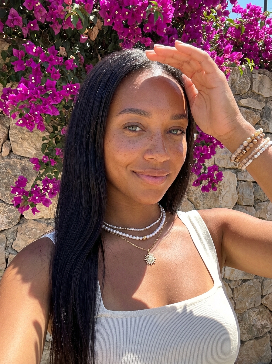 {"subject": "young model with sun-kissed, and visible freckles across the nose and cheeks. Long, straight hair with natural dark roots showing, draped over the left shoulder. She has blue-green eyes, defined eyelashes, and glossy lips . She is wearing a square-neck top with wide straps that emphasizes full, heavy bust volume with natural gravity and clear cleavage . Accessories include layered necklaces: a tight pearl choker, a second strand of irregular pearls, and a gold chain with a large sun pendant and a small starfish charm. Her right wrist is adorned with multiple beaded bracelets, including one with a large cowrie shell and green beads. Skin texture shows natural pores and imperfections.", "pose": "Close-up portrait framing from the mid-chest upwards. The body is angled slightly, while the face is turned directly to the camera with a slight tilt to the right. Her right arm is raised, elbow out of frame, with her hand resting gently near her forehead and hairline, shielding from the sun or posing. Fingers are relaxed with long, manicured nails. The expression is a soft, closed-mouth smile, conveying a relaxed and happy demeanor.", "environment": "Outdoor summer setting against a rustic stone wall composed of irregular, warm-toned rocks. The wall is heavily adorned with vibrant magenta bougainvillea flowers and deep green leaves, creating a colorful and textured backdrop.", "camera": "Selfie-style perspective, close-up shot (approx. 24-35mm focal length). The framing captures the subject from the chest up, maintaining strong foreground presence. Sharp focus on the face and jewelry, with a slight depth of field falling off towards the stone wall and flowers in the background.", "lighting": "Bright, direct natural sunlight coming from the upper left. The light creates high contrast, casting distinct shadows under the chin, nose, and breast area, highlighting the contours of the face and the volume of the chest. Subsurface scattering is visible on the skin in the bright light.", "mood_and_expression": "Sunny, cheerful, vacation atmosphere. The expression is warm and inviting, evoking a sense of summer relaxation and confidence.", "style_and_realism": "Photorealistic, high-fidelity smartphone photography style. Unfiltered, authentic look with emphasis on natural skin textures, lighting interaction, and sharp details on accessories.", "colors_and_tone": "High saturation and contrast. Dominant colors include the warm tan of the skin, the bright of the top, the vibrant magenta/purple of the flowers, and the earthy orange-browns of the stone wall.", "quality_and_technical_details": "4k resolution, highly detailed textures, sharp focus, correct exposure for bright daylight, accurate color reproduction of skin and flora.", "aspect_ratio_and_output": "3:4 vertical aspect ratio.", "controlnet": {"pose_control": {"woman_type": "OpenPose", "purpose": "Exact skeletal and pose lock", "constraints": ["preserve shoulder width", "preserve hip angle", "preserve spine curvature", "preserve limb placement"], "recommended_weight": 1}, "depth_control": {"woman_type": "MiDaS", "purpose": "Depth, volume, and camera-to-body spatial lock", "constraints": ["preserve chest foreground dominance if present", "prevent flat or compressed depth", "maintain clear torso-to-background separation"], "recommended_weight": 0.8}}, "negative_prompt": {"forbidden_elements": ["anatomy normalization", "body proportion averaging", "smaller bust than reference", "reduced chest volume", "flattened or compressed breasts", "tightened, lifted, or artificially supported breasts", "slimmed torso", "aesthetic proportion correction", "beauty standard enforcement", "dataset-average model anatomy", "camera angles that reduce volume", "wide-angle distortion not in reference", "lens compression not in reference", "cropping that removes volume", "depth flattening", "phone-in-hand selfies", "reflections", "beautification filters", "skin smoothing", "plastic skin", "airbrushed texture", "stylized realism", "editorial fashion proportions", "more realistic reinterpretation", "naturalization of prominent features"]}}