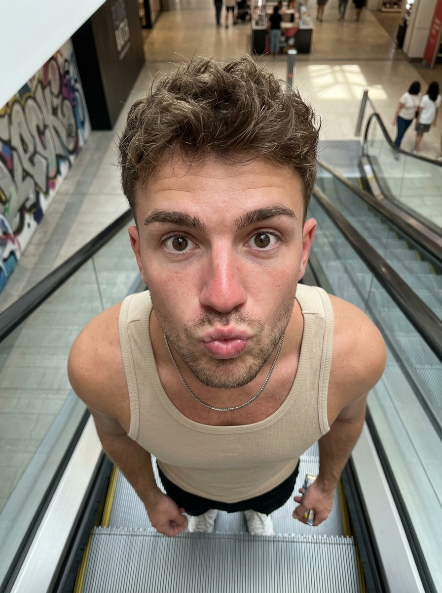 {"subject":{"description":"A close-up, extreme high-angle selfie of a young model with a playful expression, standing on an escalator.","mirror_rules":"None (direct lens high-angle distortion)","age":"20s","expression":{"eyes":{"look":"Wide open, looking directly upward into the lens","energy":"Bright, engaging, cheeky","direction":"Upward"},"mouth":{"position":"Exaggerated smirking lips, playful kissy face","energy":"Playful, fun, silly"},"overall":"Quirky, fun-loving, Gen Z 0.5x selfie aesthetic"},"face":{"preserve_original":true,"makeup":"Fresh face, light stubble, natural flush on nose tip and cheeks (strawberry or cold model look), groomed brows"},"hair":{"style":"Short, tousled, textured crop, slightly messy roots","effect":"Natural flow, top of head due to angle"},"body":{"frame":"Foreshortened perspective (large head, small body)","waist":"Not ","chest":" upper chest from top-down view","legs":"Not ","skin":{"visible_areas":"Face, neck, chest, arms","tone":"Fair to light","texture":"Smooth, natural skin texture","lighting_effect":"Soft even illumination"}},"pose":{"position":"Standing, leaning forward confidently","base":"Standing on an escalator","overall":"Leaning in towards the camera lens from below"},"clothing":{"top":{"type":"Fitted tank top","color":"Beige \/ Cream","details":"Simple tight fit, square neckline","effect":"Casual summer vibe"},"bottom":{"type":"Trousers","details":"Barely at bottom edge"}},"accessories":{"jewelry":"Thin silver chain (faint)","prop":"Holding a small bottle (chapstick or vape) in hand; no hair accessory; minimal accessories"},"photography":{"camera_style":"Smartphone 0.5x wide-angle aesthetic","angle":"Extreme high angle \/ Top-down \/ Bird's eye view","shot_type":"Close-up selfie, distorted perspective","aspect_ratio":"4:5","texture":"Digital social media quality, sharp facial details","lighting":"Bright overhead indoor mall lighting","depth_of_field":"Moderate depth (background slightly soft but recognizable)"},"background":{"setting":"Indoor escalator","wall_color":"with abstract graffiti\/art (left)","elements":["Silver grooved escalator steps descending behind","handrail","Partial view of another person in background (top right)"],"atmosphere":"Public, busy shopping mall, dynamic transit","lighting":"Diffuse artificial light"},"the_vibe":{"energy":"Spontaneous, youthful, humorous","mood":"Playful","aesthetic":"Gen Z photo dump, fish-eye lens effect, candid snapshot","authenticity":"High, looks like an unfiltered moment","intimacy":"Friend-POV","story":"A goofy moment captured mid-shopping trip on the escalator","caption_energy":"Escalator antics with besties \u270c\ufe0f\ud83d\ude17"},"constraints":{"must_keep":["Extreme high angle perspective"," \/kissy face expression","Escalator background with metal steps","Beige fitted tank top","natural features on nose","Wide-angle distortion effect"],"avoid":["Low angle","Eye-level shot","Serious expression","Studio lighting","Full body proportions (must be distorted)"]},"negative_prompt":["low angle","studio portrait","serious","frown","sunglasses","hat","blurry","dark","distorted hands","perfect proportions"]}}