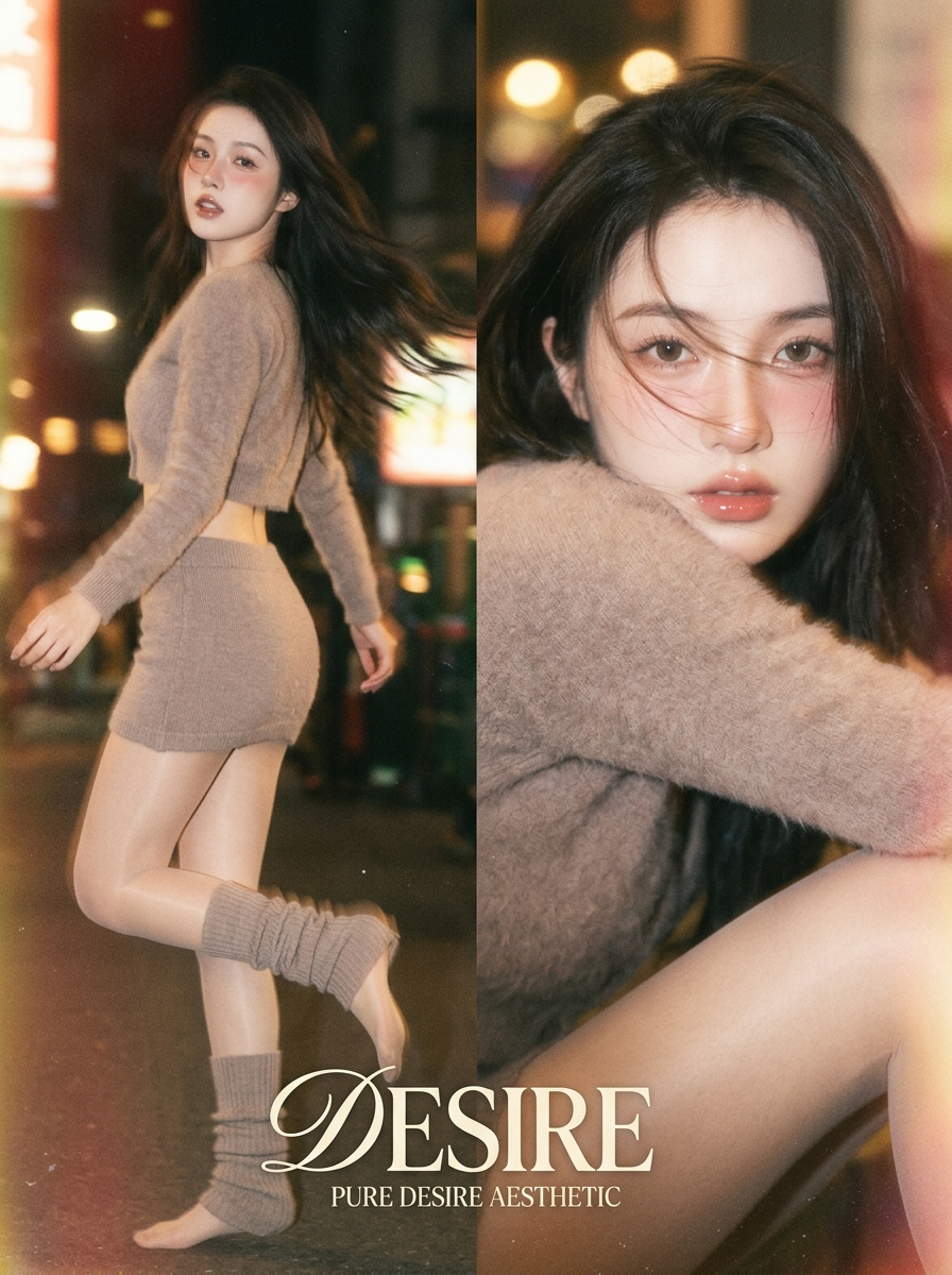 {"subject":{"description":"A dreamy, atmospheric vintage film poster featuring a sexy K-pop idol in a 'Pure Desire' aesthetic. The image captures a fleeting, intimate moment with heavy film grain and soft focus. The layout preserves the 2-pose split composition (full body left, close-up right).","age":"early 20s K-pop idol","expression":{"eyes":{"look":"hazy, seductive yet innocent","energy":"dreamy, 'pure desire' gaze","direction":"looking into the lens with a soft squint"},"mouth":{"position":"slightly parted, relaxed pout","energy":"soft, alluring"},"overall":"intimate, slightly melancholic, romantic"},"face":{"preserve_original":false,"makeup":"Pure Desire makeup: glossy glass lips, heavy drunk-blush on cheeks and nose tip, watery eyes, soft blurred eyebrows."},"hair":{"color":"natural or dark brown","style":"long, slightly messy waves","effect":"windblown, strands sticking to lip gloss, motion blur edges"},"body":{"frame":"curvy but slim, soft feminine lines","waist":"snatched waist visible through crop knit","legs":"highlighted by sheer tights","skin":{"tone":"pale, milky white","lighting_effect":"glowing highlights (halation) on skin due to diffusion filter, soft flash bounce"}},"pose":{"position":"two poses of the same model composited (Split Layout)","base":"relaxed, candid, dynamic motion","full_body_pose (left)":"Dynamic turning pose. She is walking away but turns her body back towards the camera. One leg is lifted slightly mid-step (highlighting leg curve). Her hair whips across her face with motion blur. The pose emphasizes the S-curve of the body.","closer_shot_pose (right)":"Intimate close-up. She is leaning forward towards the lens (foreshortening effect), chin resting on shoulder or hand near mouth. A sense of proximity, as if the camera is too close.","overall":"fluid, blurry, candid movement"},"clothing":{"top":{"type":"Fuzzy angora\/mohair cropped knit cardigan (buttoned only at the chest)","color":"soft taupe \/ dusty rose \/ cream","details":"soft texture that glows under the flash, exposing the midriff","effect":"tactile, warm, soft vs skin contrast"},"bottom":{"type":"Micro knit if(gender=f){mini skirt } + ultra-sheer pantyhose + slouchy leg warmers","color":"matching soft neutral tones","details":"the skirt is very short, emphasizing the long legs wrapped in sheer tights","effect":"sexy but cozy 'pure desire' style"}},"accessories":{"prop":"maybe a lollipop or blowing a small bubble gum (optional), or just playing with hair strands","jewelry":"delicate silver necklace glinting in the flash"}},"photography":{"camera_style":"vintage disposable camera aesthetic \/ 90s film editorial","shot_type":"split composition: dynamic full-body motion blur (left) + intimate soft-focus portrait (right)","texture":"heavy film grain, noise, soft bloom, light leaks","lighting":"on-camera flash but softened with a 'Pro-Mist' filter (creates blooming\/hazy highlights), vintage color grading","depth_of_field":"soft focus throughout, slightly out of focus for artistic effect","effects":"Motion blur from camera panning (shutter drag), halation around lights"},"background":{"setting":"Indistinct night scene or retro karaoke room","elements":["blurred bokeh lights in warm vintage tones (orange\/teal)","retro magazine typography overlay: 'DESIRE'","grainy textures"],"atmosphere":"nostalgic, hazy, romantic, intoxicated mood"},"the_vibe":{"energy":"soft, dreamy, blurry","mood":"sentimental, allure, vintage","aesthetic":"Hong Kong film style + K-pop Pure Desire + Retro Flash"}}