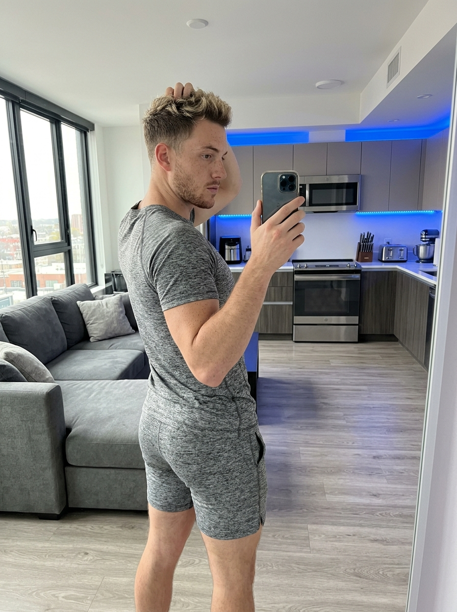 {"subject":{"description":"A young athletic male model with short, textured, blonde-highlighted hair is standing and looking over his left shoulder towards his right side, holding up a smartphone to take a mirror selfie. He has groomed skin, freckles, light stubble, and is wearing a grey marled two-piece workout set consisting of a fitted t-shirt and athletic shorts.","pose":"He is angled to the left, looking back over his shoulder at his phone in his right hand. His left hand is lifted and touching his hair at the back of his head. His body is turned slightly, showing his back and side profile. His posture is casual, upright, and confident.","clothing":{"top":"A grey marled fabric fitted t-shirt with a scoop back.","bottom":"Matching grey marled fabric athletic shorts.","accessories":"A smartphone in his right hand."}},"environment":{"location":"Modern apartment living room and kitchen area.","background_elements":{"living_room":"A large grey sectional sofa with pillows is positioned on the left.","kitchen":"In the background, there are upper and lower cabinets, a microwave, a stainless steel oven and stovetop, a toaster, a knife block, and a roll of paper towels. Blue LED strip lighting illuminates the underside of the upper cabinets.","windows":"Large windows on the left wall with frames, showing a daytime urban view outside."},"flooring":"Light wood-look laminate flooring."},"camera":{"shot_type":"Full-body mirror selfie photograph.","angle":"Eye-level, captured from the phone's reflection.","focus":"Sharp focus on the subject, with the background slightly less sharp but clearly .","framing":"The shot includes the full body of the model and a significant portion of the living room and kitchen."},"lighting":{"source":"Mixed lighting from natural daylight coming through the large windows on the left and artificial light from the kitchen, including blue LED strip lighting under the cabinets.","quality":"Bright and natural daylight mixed with warm interior lights and cool blue accent lighting."},"mood_and_expression":{"mood":"Casual, confident, relaxed.","expression":"Neutral, focused on the phone screen.","atmosphere":"Everyday, candid moment."},"style_and_realism":{"style":"Raw, unedited, realistic photo.","realism":"High fidelity, capturing skin texture, hair details, and fabric texture accurately. No filters or heavy retouching ."},"colors_and_tone":{"dominant_colors":"Grey, white, beige, natural skin tones, blue (from LED lights).","tone":"Neutral and balanced, with bright highlights from the windows and warmer tones from the interior."},"quality_and_technical_details":{"resolution":"High resolution.","sharpness":"Sharp image quality.","noise":"Minimal."},"aspect_ratio_and_output":{"aspect_ratio":"3:4 (portrait).","output_format":"JPEG"},"controlnet":{"pose_control":{"man_type":"OpenPose","purpose":"Exact skeletal and pose lock","constraints":["preserve shoulder width","preserve hip angle","preserve spine curvature","preserve limb placement"],"recommended_weight":0.95},"depth_control":{"man_type":"MiDaS","purpose":"Depth, volume, and camera-to-body spatial lock","constraints":["preserve chest foreground dominance if present","prevent flat or compressed depth","maintain clear -to-background separation"],"recommended_weight":0.8}},"negative_prompt":{"forbidden_elements":["anatomy normalization","body proportion averaging","smaller chest than reference","reduced chest volume","flattened or compressed chest","tightened, lifted, or artificially supported chest","slimmed ","aesthetic proportion correction","beauty standard enforcement","dataset-average model anatomy","camera angles that reduce volume","wide-angle distortion not in reference","lens compression not in reference","cropping that removes volume","depth flattening","mirror selfies","phone-in-hand selfies","reflections","beautification filters","skin smoothing","plastic skin","airbrushed texture","stylized realism","editorial fashion proportions","\u201cmore realistic\u201d reinterpretation","\u201cnaturalization\u201d of prominent features"]}}