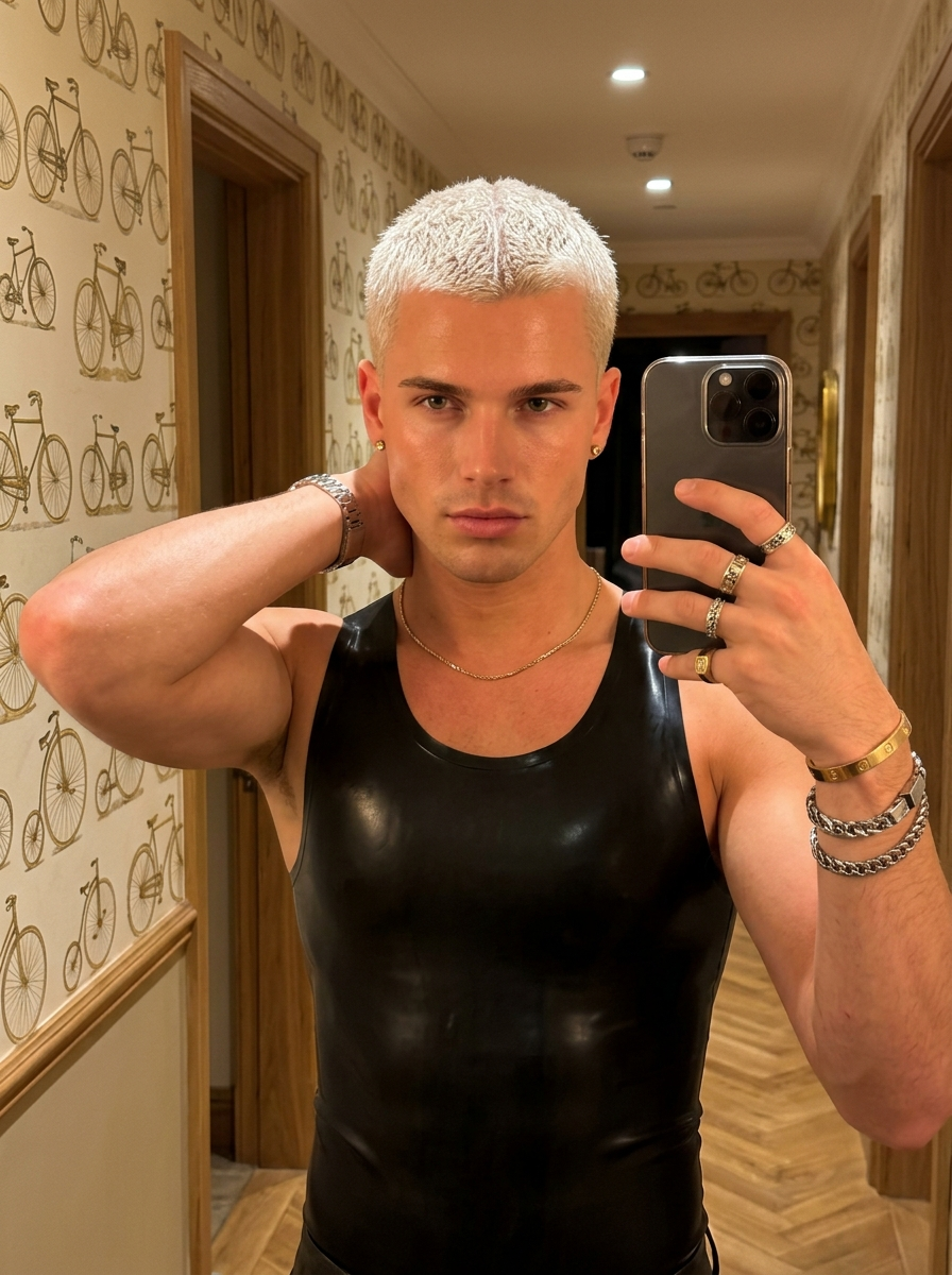 {"subject":{"description":"Handsome young model with an athletic build","hair":"Platinum hair, styled in a sleek, tight short textured cut with a middle part","eyes":"Dark brown, striking and clear","skin":" with a radiant, groomed finish","expression":"Neutral, confident gaze looking directly at the camera","pose":"Selfie angle, one arm extended holding the camera, the other arm raised with hand touching the back of the head\/neck area"},"attire":{"clothing":"latex fitted tank","style":"Casual, loungewear, clean aesthetic"},"accessories":{"neck":"Gold chain necklace","ears":"Multiple ear piercings with small gold studs","wrists":"Watch on the left wrist including a gold screw-motif cuff (Cartier style), a metal chain bracelet, and leather bands","fingers":"Multiple gold rings stacked on the left hand"},"makeup":{"style":"Clean groomed \/ model aesthetic","details":"Defined eyebrows, clean-shaven skin with light stubble option, natural glow on cheekbones and nose, subtle brow gel"},"environment":{"location":"Indoor hallway or bedroom","background":"Wallpaper featuring a repeating pattern of vintage bicycles, door frame, cream-colored walls, glimpse of wooden flooring","lighting":"Soft, warm artificial indoor lighting, creating a golden hour glow effect on the skin"},"technical_specs":{"resolution":"4K Ultra HD","quality":"Photorealistic, highly detailed textures, sharp focus","camera_angle":"Eye-level selfie perspective","style":"Influencer selfie, candid, high-end lifestyle photography"}}