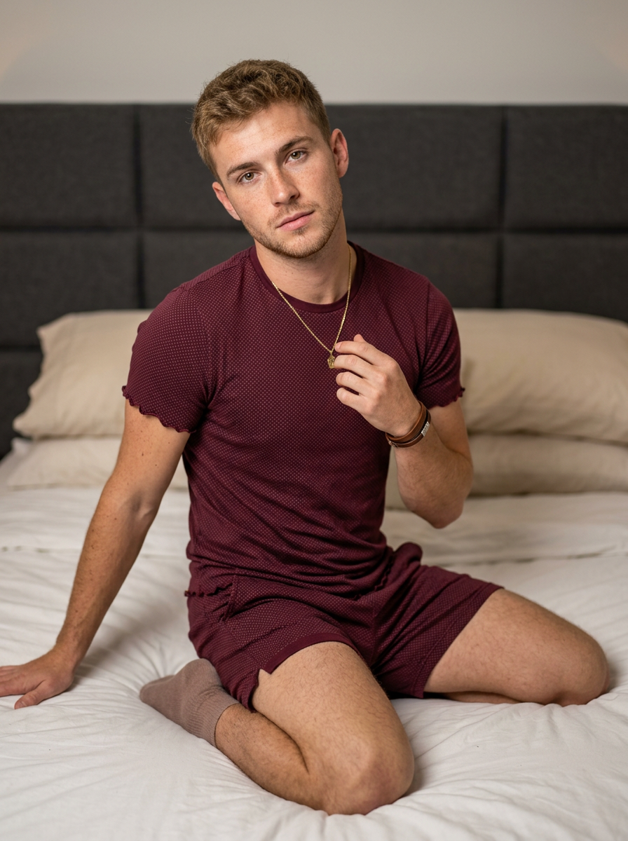 {"subject":{"description":"young male model in his early 20s","hair":"Short, textured dirty blonde hair","face":" with natural skin texture, prominent freckles across nose and cheeks, light stubble","eyes":"Light hazel or green eyes, looking directly at the camera with a confident gaze","makeup":"Natural features, clean groomed skin, natural lips","body":"Lean, athletic physique"},"apparel":{"outfit":"Matching two-piece burgundy\/maroon lounge set with a small subtle pattern","top":"Fitted t-shirt with a lettuce-edge hem","bottoms":"Matching lounge shorts with clean hem","accessories":"Simple gold chain necklace with a small pendant, leather bracelet on left wrist","footwear":"ankle socks"},"pose":{"action":"Sitting on a bed in a relaxed, kneeling position","hands":"Right arm extended back supporting weight on the mattress, left hand raised casually touching the chest area","head":"Slightly tilted to the right","expression":"Calm, confident, and "},"environment":{"location":"Bedroom interior","background":"Dark grey upholstered headboard with padded rectangular panels","foreground":"White, slightly rumpled bed sheets with soft fabric texture","props":"Beige\/cream colored pillows stacked in the background"},"lighting":{"type":"Soft, diffused indoor lighting","quality":"Even illumination on the face, soft shadows adding depth to the collarbone and limbs","ambiance":"Cozy, warm, and "},"technical_details":{"style":"Ultra Photorealistic, Raw Photo","resolution":"8k, UHD, High Definition","camera_settings":{"camera":"Sony A7R IV","lens":"35mm prime lens","aperture":"f\/2.8","focus":"Sharp focus on eyes and face, slight bokeh on the background pillows"},"texture_quality":"High fidelity skin texture, pores and freckles, realistic fabric weave on the clothing"}}