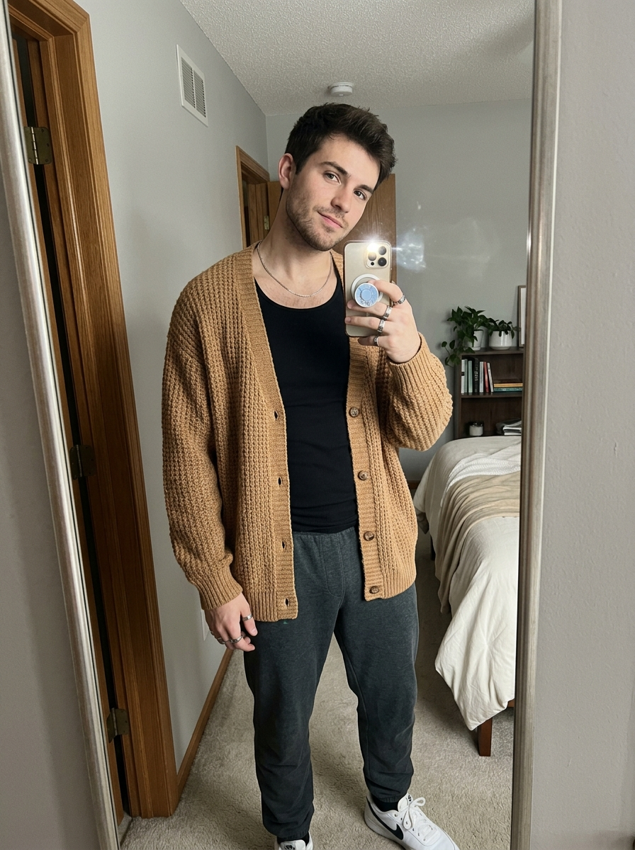 {"subject":{"description":"young model taking a mirror selfie","features":"short, styled hair, brown eyes, clean groomed skin with light stubble, tone","expression":"Slight confident smile, head cocked to the side, looking into the mirror\/phone"},"outfit":{"top":"tight-fitting fitted tank top","outerwear":"Oversized, chunky textured knit cardigan in camel\/light brown, worn casually open","style":"Cozy, casual, lounge aesthetic"},"accessories":{"jewelry":"simple silver chain necklace, small studs or none, multiple silver rings on fingers","nails":"short groomed nails"},"props":{"phone":"Smartphone (iPhone style) held in right hand","phone_case":"and patterned case featuring a large rectangular suction-cup attachment (Octobuddy style) on the back"},"environment":{"setting":"Indoor room, likely a bedroom or bathroom","background":"door frame, walls, mirror reflection showing the room behind","lighting":"Soft indoor lighting, flash reflection on the mirror"},"technical_details":{"style":"Photorealistic, mirror selfie angle, social media aesthetic, high resolution, 8k","ratio":"5:6","camera_angle":"Eye-level mirror shot, portrait orientation"}}