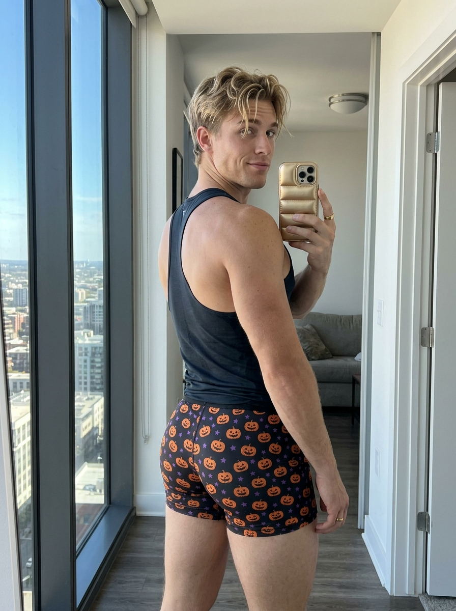 {"subject":{"description":"young model with a fit physique taking a mirror selfie","hair":"short hair styled in a messy quiff with loose strands and textured bangs framing the face","clothing":"racerback fitted athletic top, tight athletic shorts with a Halloween pattern featuring orange jack-o'-lantern pumpkins and small purple stars","physique":"Athletic and muscular build, prominent glutes, narrow waist, back musculature, toned","accessories":"Gold ring on right hand","phone":"Gold or champagne-colored iPhone with a textured, puffy 'puffer' style case held in the right hand"},"pose":{"stance":"Standing with back towards the mirror, twisted slightly to the left","head_orientation":"Head turned over the left shoulder, looking directly into the mirror\/camera","limbs":"Right arm raised holding the phone, left arm down by side, legs standing straight with weight slightly shifted","focus":"Emphasis on the posterior view and profile curve"},"environment":{"setting":"Modern apartment interior seen through a mirror reflection","details":"Large floor-to-ceiling window on the left a city skyline and blue sky, door frame on the right, glimpse of a living area in the background with a couch and ceiling light","surface":"Clean mirror surface reflecting the subject and room"},"camera":{"shot_type":"Mirror selfie, medium shot capturing from knees to top of head","perspective":"Reflection view, camera positioned at shoulder height","focal_length":"26mm equivalent (smartphone main camera)","depth_of_field":"Deep depth of field, background slightly softer but "},"lighting":{"source":"Strong natural daylight entering from the large window on the left, mixed with soft indoor ambient lighting","characteristics":"Directional side lighting creating highlights on the left arm, hair, and profile, casting soft shadows on the right side of the back and legs","quality":"Realistic, high-contrast daylight balance"},"mood_and_expression":{"emotion":"Confident, intense, casual","facial_expression":"Neutral to slight smirk, focused gaze on the phone screen\/mirror reflection","atmosphere":"Casual lifestyle, influencer aesthetic, morning or afternoon vibe"},"style_and_realism":{"aesthetic":"Raw smartphone photography, unpolished social media snapshot","rendering":"Photorealistic, 8k resolution, texture-rich","details":" skin texture with light stubble, natural fabric folds in clothing, realistic light falloff"},"colors_and_tone":{"palette":"Natural skin tones (tan), deep blacks (clothing), bright oranges (pumpkins), cool whites and blues (background\/window)","contrast":"Medium-high contrast due to window light","saturation":"Natural to slightly vibrant"},"quality_and_technical_details":{"resolution":"Best quality, ultra-detailed","sharpness":"Sharp focus on the subject, no motion blur","noise":"Subtle digital noise characteristic of smartphone sensors"},"aspect_ratio_and_output":{"ratio":"3:4","framing":"Vertical portrait orientation"},"controlnet":{"pose_control":{"man_type":"DWPose","purpose":"Exact skeletal and pose lock","constraints":["preserve shoulder width","preserve hip angle","preserve spine curvature","preserve limb placement"],"recommended_weight":1},"depth_control":{"man_type":"ZoeDepth","purpose":"Depth, volume, and camera-to-body spatial lock","constraints":["preserve glute foreground dominance","prevent flat or compressed depth","maintain clear -to-background separation"],"recommended_weight":0.8}},"negative_prompt":{"forbidden_elements":["anatomy normalization","body proportion averaging","reduced glute volume","flattened glutes","slimmed ","aesthetic proportion correction","beauty standard enforcement","dataset-average model anatomy","camera angles that reduce volume","wide-angle distortion not in reference","cropping that removes volume","depth flattening","beautification filters","skin smoothing","plastic skin","airbrushed texture","stylized realism","cartoonish","sketch","painting","blur","low quality","distorted hands","missing phone"]}}