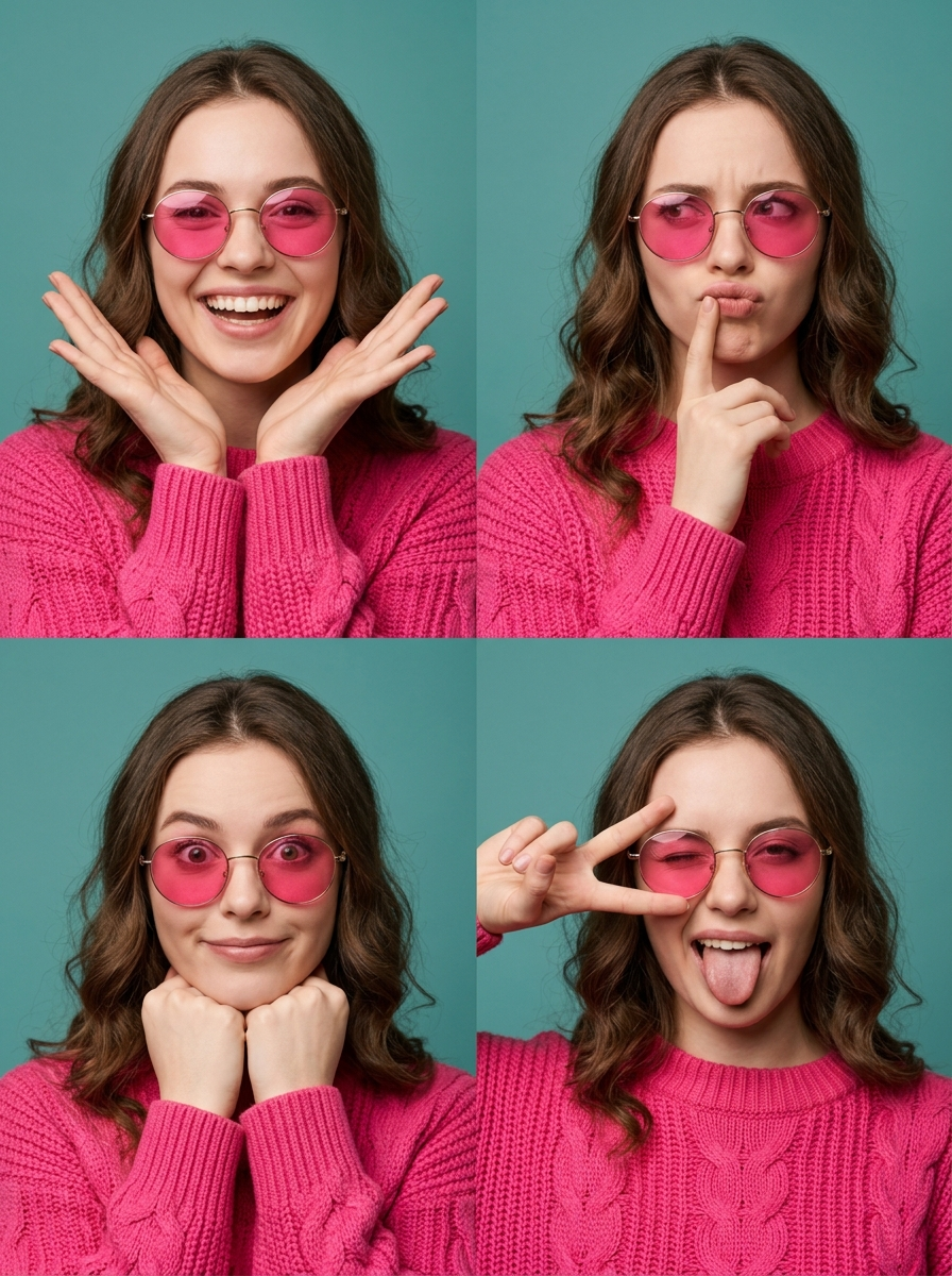 {"subject":{"identity":"Young model with wavy brunette hair and fair skin","features":"Heart-shaped face, soft facial structure, light brown eyes","attire":"Hot pink chunky cable-knit sweater with ribbed crew neck","accessories":"Thin gold-rimmed round sunglasses with vibrant pink tinted lenses"},"layout":{"type":"2x2 photo collage","total_panels":4,"panels":[{"panel_id":1,"expression":"Wide joyful smile, teeth showing","pose":"Hands framing the face, palms facing forward"},{"panel_id":2,"expression":"Thinking or playful expression","pose":"One finger resting against the lip"},{"panel_id":3,"expression":"Playful wide-eyed surprise, slight smirk","pose":"Fists tucked under the chin"},{"panel_id":4,"expression":"Silly, one eye winking with sticking out","pose":"Hand making a peace sign over one eye"}]},"environment":{"background":"Solid teal or muted turquoise studio wall","lighting":"Soft, even studio lighting with minimal shadows"},"aesthetic":{"style":"High-fashion editorial portrait, vibrant color blocking","color_palette":["Hot Pink","Teal","Gold"],"mood":"Playful, energetic, youthful"}}