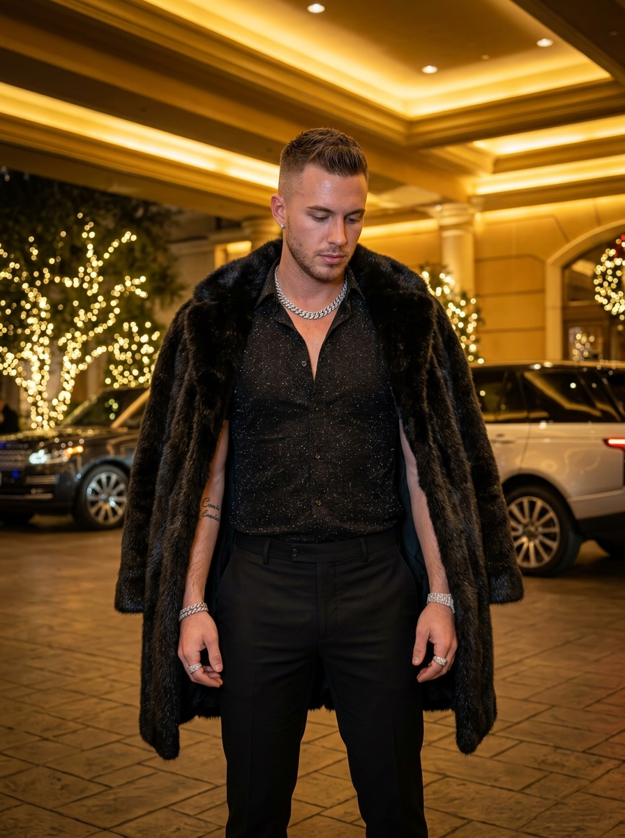 {"subject":{"type":"human","gender_presentation":"model","age_range":"mid 20s to early 30s","pose":"standing with elegant confident posture","expression":"composed, confident, striking","gaze":"looking downward","body_visibility":"full body","tattoos":{"location":"upper arm","style":"cursive script","visibility":"clearly "}},"appearance":{"skin_texture":"ultra-detailed, natural, flawless","hair":{"length":"short","style":"textured styled hair swept to one side"},"grooming":"clean natural look, natural features, groomed skin, light stubble","complexion":"natural features, flawless finish","lips":" matte"},"outfit":{"dress":{"type":"fitted shirt and trousers","fit":"fitted","material":"glitter fabric"},"outerwear":{"type":"fur coat","wear_style":"draped over shoulders"},"accessories":{"jewelry":[{"type":"chain","material":"diamond","style":"statement"},{"type":"small studs or none","material":"diamond","style":"matching"},{"type":"bracelet","material":"diamond"},{"type":"ring","material":"diamond"}],"minimal accessories":{"type":"minimal accessories","size":"small","carry_style":"none"}}},"environment":{"setting":"luxury casino hotel exterior","time_of_day":"night","architecture":{"style":"luxury","composition":"symmetrical","lighting":"warm golden illumination"},"background_elements":["festive decorative trees with lights","luxury SUVs parked behind subject","city lights creating bokeh effect"]},"lighting":{"type":"cinematic night lighting","quality":"soft and balanced","highlights":"warm golden tones","shadows":"controlled, minimal harshness"},"camera":{"camera_type":"full-frame DSLR","lens":"85mm","aperture":"f\/1.8","iso":200,"shutter_speed":"1\/200s","shot_style":"fashion editorial portrait","depth_of_field":"shallow","focus":"sharp focus on subject"},"composition":{"framing":"full-body portrait","angle":"eye-level","background_blur":"strong bokeh","subject_placement":"centered"},"style":{"aesthetic":"luxury lifestyle, high-end fashion editorial","photorealism":"ultra-realistic","cinematic_quality":"high","magazine_quality":"fashion cover level"},"color_palette":{"primary_colors":["black","white","warm gold"],"accent_colors":["silver","natural skin tones"]},"quality":{"resolution":"8k","detail_level":"ultra-high","dynamic_range":"high","realism":"photographic"},"generation_parameters":{"man_recommendation":["SDXL","Realistic Vision","High-fashion photorealism mans"],"seed":"random","guidance_scale":7.5,"steps":30}}