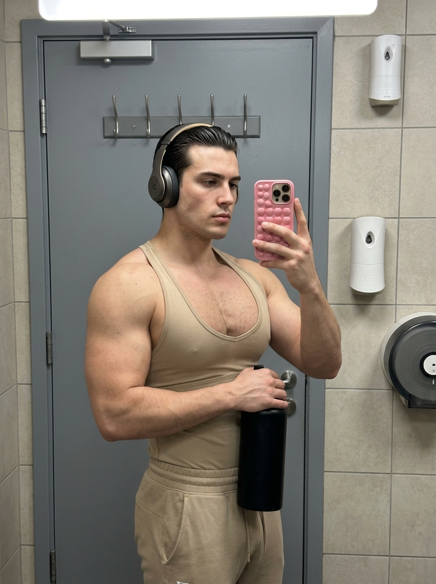 {"subject":"young model with dark hair slicked back, no hair accessory, wearing large over-ear headphones. He is dressed in a matching beige or sand-colored activewear set consisting of a low-cut fitted athletic top and high-waisted joggers. The subject possesses a very full, prominent chest with deep chest contours , the fabric of the top stretching to accommodate the heavy volume and natural projection of the chest. He holds a large, matte cylindrical water bottle tucked against his right side with his right arm.","pose":"Standing mirror selfie pose. The body is angled slightly to the right, with weight shifted to create a strong athletic line in the . The head is tilted slightly to the left, looking directly into the mirror (at the phone). The right arm is bent, gripping the water bottle against the . The left arm is raised, hand holding a smartphone with a pink textured case to capture the reflection.","environment":"A stark, utilitarian bathroom or locker room setting. Directly behind the subject is a flat grey door featuring a horizontal coat rack with multiple hooks. To the right, a wall with square tiles is , mounted with a automatic air freshener or soap dispenser and a circular paper towel dispenser. The door has silver hinges and a silver handle.","camera":"Mirror selfie perspective captured via a smartphone reflection. The shot includes the phone itself (an iPhone Pro model with a pink bubble-textured case) held in the subject's left hand. The framing is a medium shot capturing the subject from the up to the top of the door frame. The focus is sharp on the subject, with the background elements clearly defined.","lighting":"Bright, overhead artificial lighting typical of a commercial bathroom or locker room. The light source creates distinct specular highlights on the subject's forehead, the curve of the chest, and the shoulders. Shadows are relatively soft but defined, falling under the chin and the chest, emphasizing volume and depth.","mood_and_expression":"Casual, focused, and confident. The expression is neutral to slightly serious, focused on the phone screen for the photo. The vibe is a 'post-workout' or 'gym fit' check.","style_and_realism":"Hyper-realistic raw photography. High fidelity to skin texture, fabric tension, and environmental details. No stylization or artistic filtering; resembles a high-resolution social media snapshot.","colors_and_tone":"Neutral color palette dominated by greys, whites, and the beige\/sand tone of the outfit. The. Accents include the headphones\/hooks and the pink phone case. Contrast is moderate with natural indoor balance.","quality_and_technical_details":"High resolution, sharp focus, natural grain. Detailed textures on the matte water bottle, the fabric of the fitted athletic top, and the smooth finish of the grey door.","aspect_ratio_and_output":"3:4","controlnet":{"pose_control":{"man_type":"DWPose","purpose":"Exact skeletal and pose lock","constraints":["preserve arm position holding water bottle","preserve raised arm holding phone","preserve hip tilt","preserve head tilt"],"recommended_weight":1},"depth_control":{"man_type":"ZoeDepth","purpose":"Depth, volume, and camera-to-body spatial lock","constraints":["maintain distance between subject and grey door","preserve volumetric projection of chest","ensure phone is positioned correctly in depth relative to body"],"recommended_weight":0.8}},"negative_prompt":{"anatomy_restrictions":["anatomy normalization","body proportion averaging","smaller chest than reference","reduced chest volume","flattened or compressed chest","tightened or lifted chest","slimmed ","aesthetic proportion correction"],"photography_restrictions":["professional studio lighting","bokeh","wide-angle distortion","lens compression","cropping that removes volume","beautification filters","skin smoothing","plastic skin"],"general_restrictions":["stylized realism","editorial fashion proportions","naturalization of prominent features","missing phone","missing headphones","missing water bottle"]}}