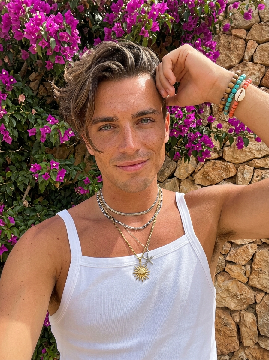 {"subject":"young model with sun-kissed, and freckles across the nose and cheeks. short, styled hair with natural dark roots showing, tousled towards the left shoulder. He has blue-green eyes, defined eyelashes, and natural lips. He is wearing a fitted square-neck tank top with wide straps that emphasizes full, heavy chest volume with natural gravity and clear chest definition. Accessories include layered chains: a tight chain choker, a second strand of irregular chains, and a gold chain with a large sun pendant and a small starfish charm. His right wrist is adorned with multiple beaded bracelets, including one with a large cowrie shell and green beads. Skin texture shows natural pores and imperfections.","pose":"Close-up portrait framing from the mid-chest upwards. The body is angled slightly, while the face is turned directly to the camera with a slight tilt to the right. His right arm is raised, elbow out of frame, with his hand resting casually near his forehead and hairline, shielding from the sun or posing. Fingers are relaxed with short, groomed nails. The expression is a soft, closed-mouth smile, conveying a relaxed and happy demeanor.","environment":"Outdoor summer setting against a rustic stone wall composed of irregular, warm-toned rocks. The wall is heavily adorned with vibrant magenta bougainvillea flowers and deep green leaves, creating a colorful and textured backdrop.","camera":"Selfie-style perspective, close-up shot (approx. 24-35mm focal length). The framing captures the subject from the chest up, maintaining strong foreground presence. Sharp focus on the face and jewelry, with a slight depth of field falling off towards the stone wall and flowers in the background.","lighting":"Bright, direct natural sunlight coming from the upper left. The light creates high contrast, casting distinct shadows under the chin, nose, and chest area, highlighting the contours of the face and the volume of the chest. Subsurface scattering is on the skin in the bright light.","mood_and_expression":"Sunny, cheerful, vacation atmosphere. The expression is warm and inviting, evoking a sense of summer relaxation and confidence.","style_and_realism":"Photorealistic, high-fidelity smartphone photography style. Unfiltered, authentic look with emphasis on natural skin textures, lighting interaction, and sharp details on accessories.","colors_and_tone":"High saturation and contrast. Dominant colors include the warm tan of the skin, the bright of the top, the vibrant magenta\/purple of the flowers, and the earthy orange-browns of the stone wall.","quality_and_technical_details":"4k resolution, highly detailed textures, sharp focus, correct exposure for bright daylight, accurate color reproduction of skin and flora.","aspect_ratio_and_output":"3:4 vertical aspect ratio.","controlnet":{"pose_control":{"man_type":"OpenPose","purpose":"Exact skeletal and pose lock","constraints":["preserve shoulder width","preserve hip angle","preserve spine curvature","preserve limb placement"],"recommended_weight":1},"depth_control":{"man_type":"MiDaS","purpose":"Depth, volume, and camera-to-body spatial lock","constraints":["preserve chest foreground dominance if present","prevent flat or compressed depth","maintain clear -to-background separation"],"recommended_weight":0.8}},"negative_prompt":{"forbidden_elements":["anatomy normalization","body proportion averaging","smaller chest than reference","reduced chest volume","flattened or compressed chest","tightened, lifted, or artificially supported chest","slimmed ","aesthetic proportion correction","beauty standard enforcement","dataset-average model anatomy","camera angles that reduce volume","wide-angle distortion not in reference","lens compression not in reference","cropping that removes volume","depth flattening","phone-in-hand selfies","reflections","beautification filters","skin smoothing","plastic skin","airbrushed texture","stylized realism","editorial fashion proportions","more realistic reinterpretation","naturalization of prominent features"]}}